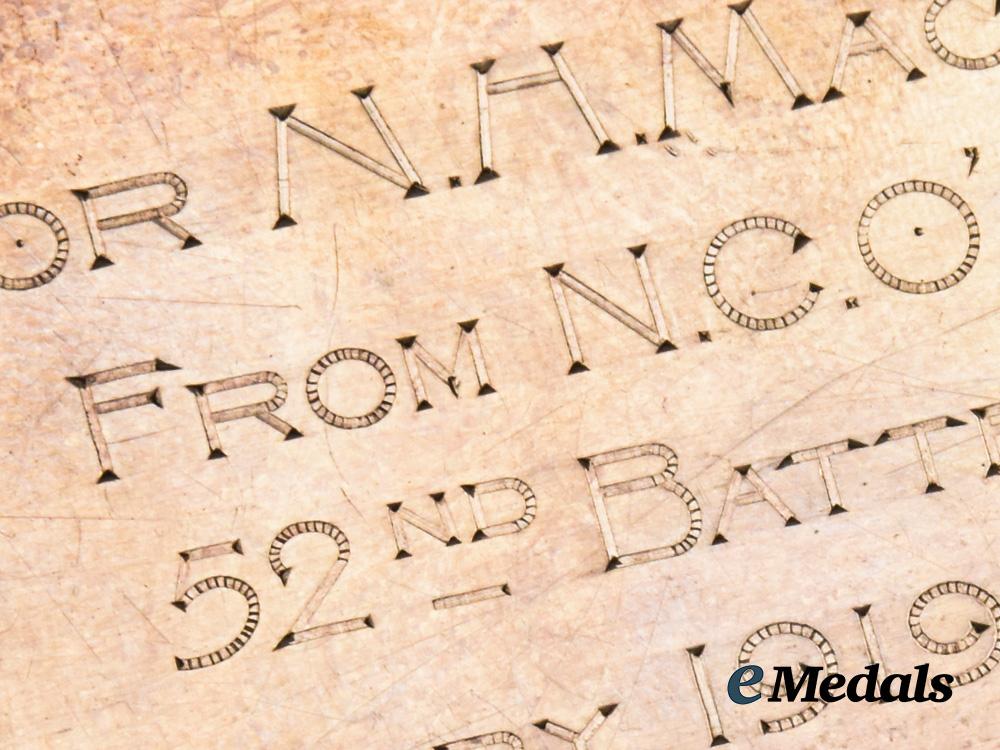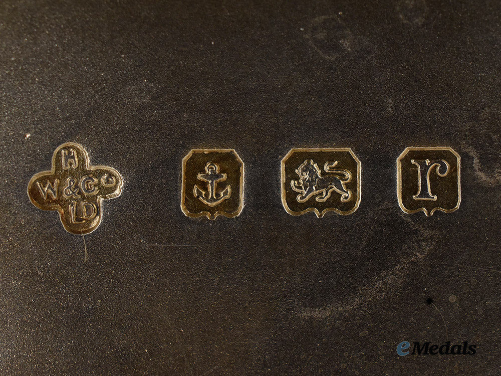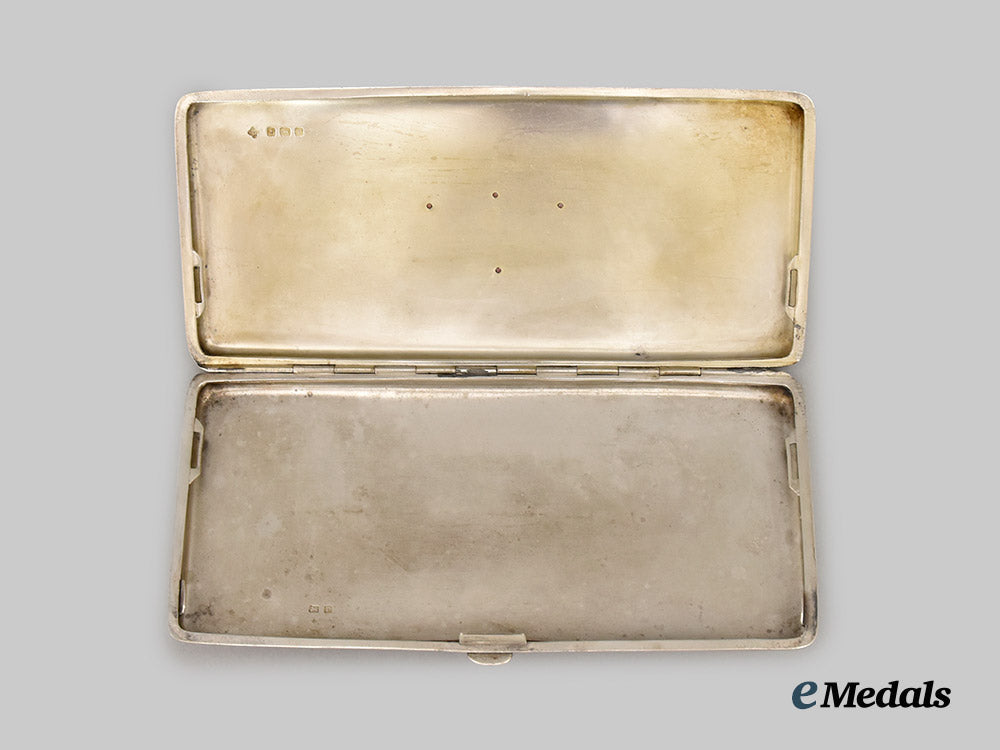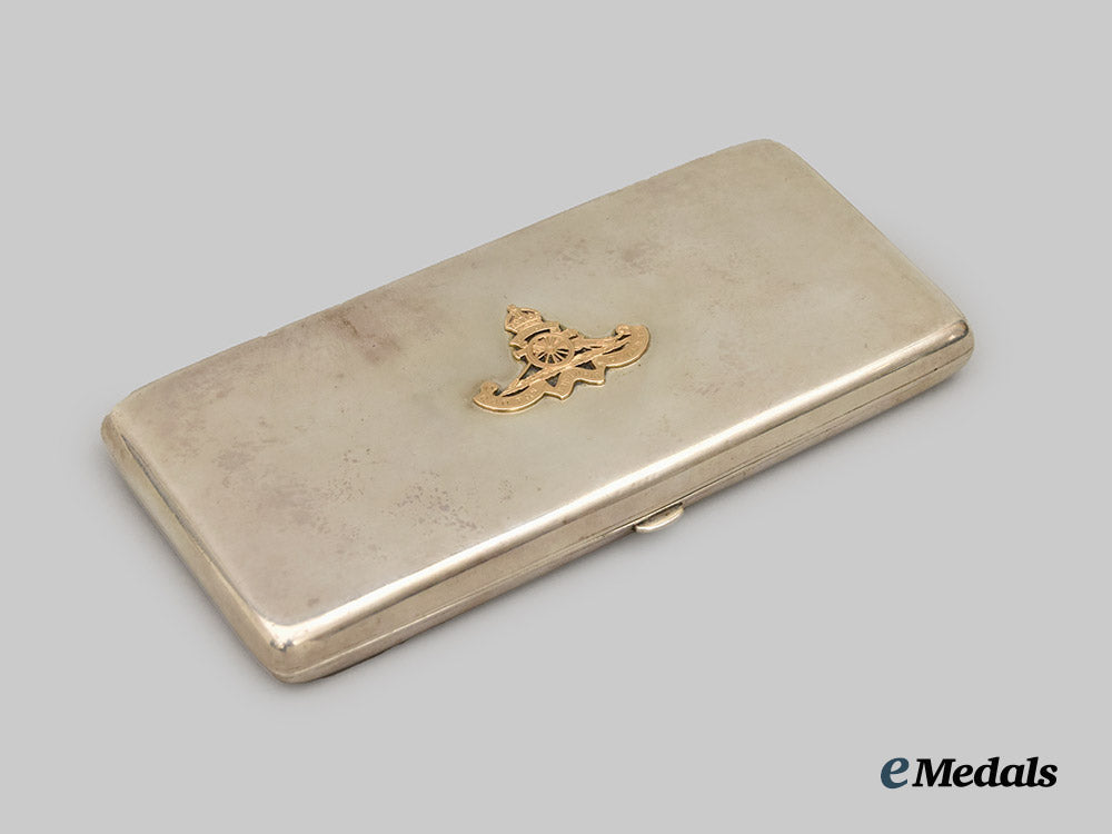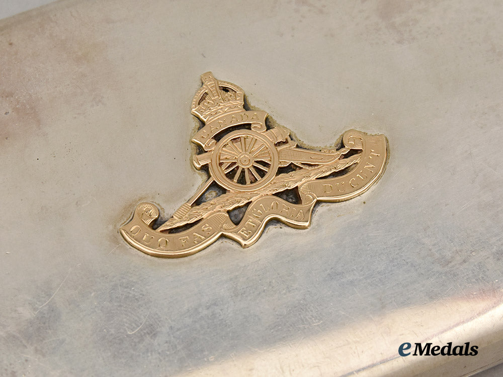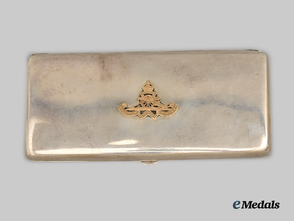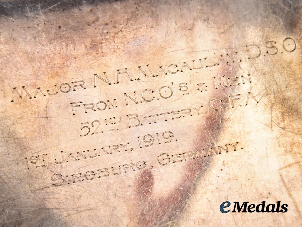 Case in sterling silver with an insignia in Gold placed upon the lid, maker marked "H W & Co Ld" (Horace Woodward and Company Limited of Birmingham), marked with the British lion, an anchor (made in Birmingham) and date marked "r" (1916) on the inside of the lid, engraved Canadian Field Artillery in Gold affixed to the outside of the lid via four pins, engraved "MAJOR N.H. MACAULAY, D.S.O / FROM N.C.O's & MEN / 52nd BATTERY. C.F.A / 1st JANUARY, 1919. / SIEGBERG, GERMANY." on the exterior of the base, both inside lids incorporating integral slots on both sides on the lips where an elastic band to secure the cigarettes once resided, measuring 175 mm in length x 82.3 mm in width x 21 mm in depth, multiple contact marks and scratches evident on the exterior, better than very fine.