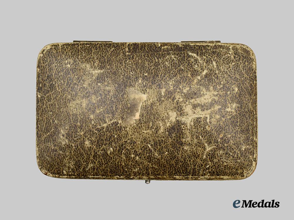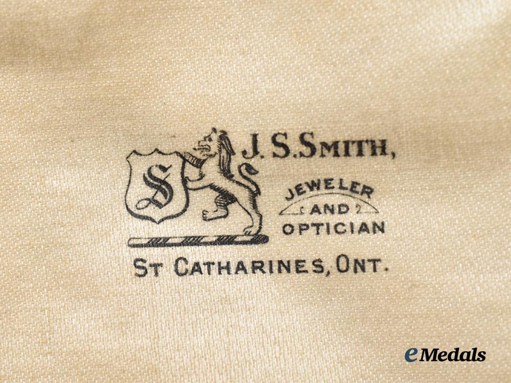 Contained in a jewellers case, exterior in a textured brown leatherette, interior lid marked J.S SMITH JEWELER AND OPTICIAN ST. CATHERINES, ONT., with a velvet medalbed, functional clasp, measures 119.5mm (w) x 77.5 mm (h) x 24.5 mm (d), heavy wear on exterior, in better than fine condition.