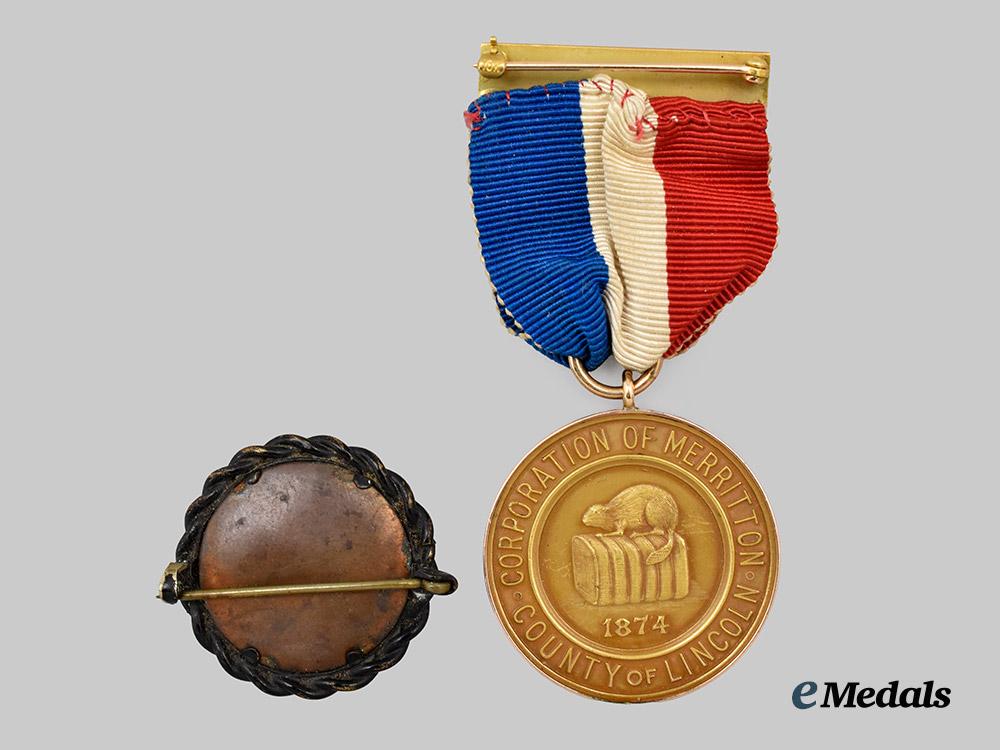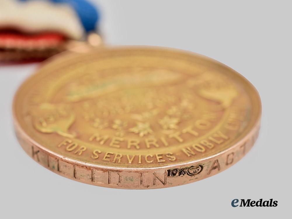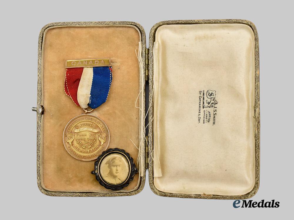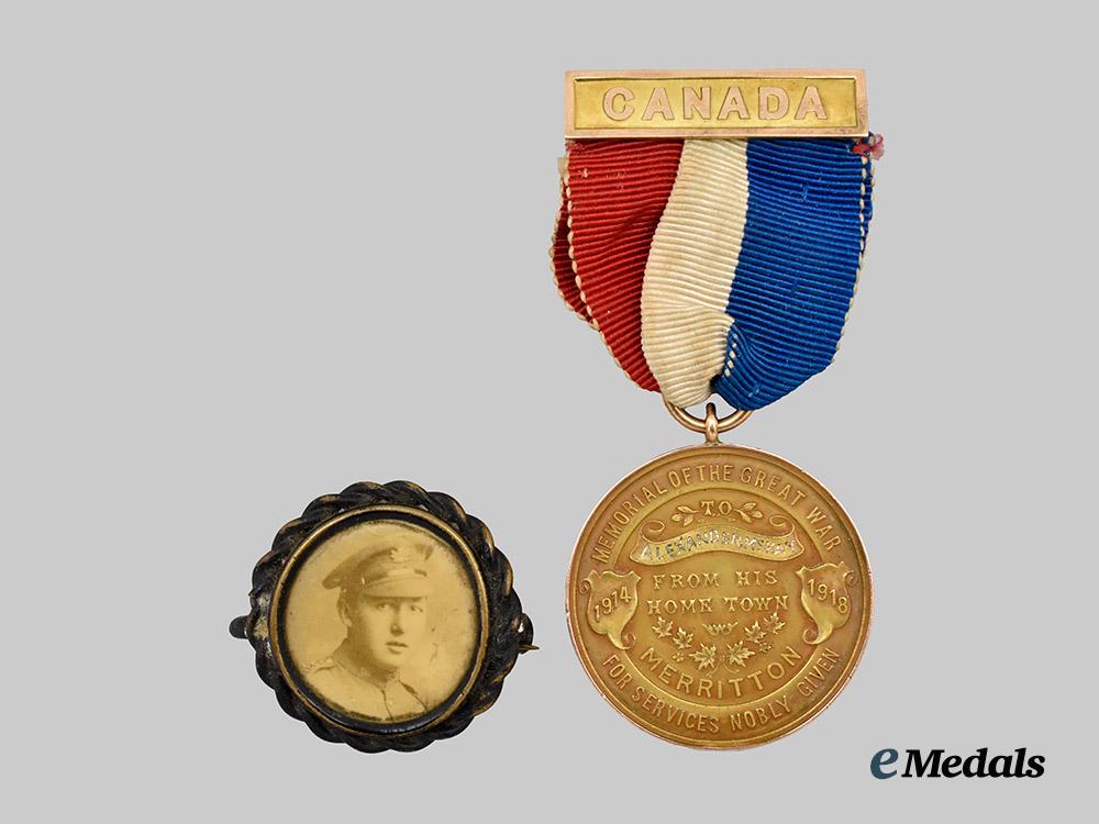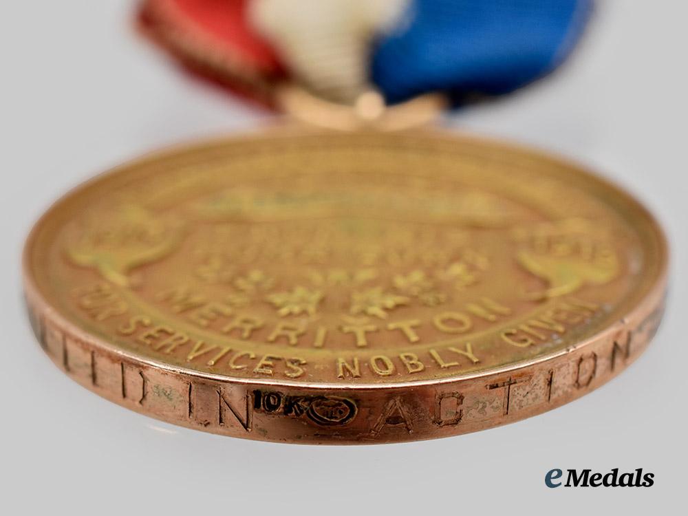 In 10K Gold, the obverse featuring the inscription MEMORIAL OF THE GREAT WAR TO ALEXANDER MCKAY FROM HIS HOME TOWN MERRITTON FOR SERVICES NOBLY GIVEN 1914-1918, the reverse featuring a beaver sitting on a chest with the date 1874 below, encircled by the inscription CORPORATION OF MERRITON COUNTY OF LINCOLN, the rim has been engraved KILLED IN ACTION, rim impressed 10K, worn on ribbon with a Gold 10K CANADA bar with horizontal pin on the reverse, measures 31.7 mm (w) x 35.7 mm (h - inclusive of integral ring), weighs 17.96 grams, light wear, in extremely fine condition.