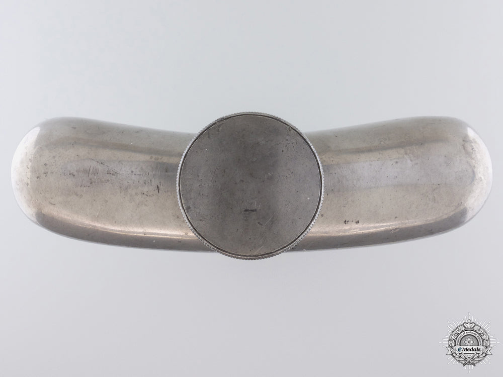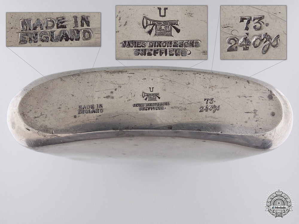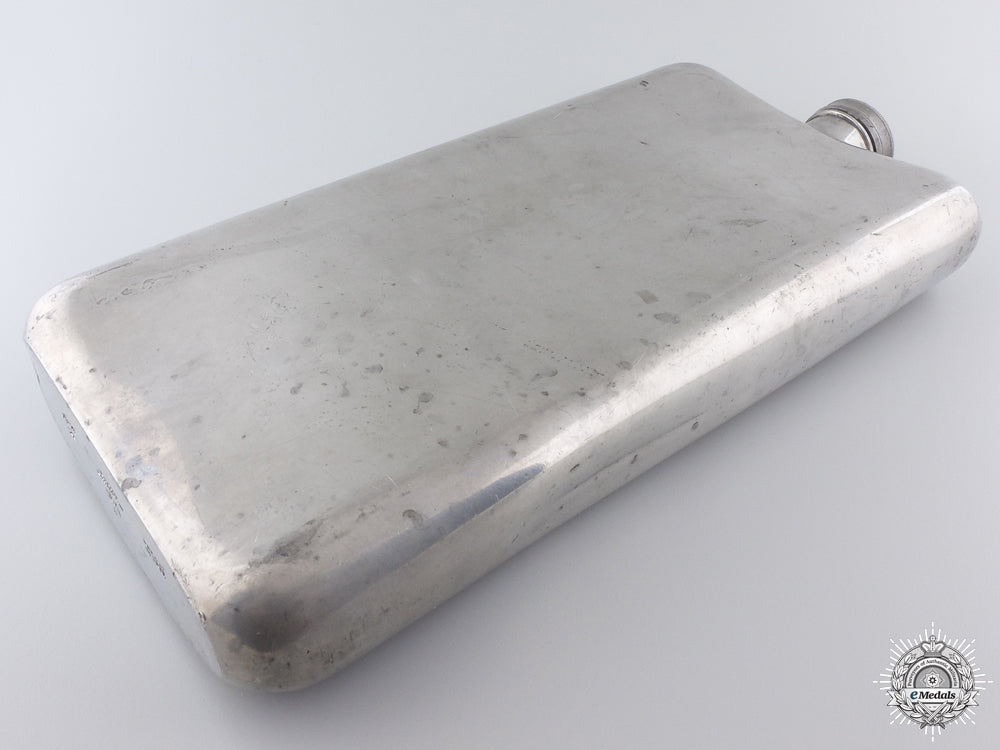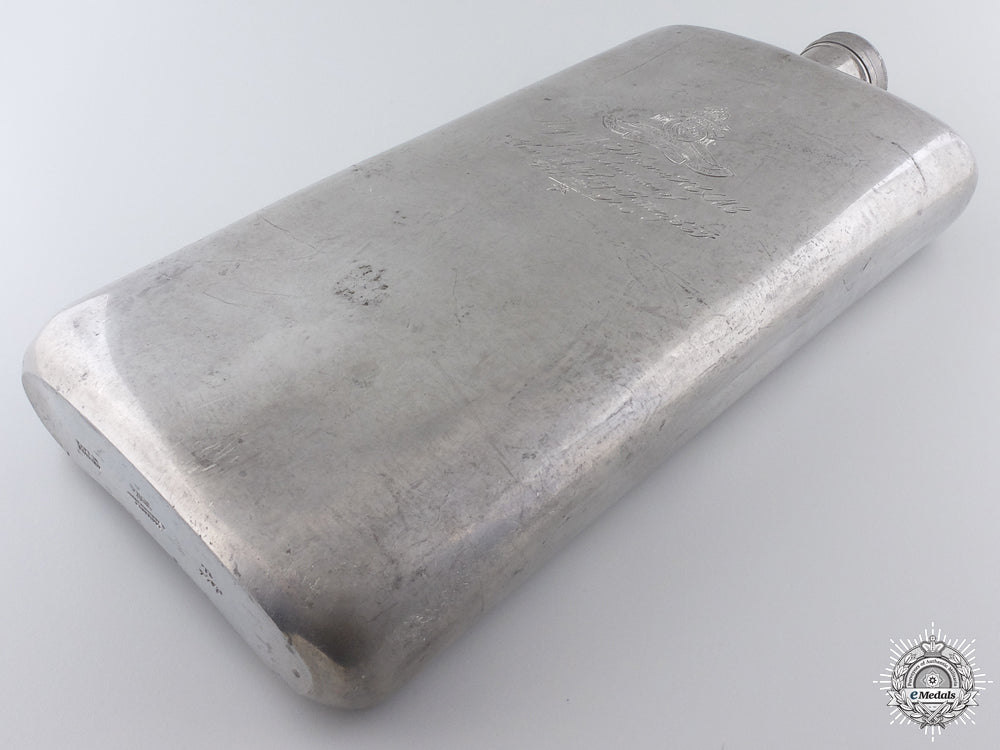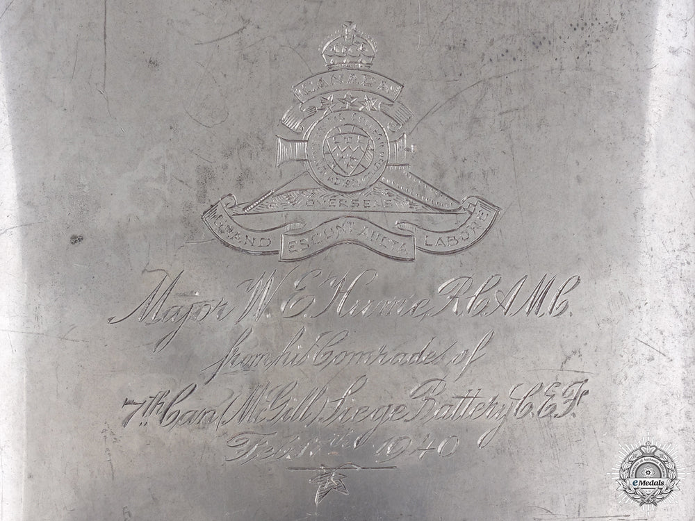 A Flask to the 7th Canadian (McGill) Siege Battery CEF - Plated, weighing 529 grams, marked "MADE IN ENGLAND", maker marked "JAMES DIXON & SONS SHEFFIELD", marked with a "U" over a left-facing trumpet and banner insignia identifying production by Dixon (a fundamental element to prevent mistakes with the marks "JC & S" used by another Sheffield manufacture, James Deakin & Sons) and marked "73" over "24ozs" on the bottom, engraved with the 7th Canadian (McGill) Siege Battery insignia above the inscription "Major W.E. Hume . R.C.A.M.C. / from his comrades of / 7th Can. (McGill). Siege Battery C.E.F. / Feb. 17th 1940" in running script on the front, cork liner on the underside of the screw cap, 115 mm x 245 mm x 34 mm, contact marks and dents from active use, very fine Footnote: William Edward Hume was born on October 24, 1897 in Leeds, Megantic County, Quebec. He was a resident of Montreal, Quebec, when he signed his Attestation Paper as a Cadet (1261649) with No. 6 (McGill) Overseas Battery, Siege Artillery, CEF, on May 6, 1916 in Montreal, at the age of 18, naming his next-of-kin as his father, Dr. G.S. Hume of Sherbrooke, Quebec, stating that he belonged to an Active Militia (the 22nd Sherbrooke Battery), that he had previous military service (one month with the 53rd Sherbrooke Regiment and two months with the 22nd Sherbrooke Battery), that he was not married and that his trade was that of Student. The 6th Canadian Siege Battery recruited in the Montreal area in 1916 and were re-named the 7th Canadian Siege Battery when they re-organized in England. Hume later rose to the rank of Major with the Royal Canadian Army Medical Corps. In early 1940, his former comrades from the 7th Canadian (McGill) Siege Battery recognized his accomplishments by giving him this flask. By 1941, he had attained the rank of Colonel and was awarded the Efficiency Decoration. Hume was awarded the Officer of the Military Division of the Order of the British Empire effective March 17, 1945, as mentioned in the Supplement to the London Gazette 37038 of Tuesday, April 17, 1945, on Thursday, April 19, 1945, page 2063.