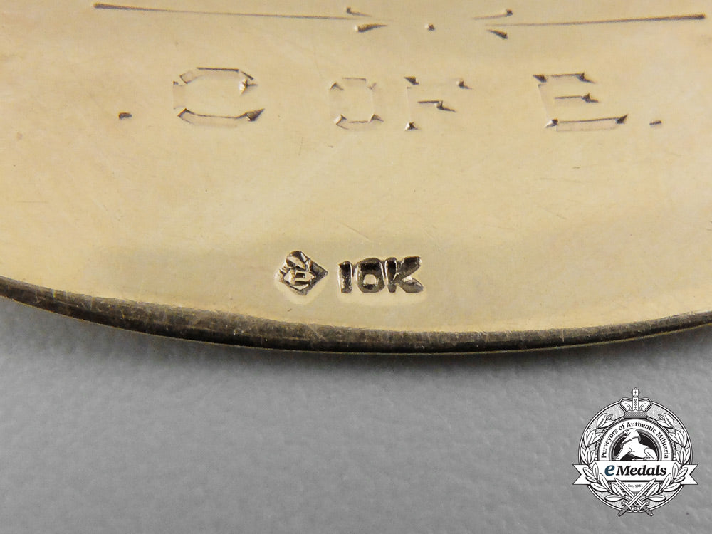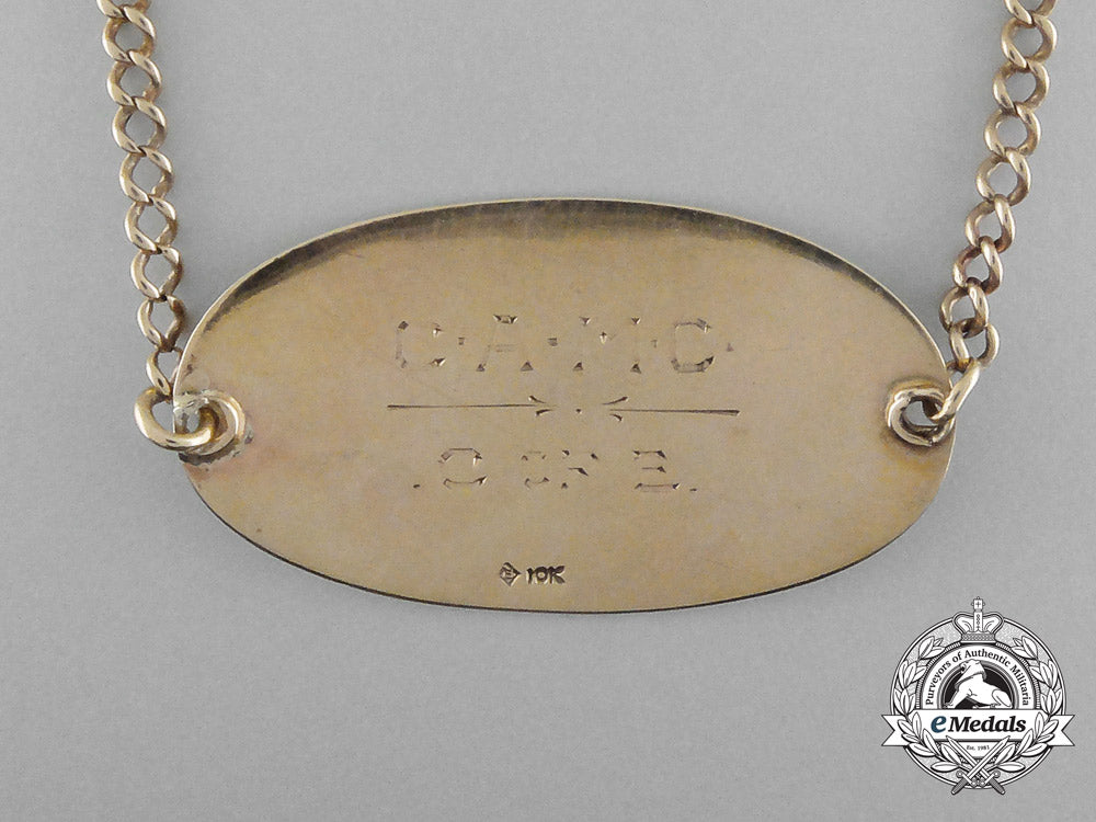Canadian Army Medical Corps; 10K Gold, weighing 7.0 grams inclusive of its chain, maker marked and marked "10K" (Gold) on the reverse, obverse engraved in large capitals "EDITH. M. YORK. N.S." above the Canadian Medical Corps insignia, reverse engraved in capitals "C.A.M.C. / C OF E.", 23.8 mm x 42.5 mm, on a full-length wrist chain with sliding closure on the ring, very light contact, extremely fine.