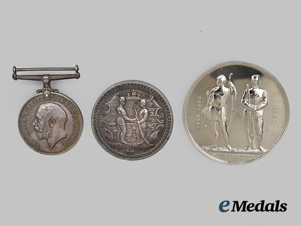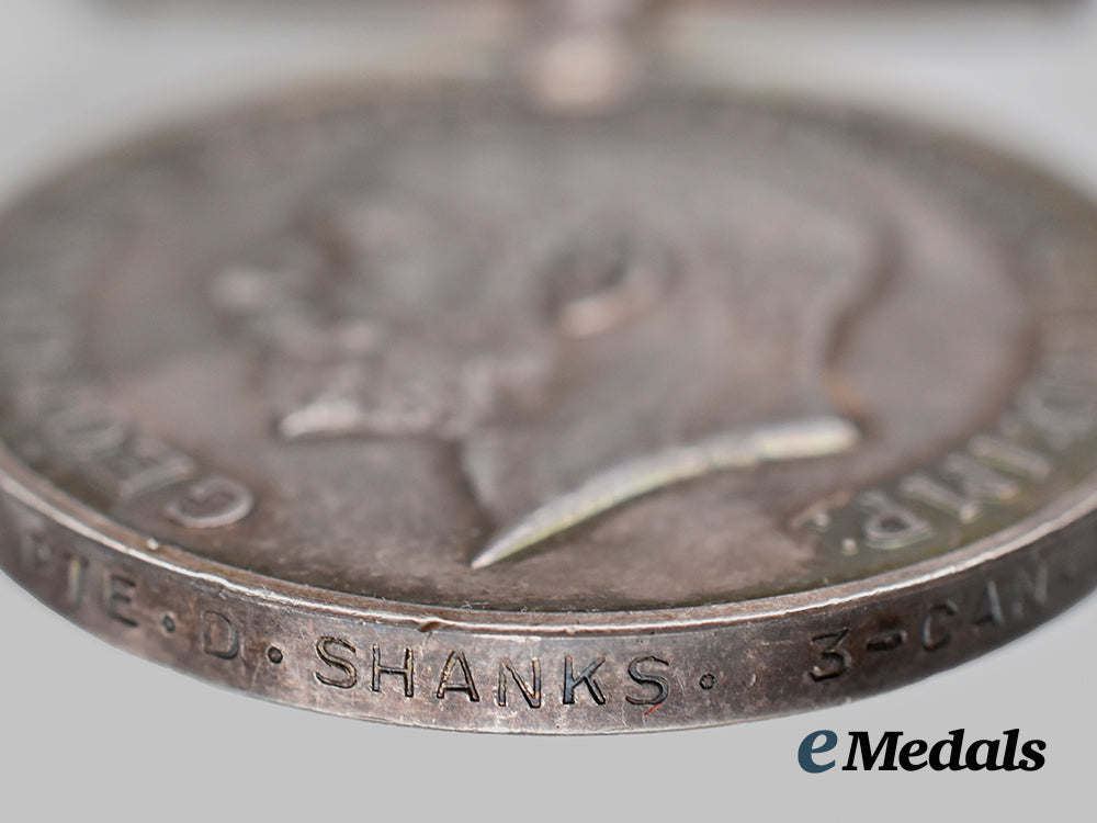 1. British War Medal 1914-1918, (9718 PTE. D. SHANKS. 3-CAN. INF.), obverse shows King George V facing left, reverse shows Saint George naked on horseback and armed with a short sword, inclusive of bar suspension 50.5 mm (h) x 36.3 mm (w), very fine condition.