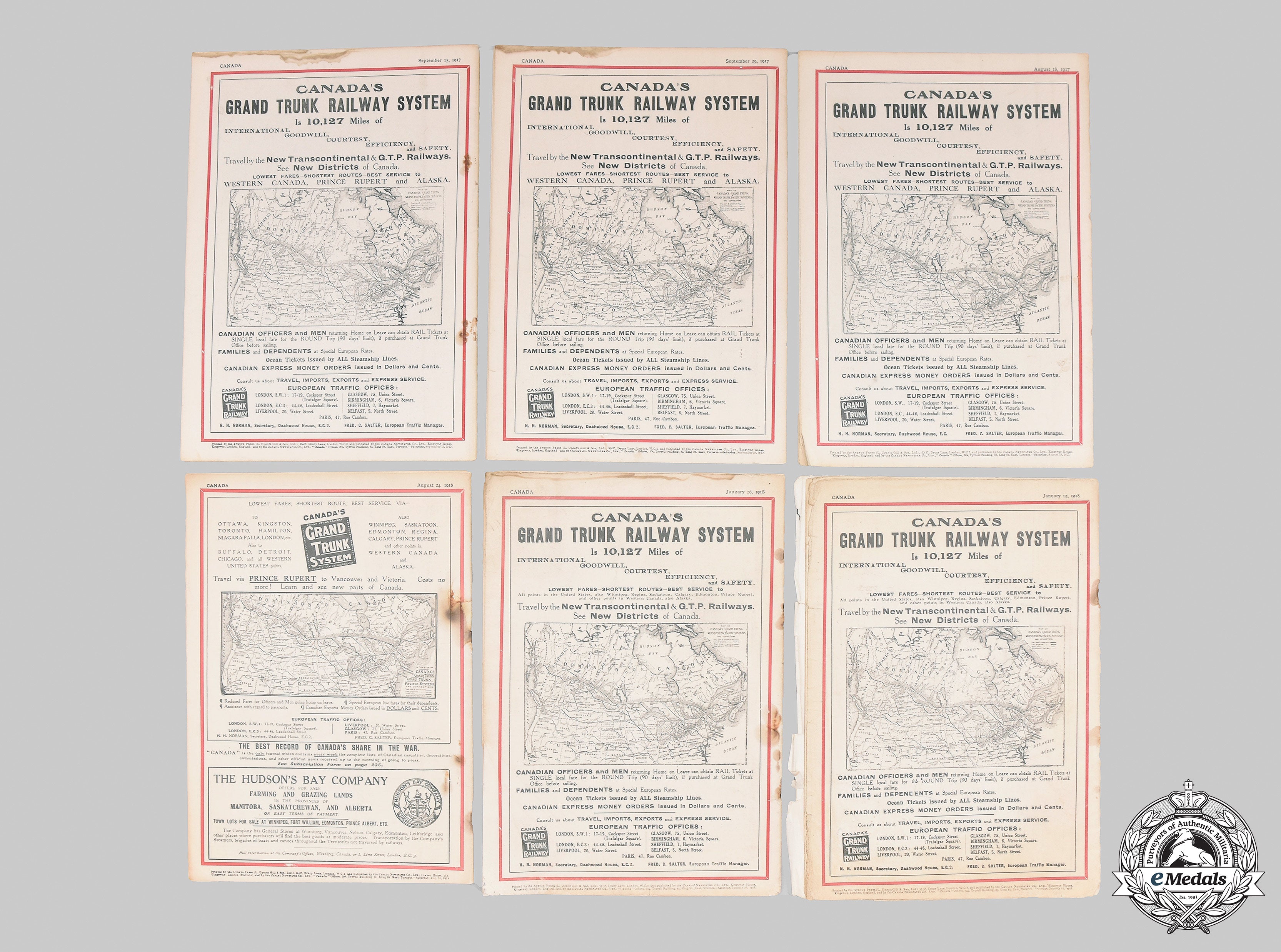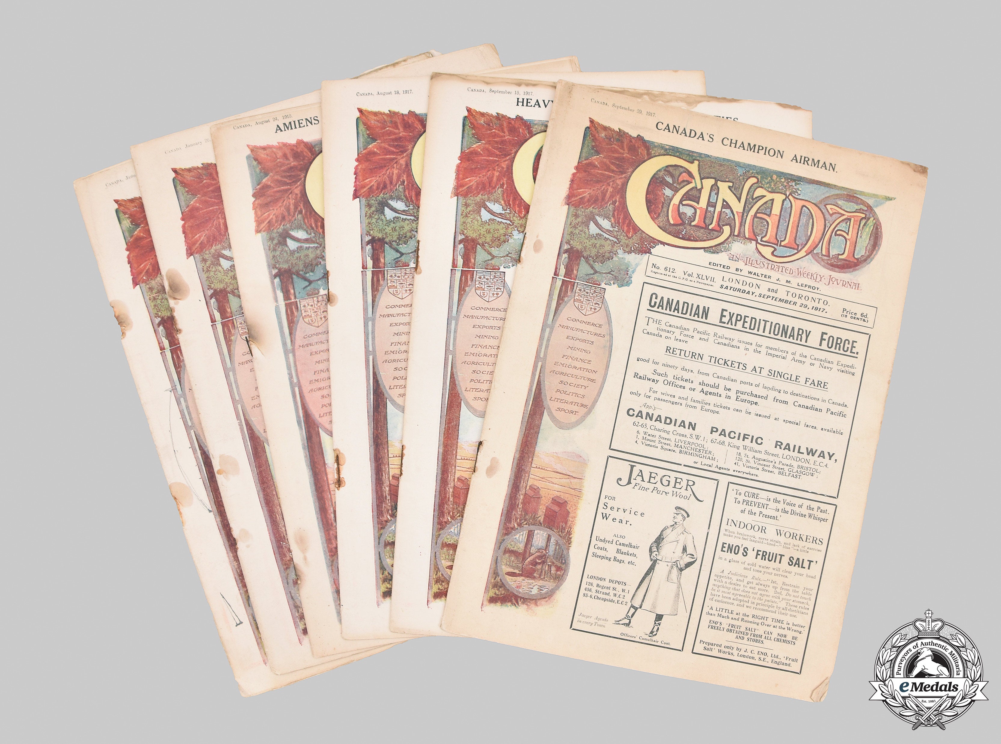 Each newspaper is in a magazine format, marked "London and Toronto / Registered at the G.P.O. as a Newspaper / Edited by Walter J.M. Lefroy", three with a price of 6d (pence)/15 cents; two with a price of 7d/15 cents; one with a price of 8d/20 cents. The front cover has a multi-colour masthead featuring "CANADA - An Illustrated Weekly Journal" flanked by a red maple leaf at the left, with an oval plaque affixed to the tree at the far left inscribed "Commerce, Manufactures, Exports, Mining, Finance, Emigration, Agriculture, Society, Politics, Literature, Sport", with two grain elevators and a circular inset featuring a beaver below, the plaque designating the range of content featured in the newspaper through the use of newsworthy articles and photographs, with emphasis on the war overseas and all the latest news from the European front, the articles accompanied by an assortment of sponsored advertisements, all six with an advertisement for the Grand Trunk Railway on the back cover. Each newspaper contains 32 pages printed in black ink, plus the cover in four-colour inks, on an off-white paper stock, dual staple-bound, measuring 225 mm (w) x 320 mm (h), exhibiting age soiling and wear, issue No. 627 with parts of the front cover and the following pages missing and/or damaged, rust evident on the staples, ranging from poor to very fine.