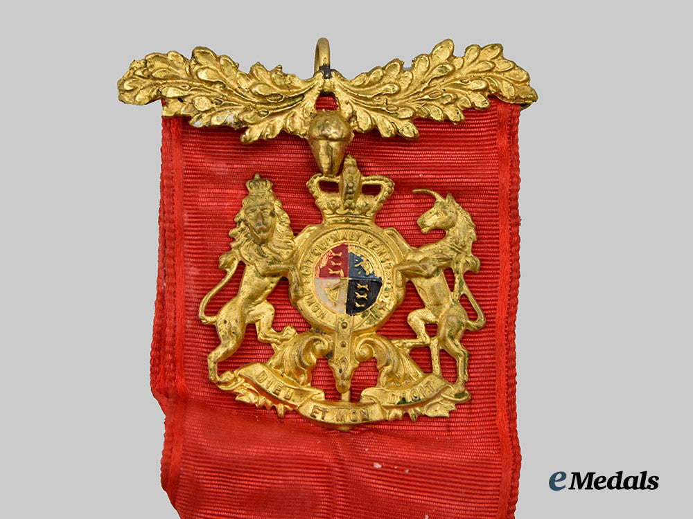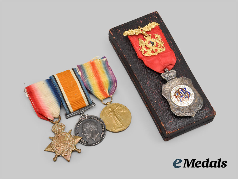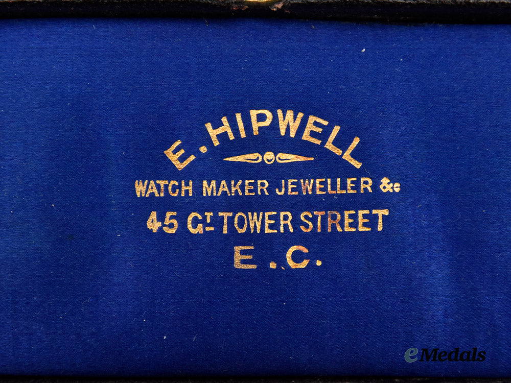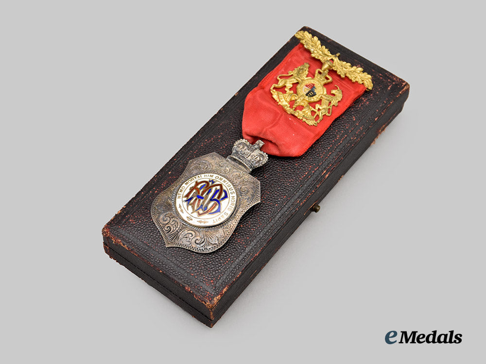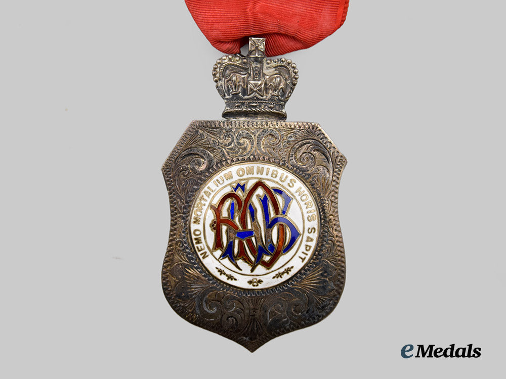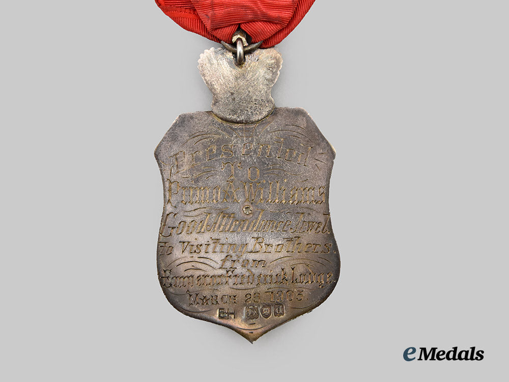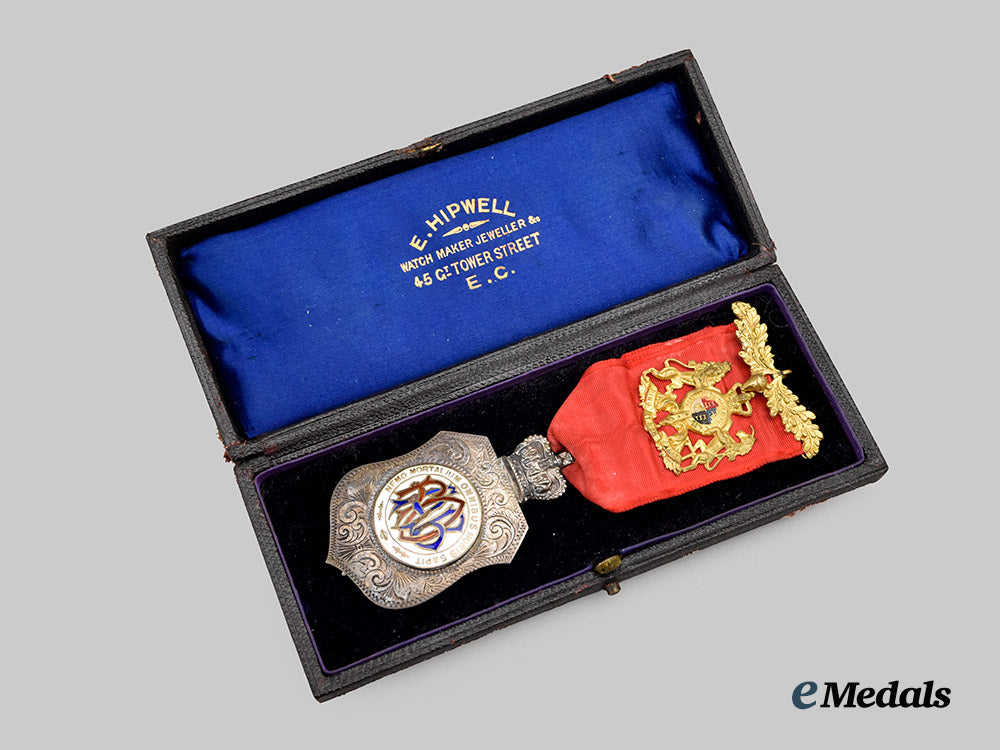 Accompanied by a Royal Antediluvian Order of Buffaloes Medal, 1899, awarded to the father of Arthur Williams. In silver, badge consisting of a shield, topped by a crown, obverse centerpiece bearing the monogram of the Order (RAOB) in red and blue enamel, surrounded by the Latin motto NEMO MORTALIUM OMNIBUS HORIS SAPIT (The wisest may make mistakes), all on a white enameled field, the reverse engraved with “Presented to Primo A Williams Good Attendance Jewel to Visiting Brothers from Emperor Frederick Lodge March 29 1903”, marked with lion, leopard's head (London 1821-), and the letter d (1899), 65.4 mm (h) x 38 mm (w), enamel chipping on obverse centerpiece, on original ribbon with gilt plaque measuring 32 mm (h) x 30 mm (w), extremely fine. In its hardshell case, navy satin interior, black velvet medal bed, fine.