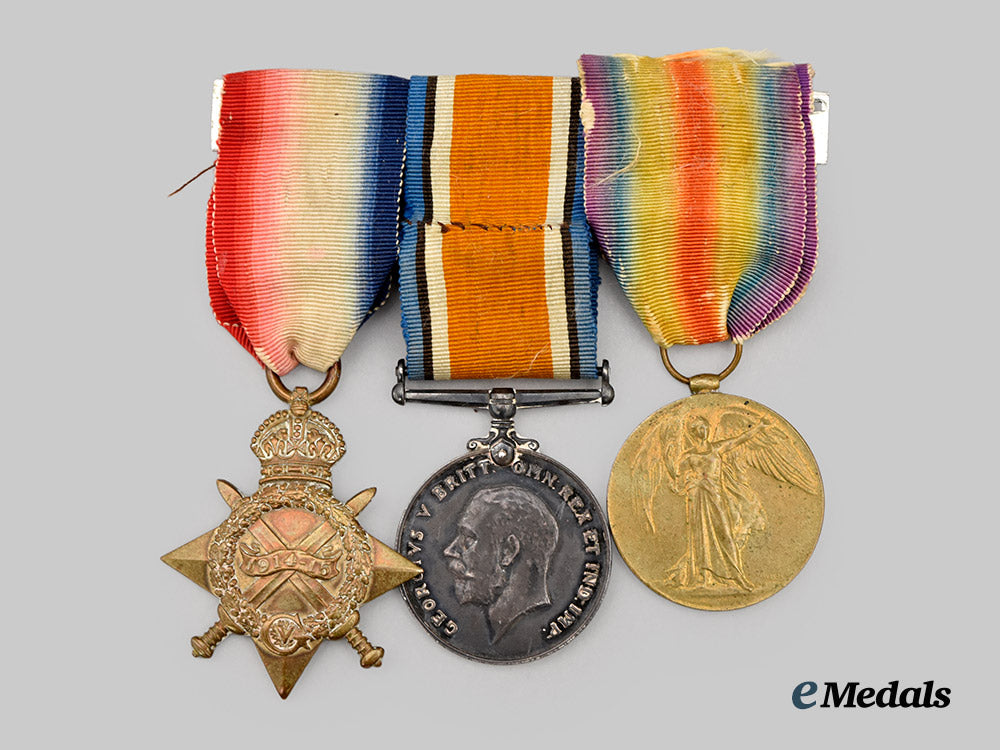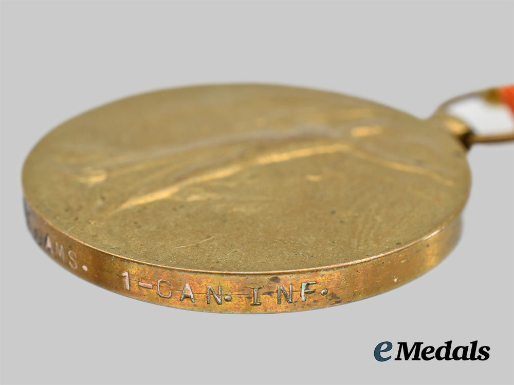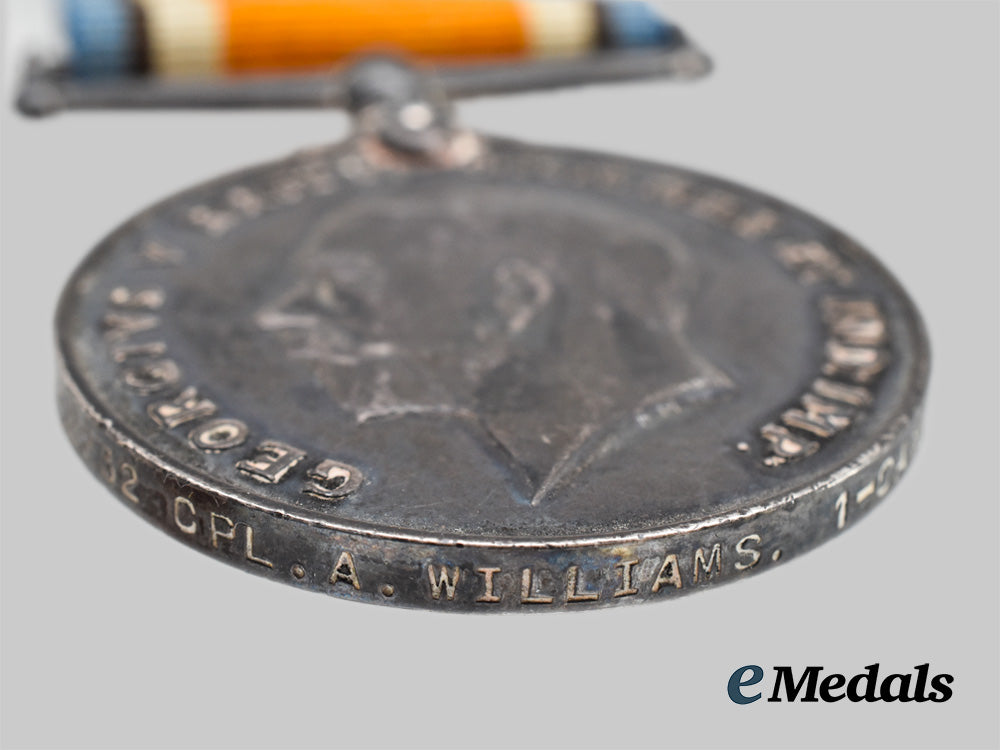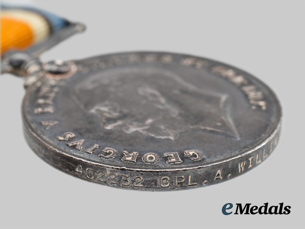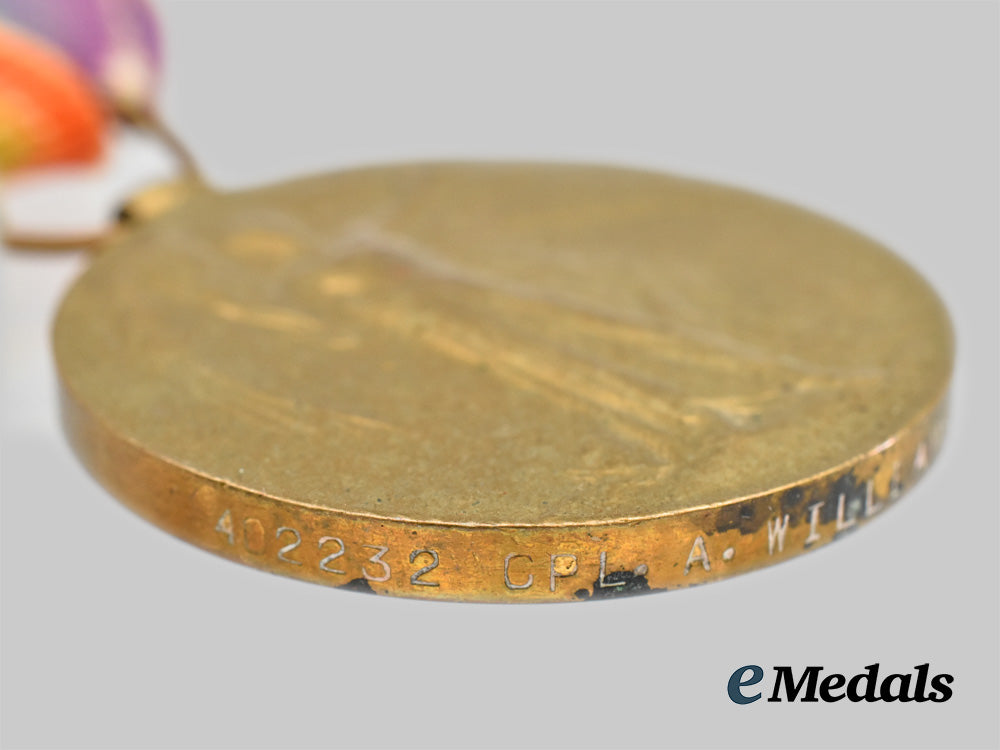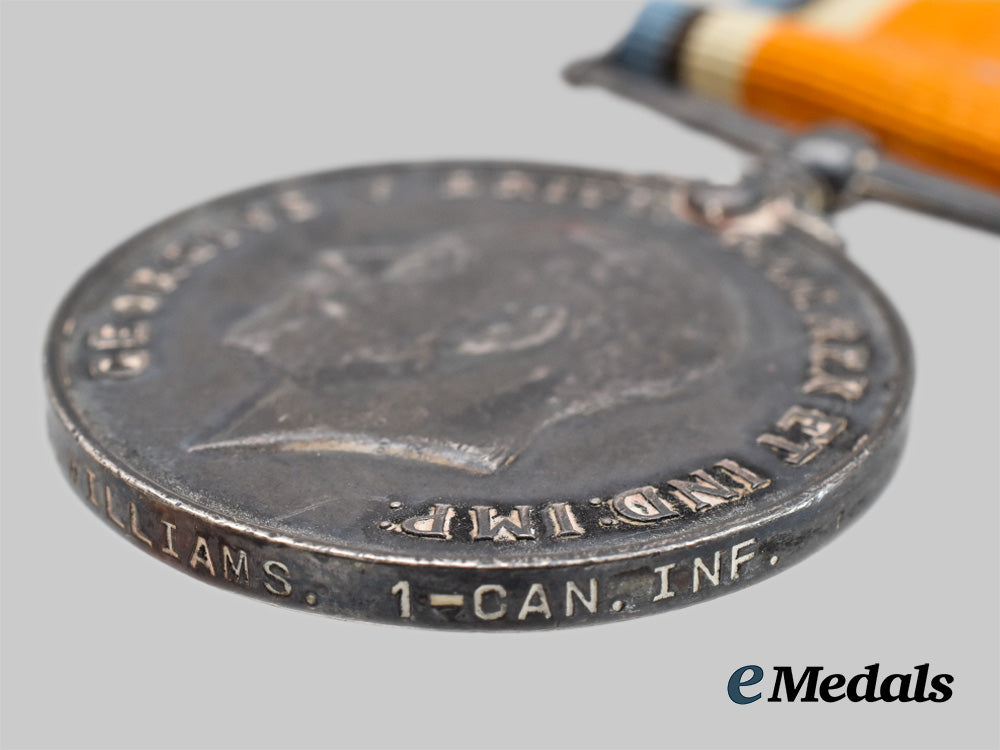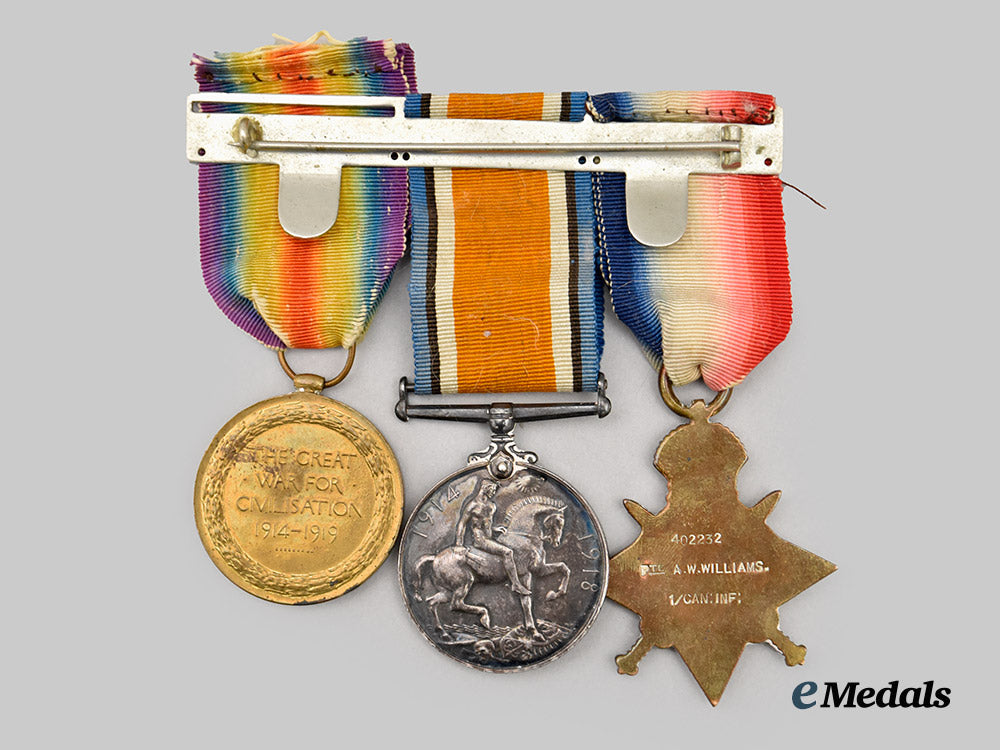 1) A British Medal Bar with three medals: A Victory Medal measuring 36.2 mm in diameter, removed from the bar, impressed 402232 CPL A Williams 1-CAN. INF; A British War Medal measuring 36.25 mm in diameter, impressed 402232 CPL A Williams 1-CAN. INF; A 1914-15 Star measuring 62 mm x 44.7 mm, awarded to 402232 Pte A.W Williams 1/CAN: INF: All period mounted and in very fine condition.