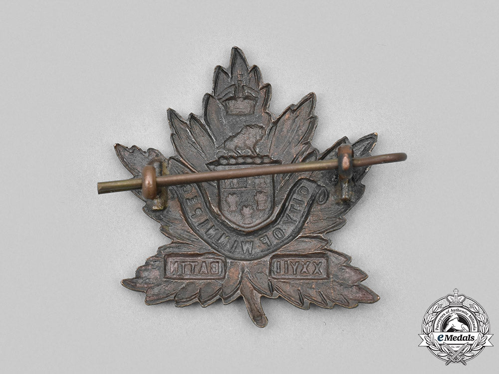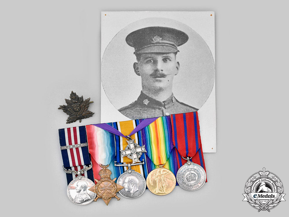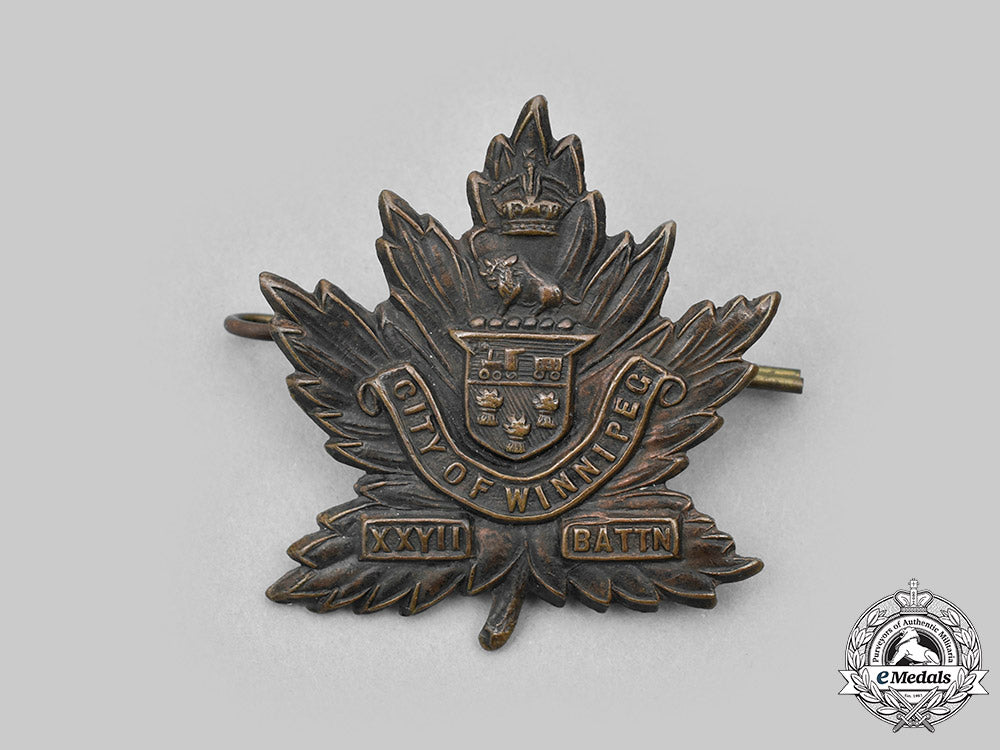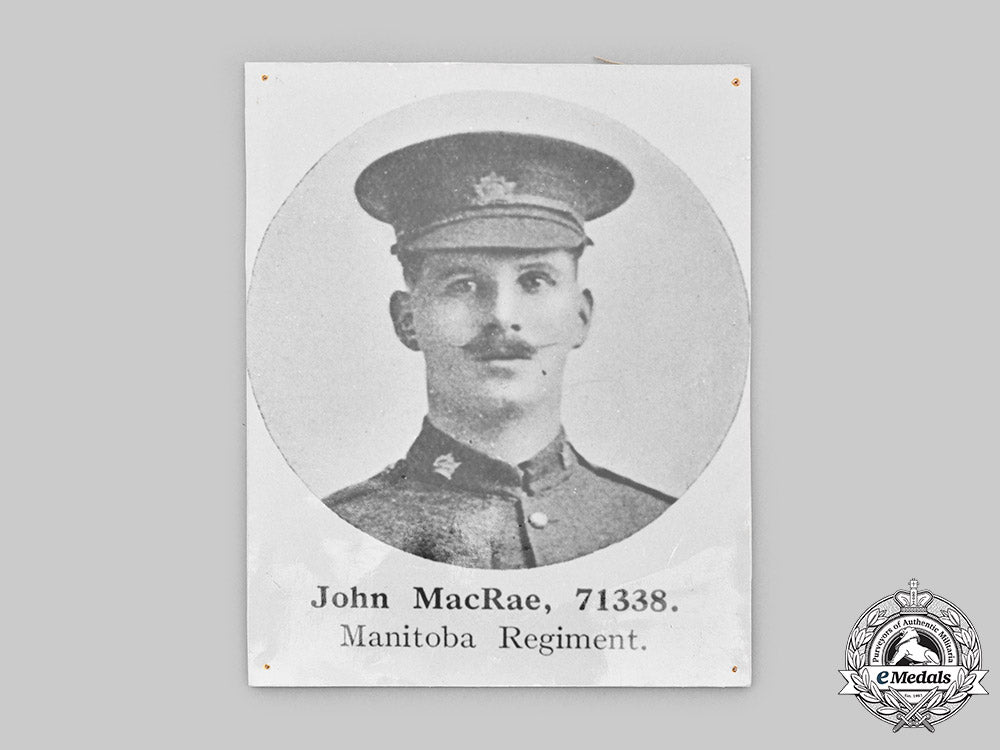 Accompanied by a cap badge for the City of Winnipeg 27th Battalion, browning copper, measures 38.75mm (w) x 42mm (h), reverse hollow with two lugs with a double pronged pin, in very fine condition, and a reprinted photograph of John MacRae, measuring 140mm (w) x 184mm (h), in very fine condition.