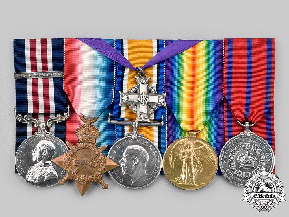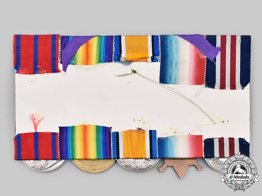 A Memorial Cross is overlaid on the bar, attached to the ribbon of the War Medal, in silver, reverse 71338 C.S.M. J. MACRAE M.M., and is marked STERLING on the reverse of the 6 o’clock arm, attached to a thin purple ribbon, in extremely fine condition.