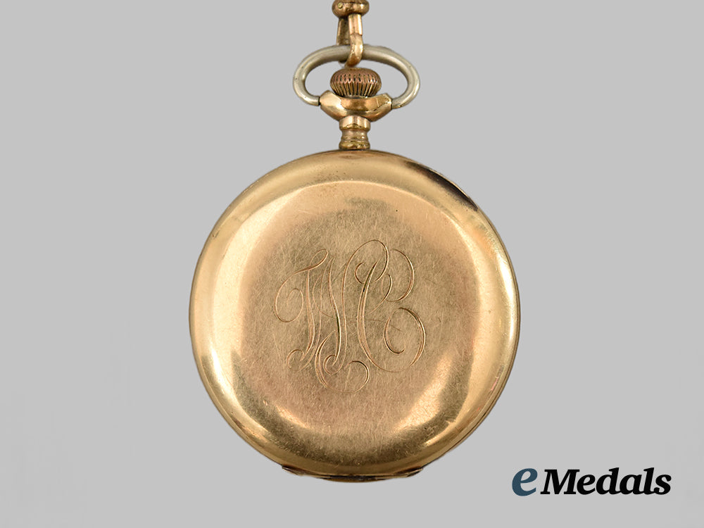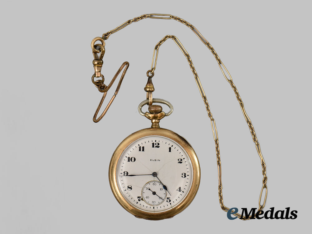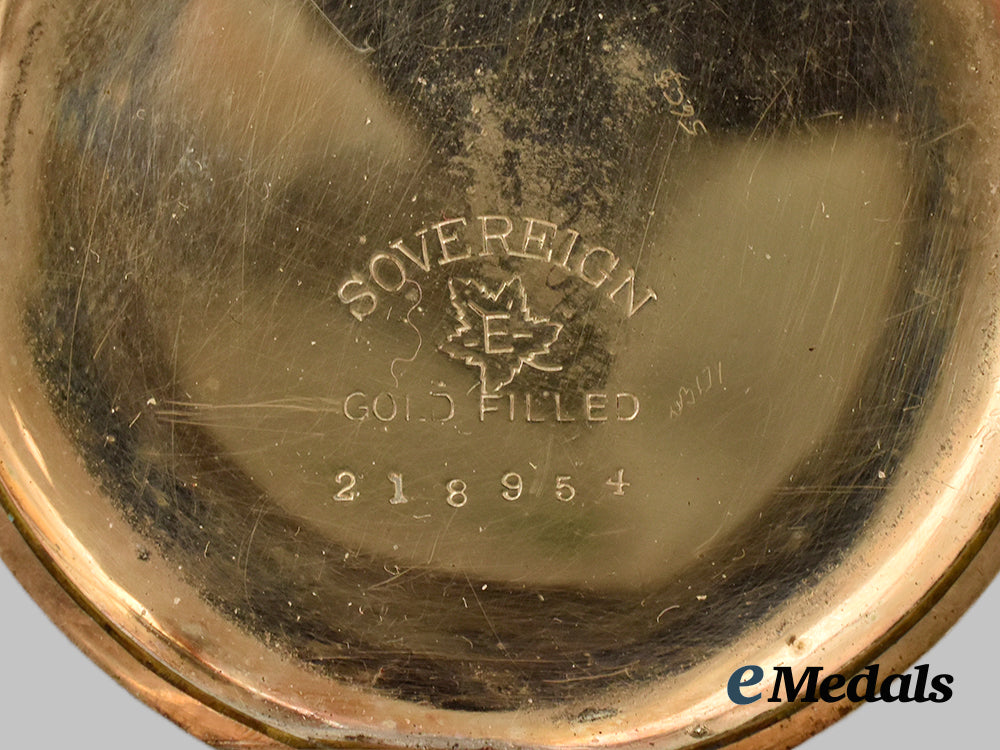 Functioning, Gold-filled casing, weighing 76.8 grams inclusive of its chain, the white porcelain face with bold numerals in black, a ring above marked with black rules in intervals of sixty minutes, the hour and minute hands in black, the "6" position obscured by the inset second hand clock with a black secondhand, maker marked "ELGIN" on the face, covered by a glass crystal, large engraved script initials "WC" on the back cover, marked "SOVEREIGN" above a maple leaf bearing an "E" and "GOLD FILLED / 218954" on the inside back cover, engraved "PRESENTED TO Pte. Wilfred Columbus BY THE TOWNSHIP OF WALPOLE FOR SERVICES IN THE GREAT WAR 1914-1918" on the internal works cover, measuring 47 mm (w) x 58.55 mm (h) inclusive of its stem, incorporating a full length fine link chain, ring suspension, very light contact, better than very fine.