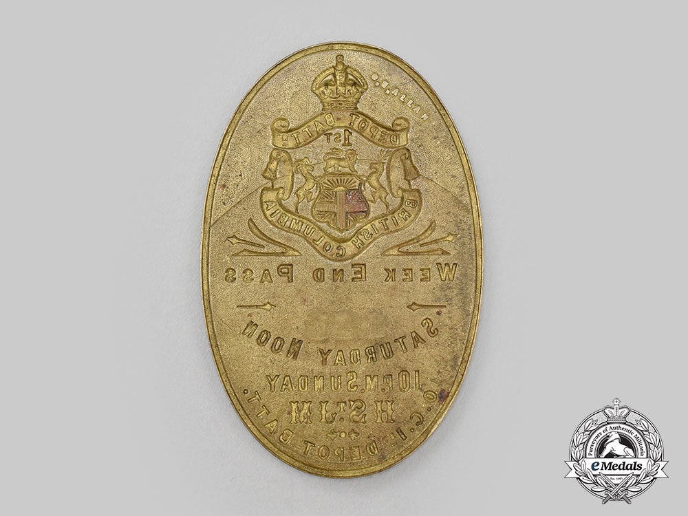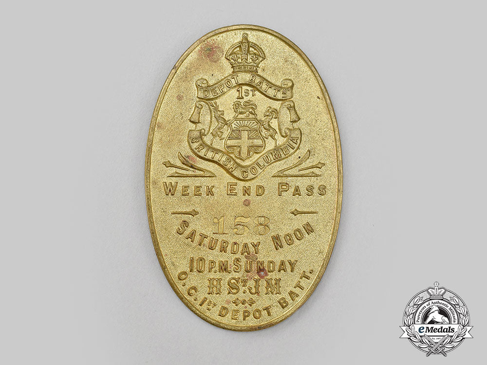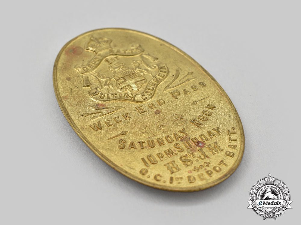 In die-stamped bronze gilt, oval-shaped, obverse illustrating the 1st British Columbia Depot Battalion insignia, inscribed "WEEK END PASS / 158 / SATURDAY NOON / 10 P.M SUNDAY / H St. J M / O.C. 1st DEPOT BATT.", the number "158" stamped, reverse maker marked "O.B. ALLAN", measuring 46.8 mm (w) x 72.7 mm (h), exhibiting spotting, better than very fine.