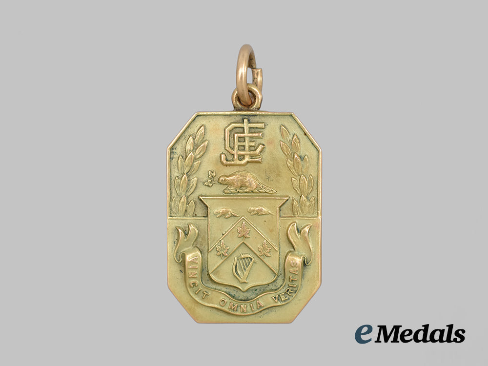 In 14K Gold, weighing 14.4 grams, marked "14 K" and hallmarked with an "E" inside a diamond on the reverse, obverse illustrating the Eaton coat-of-arms bearing two beavers above a band with three maple leaves and a harp below, surmounted by a beaver and framed by a ribbon banner inscribed "VINCIT OMNIA VERIT" (Truth Conquers All), sprigs of laurel leaves on either side with the cypher of John Craig Eaton (interlocking "JCE") at the top, reverse inscribed "PRESENTED TO Wm. CARSON BY SIR JOHN. C. EATON AS A MARK OF APPRECIATION OF SERVICES IN THE GREAT WAR 1914-1918", the name engraved in a ribbon banner and the remaining type in raised lettering, measuring 21.5 mm (w) x 33.3.mm (h) inclusive of its integral ring suspension, very light contact, extremely fine.