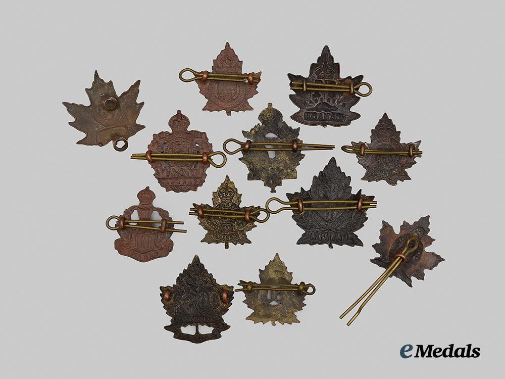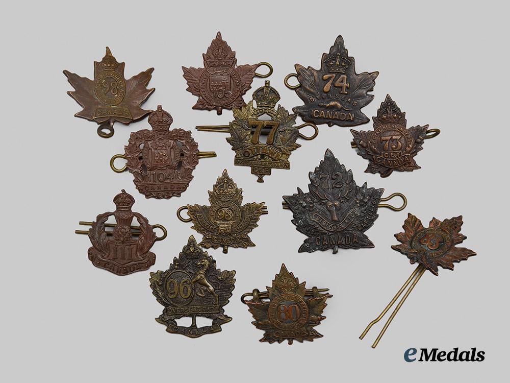 12. 111th Infantry Battalion "South Waterloo Battalion" Collar Badge: in browning copper, voided, unmarked, measuring 24.5 mm (w) x 31 mm (h), both lugs and pin intact.