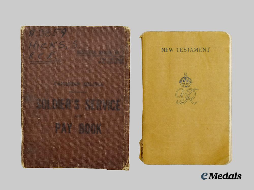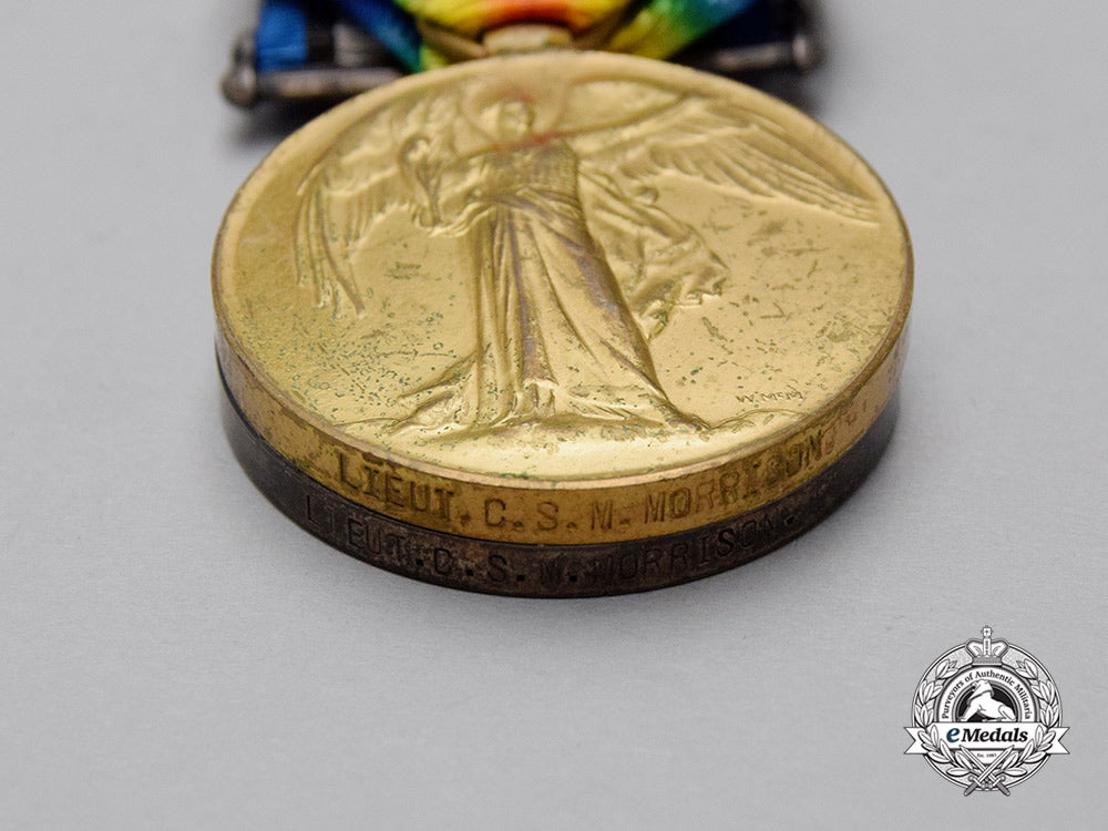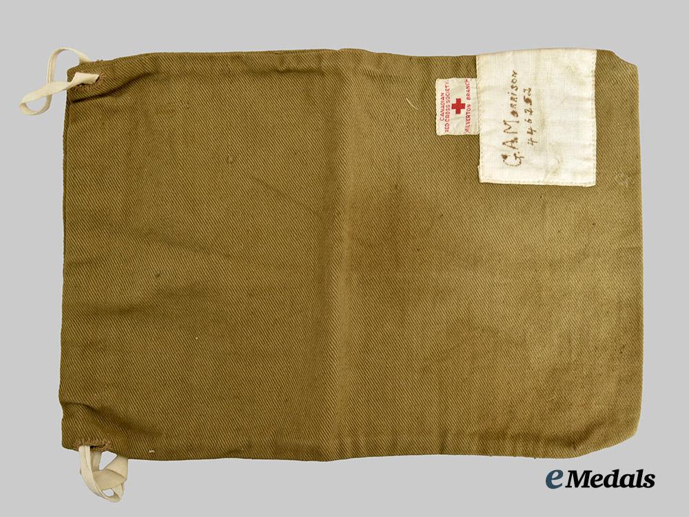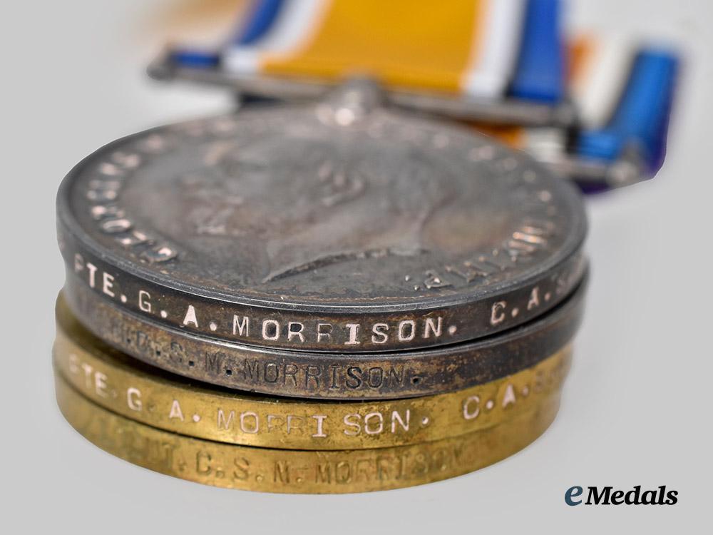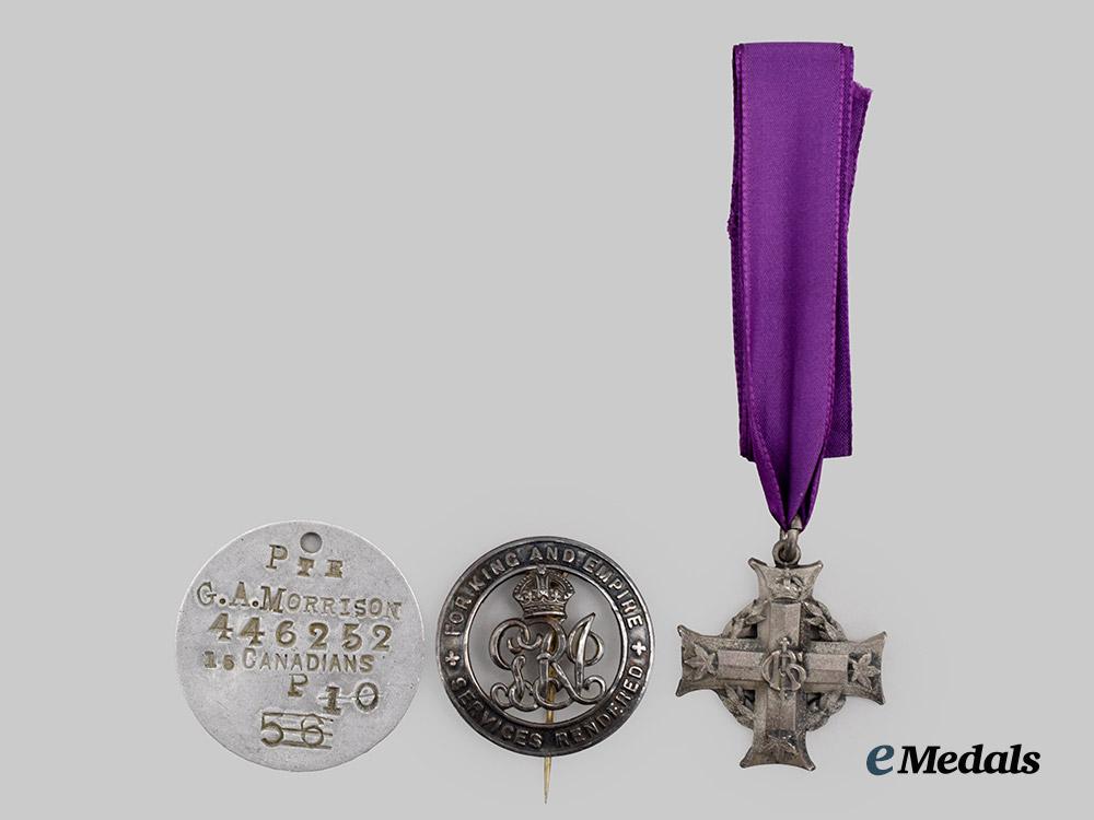 Canada; Lieutenant Charles Sangster McLeod Morrison: British War Medal (LIEUT. C.S.M. MORRISON); Victory Medal (LIEUT. C.S.M. MORRISON); and Memorial Cross, GVR (Lieut. C.S.M. Morrison). Naming is officially impressed on the First War pair and engraved on the MC. Un-mounted, replacement ribbons, the MC in its case of issue, dark patina on the BWM, along with his Memorial Plaque (CHARLES SANGSTER McLEOD MORRISON) in its case of issue, the naming in raised lettering. Accompanied by a Memorial Cross letter from the Minister of National Defence and Memorial Plaque letter from Buckingham Palace; a Newspaper Article with his Obituary from the Toronto Star of April 26, 1917; along with a Studio Portrait Photograph of Lieutenant Morrison in Uniform (black and white, faded to a sepia-toned look, seated pose, studio emboss stamped "MICKLETHWAITHE PHOTO - TORONTO.", 84 mm x 105 mm, in a folder with vellum insert). George Adam Morrison: British War Medal (446252 PTE. G.A. MORRISON. C.A.S.C.); and Victory Medal (446252 PTE. G.A. MORRISON. C.A.S.C.). Naming is officially impressed. Un-mounted, replacement ribbons, very dark patina on the BWM, with original cardboard box stamped "WAR" and VICTORY" and addressed to "446252 PTE. G.A. MORRISON C.A.S.C.". Accompanied by his Services Rendered War Badge (silver, numbered "C71788" on the reverse, 32.8 mm, vertical pinback); his Identification Tag (aluminum, stamped "PTE G.A. MORRISON 446252 15 CANADIANS P10" with "56" triple-stroked, 38 mm); and a Canadian Red Cross Society Bag (olive green canvas, with two cloth labels sewn in place on the exterior, one is a white cloth label embroidered in red "CANADIAN RED CROSS SOCIETY" and "MILVERTON BRANCH" flanking the red cross, with a second white cloth patch below inscribed in black ink with his name, "G.A. MORRISON" and his service number, "446252", white cotton tie closure, 220 mm x 320 mm, slightly soiled). Very light contact, better than very fine.