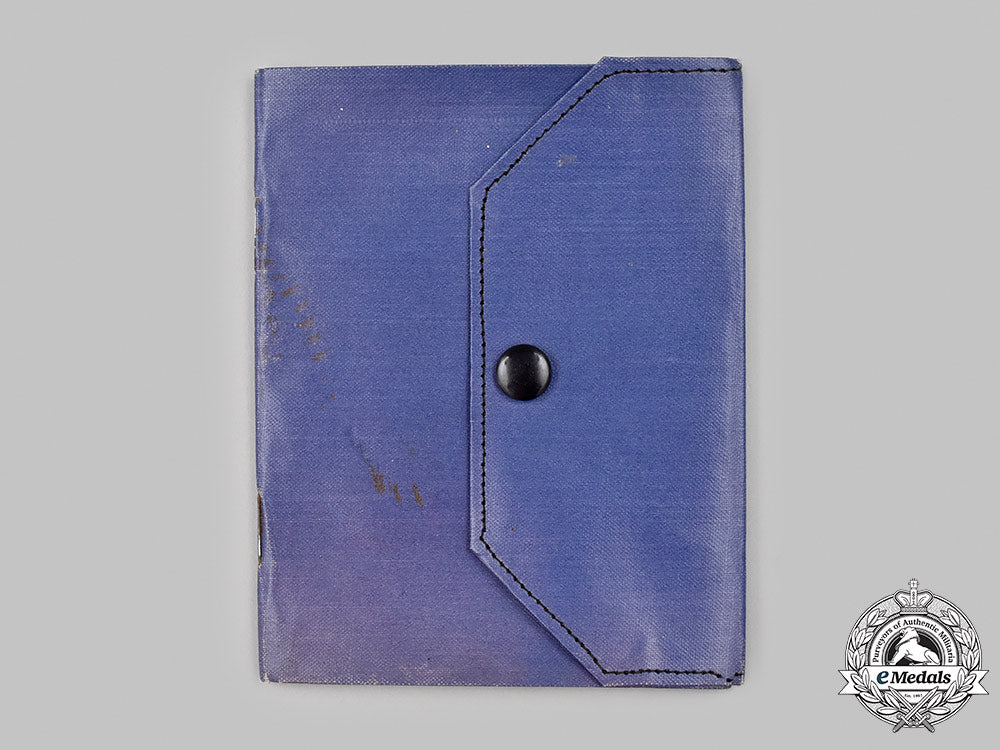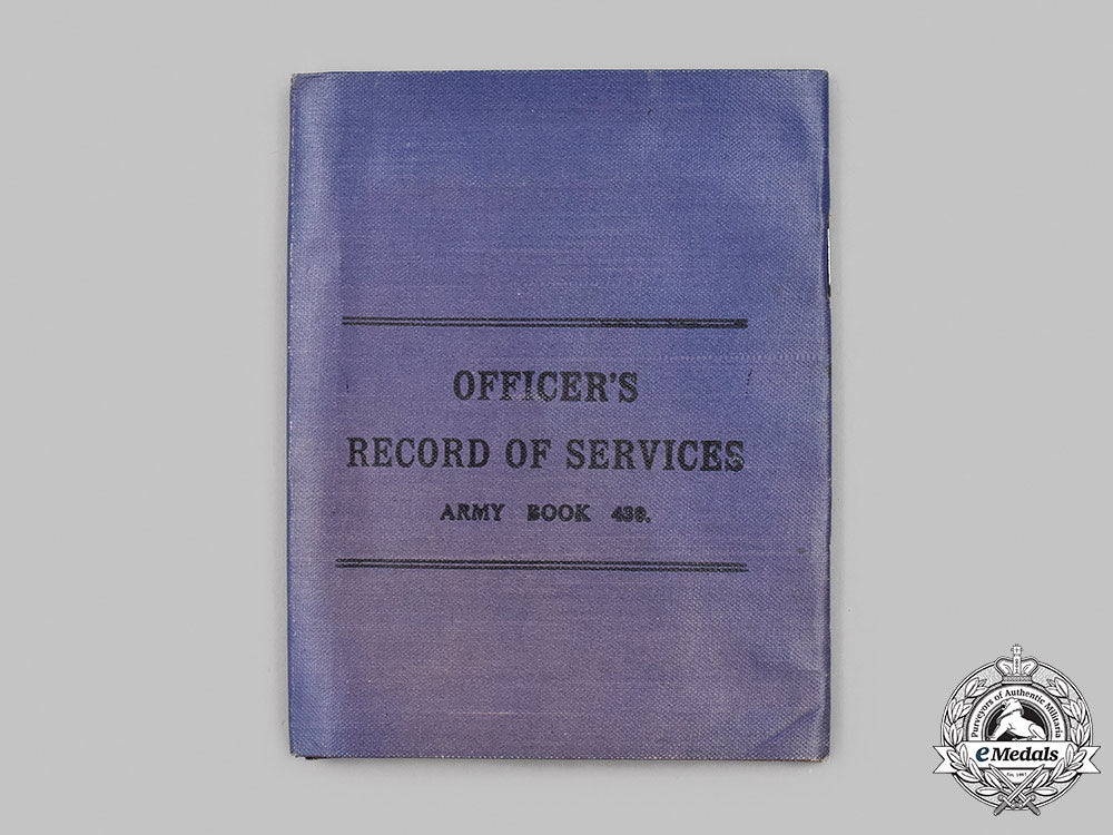 Army Book containing 16 pages printed in black ink on a thick brown paper stock, with a label pasted in place on the Instructions page (page 1) and inscribed "This book is not to be taken as a proof of the identity of the holder.". Page 2 contains personal information regarding Hill in handwritten inscriptions in black ink, the facing page 3 with notes documenting his vaccination and inoculation information, along with a signature stamped in red ink above the stamp in blue ink "Capt. & Adjt., No. 3 Training Depot Station R.A.F.". Also, there are additional pages pasted in place on pages 4 and 5, both of which are printed in black ink on a white paper stock. His promotion to Second Lieutenant on January 28, 1918 is stated on page 6. The book is housed in an ultramarine blue cloth-based, moisture-resistant folder with fold-over flap and snap closure, inscribed in black ink "OFFICER'S RECORD OF SERVICES, ARMY BOOK 439", with two black and white photographs pasted in place on the inside front cover (one of a series of tents, the other of an officer with a kane and leaning against a wall), the folder measuring 110 mm (w) x 140 mm (d). The Book is accompanied by a black and white photograph of Hill in his officer's uniform, with the RFC wing on his left breast and both collars bearing RFC collar badges, the photograph under glass, in a wooden frame with wire placed on the reverse for wall hanging, measuring 115 mm (w) x 158 mm (h). Near extremely fine.