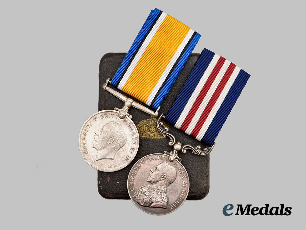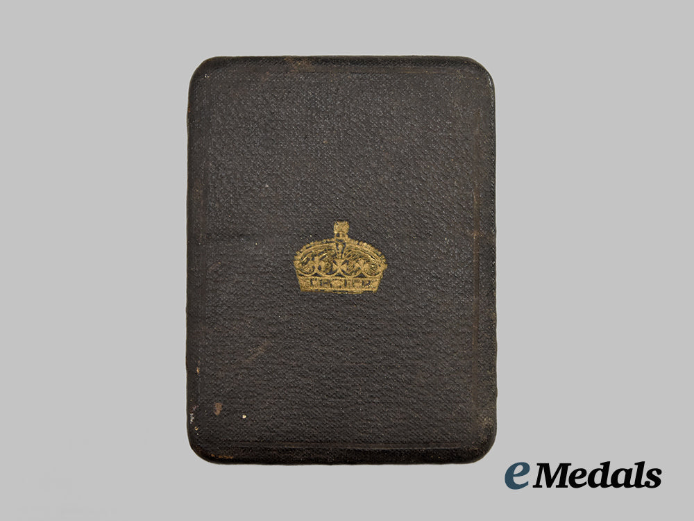 Contained in a small case, black leatherette exterior with crown on the lid, interior with a silk lid and velvet medal bed, measures 68mm (w) x 88mm (l) x 25mm (d), does not fully close, wear to exterior, discolouration to interior, remains in near very fine condition.