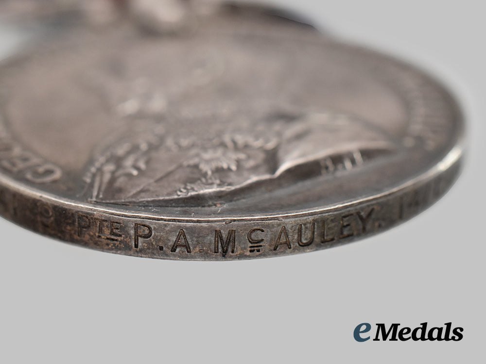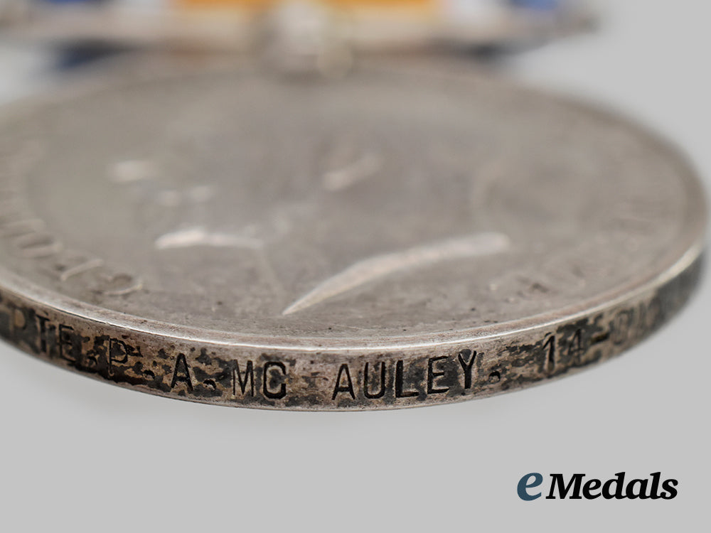 A Military Medal, in silver, rim impressed A-44189 PTE P.A. McAULEY. 14/CAN:I.B., lovely patina, minor contact, worn on a replacement ribbon, in extremely fine condition.