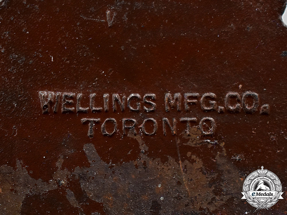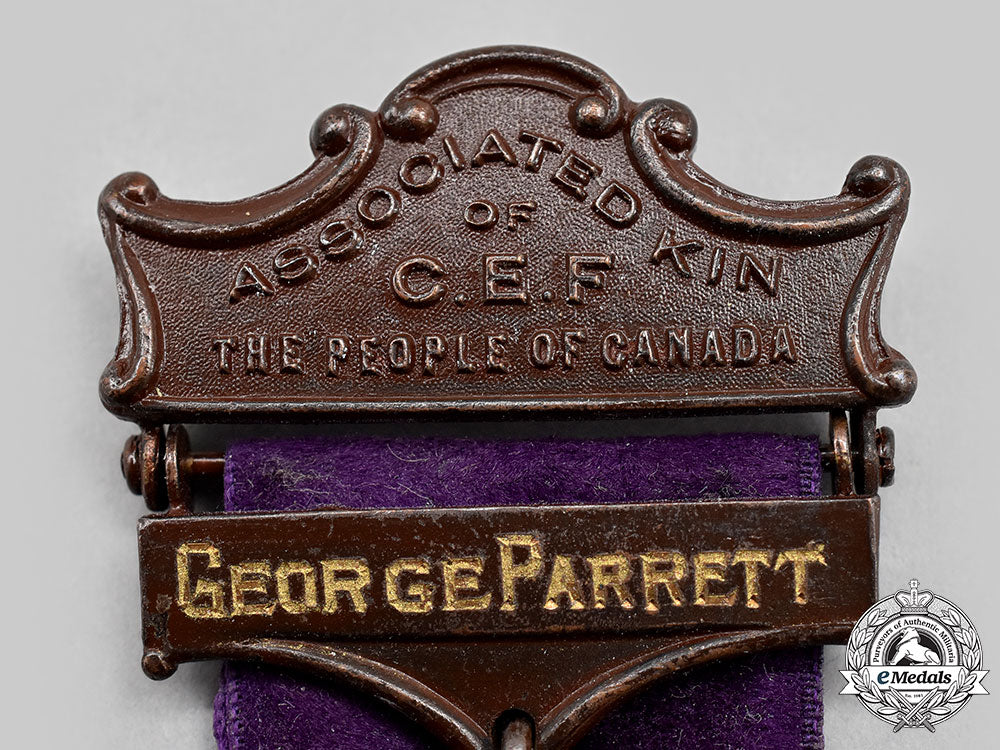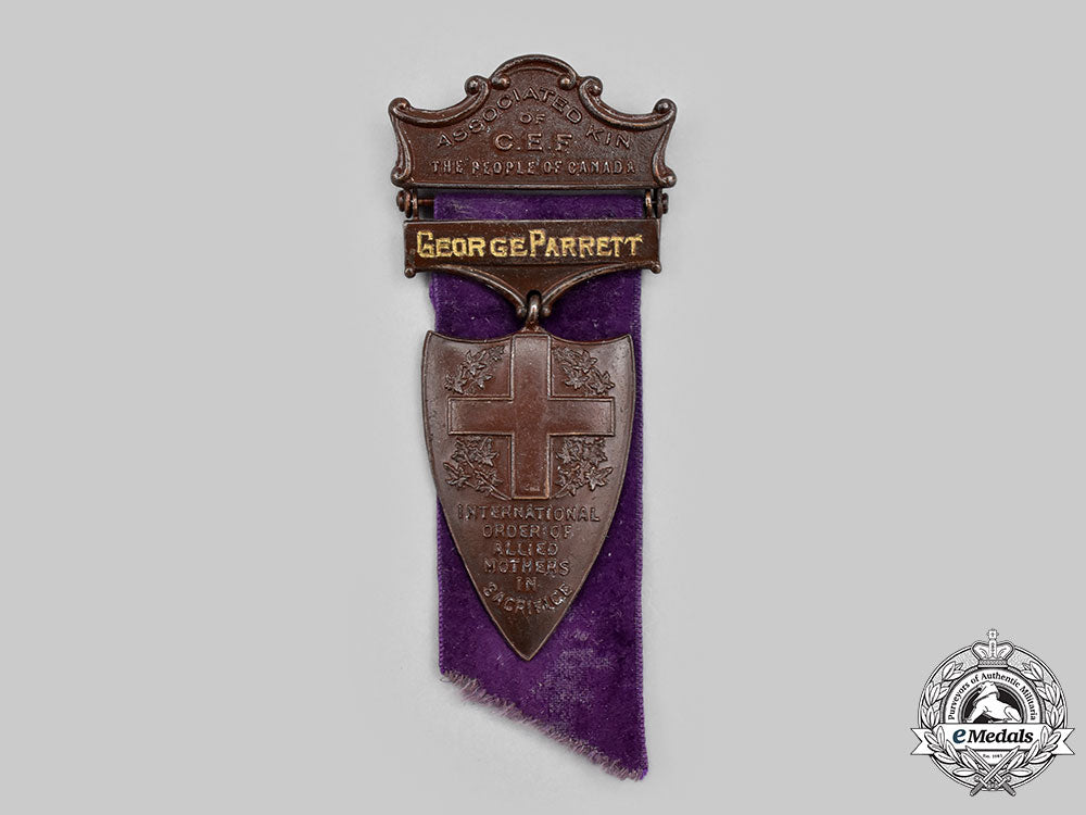 In bronze, obverse illustrating a cross with clusters of maple leaves in all four corners of the cross, inscribed "INTERNATIONAL ORDER OF ALLIED MOTHERS IN SACRIFICE" below, reverse inscribed "IN RECOGNITION OF LYDIA S. PARRETT AS A MOTHER IN SACRIFICE", the "LYDIA S. PARRETT" engraved, and maker marked "WELLINGS MFG. CO. TORONTO", the suspension bar engraved "GEORGE PARRETT", measuring 28.5 mm (w) x 46 mm (h), the hanger inscribed "ASSOCIATED KIN OF C.E.F / THE PEOPLE OF CANADA" with pinback, also maker marked "WELLINGS MFG. CO. TORONTO" on the reverse of the bar and hanger, lightly soiled original ribbon, very light contact.