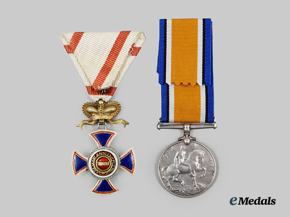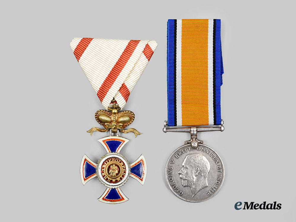Order of Danilo I, V Class Knight, Type V (1893-1918): in silver gilt with red, white and blue enamels, First War period issue, likely of Italian manufacture, measuring 40 mm (w) x 61.3 mm (h) inclusive of its crown suspension; and British War Medal (2015190 PTE. M. ROJOVICH. 47-CAN. INF.), in silver,the naming is officially impressed. The Order of Danilo I exhibits repair in the white enamels, with contact marks overall, on an original triangular ribbon with hook and eye, the British War Medal with edge nicks and contact marks overall, on a replacement ribbon. Together, near very fine.