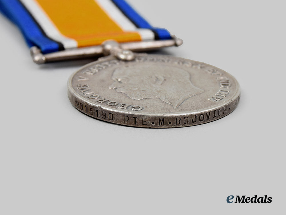 Footnote: Milnn Rojovich was born on December 10, 1890 in Andrijevica, Montenegro. He was a resident of Seattle, Washington when he signed his Attestation Paper as a Private (2015190) with the 6th Regiment, The Duke of Connaught's Own Rifles, on February 19, 1917, in Vancouver, British Columbia, at the age of 26, naming his next-of-kin as his father, Milton Rojovich of Andrijevica (also stated as Andrevich), Montenegro, stating that he was had no previous military service, that he was not married, that his religion was Greek Orthodox and that his trade was that of Miner. During his medical examination, the doctor noted that Rojovich had "slight varicose veins in both legs", otherwise he was fit for service. Private Rojovich embarked Halifax, Nova Scotia on May 28, 1917 aboard the S.S. Olympic, disembarking in Liverpool, England on June 9th, where he was taken on strength of the 16th Reserve Battalion. After training in England for three and a half months, he was sent to France, arriving in the French theatre on September 26, 1917, where he joined the Canadian Corps Reinforcement Centre on October 2nd. It was here that Private Rojovich was transferred to the 47th Infantry Battalion, joining his new unit on October 10, 1917. Eleven months after joining the 47th Infantry Battalion, Private Milnn Rojovich was Killed in Action on September 2, 1918, at the age of 27. He is acknowledged as having written and filed two wills: the first on April 17, 1917 while with the 6th Regiment, The Duke of Connaught's Own Rifles, bequeathing all his real estate to Mike Martin of Seattle, Washington and his personal estate to his father Milton Rojovich of Andrijevica, Montenegro; the second on August 28, 1917 while with the 16th Reserve Battalion, bequeathing all his real estate and personal estate to his father. Postwar, his father received his medals and decorations, which included this British War Medal, while his mother received his Memorial Cross, along with his Memorial Plaque and Scroll. In addition, he was also a recipient of the Order of Danilo I, V Class Knight from his country of birth, Montenegro.
