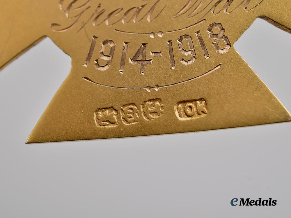 A private FWPL Service decoration, in 10K Gold, a cross with large central medallion engraved JDB, reverse engraved “PRESENTED BY THE F.W.P.L In memory of the Great War 1914-1918” measures 26.4 mm (w) x 30.3 mm (h), weighs 5.6 grams, marked 10K and hallmarked denoting British gold, in extremely fine condition.
