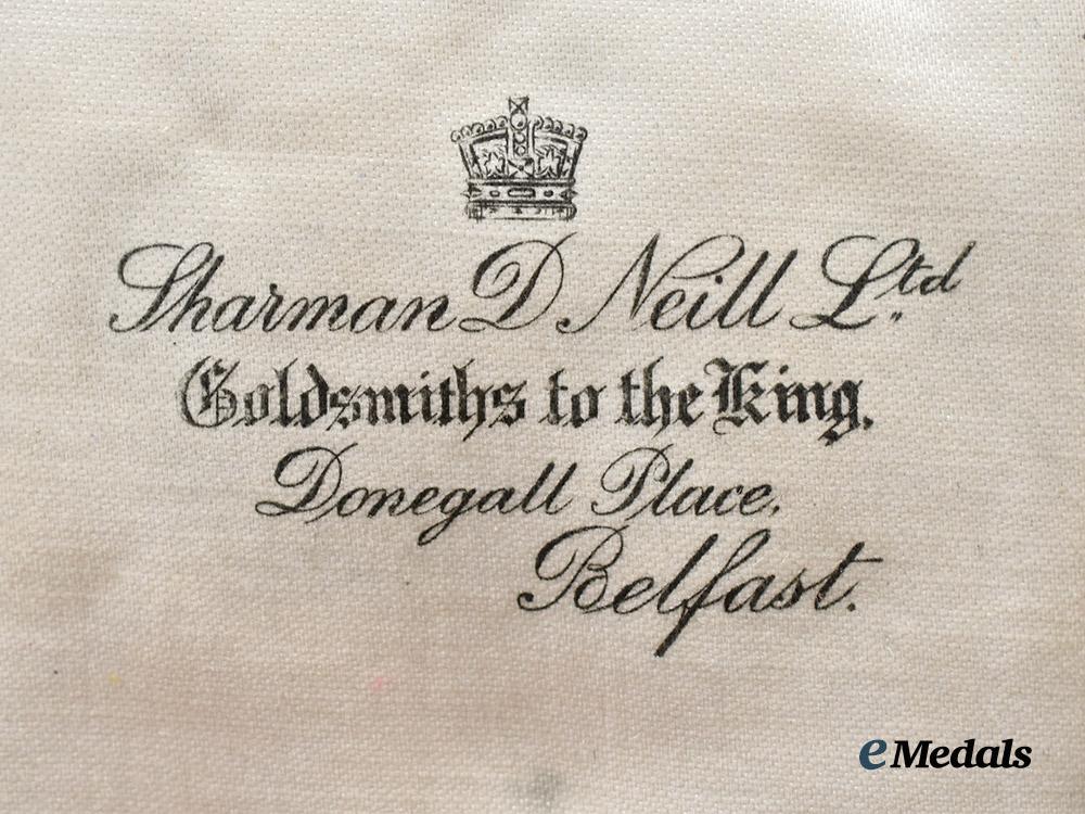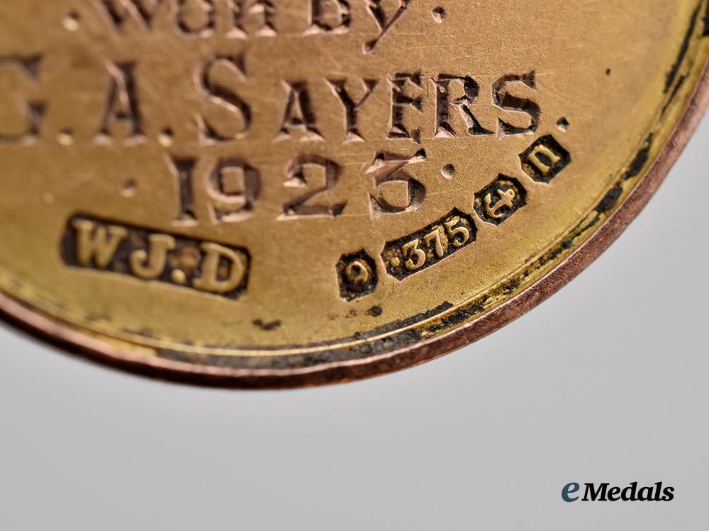 A 1923 Mile Cycle Championship Medal, in 10K Gold, obverse featuring a man on a bicycle, reverse engraved County Down Constabulary Athletic Championships 1 Mile Cycle won by G.A SAYERS 1923, marked W.J.D denoting maker, with gold hallmarks denoting, measures 25.9 mm (w) x 30.7 mm (h), weighs 7.29 grams, light wear and residue around the edges, in very fine condition. Contained in a Jewellers case, brown exterior with interior lid marked Sharman D Neill Ltd Goldsmiths to the King Donegall Place Belfast, black velvet medalbed with hook, measures 56.4 mm (w) x 76.9 mm (l) x 19.0 mm (d), clasp functional, light wear, in extremely fine condition.