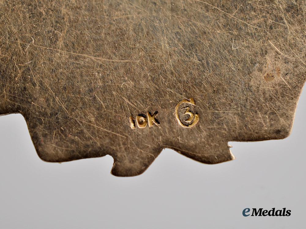 A Richmond Hill Service Medal, in 10K Gold, obverse engraved R. ATKNISON RICHMOND HILL ON HIS RETURN FROM THE FRONT PRESENTED BY THE CITIZENS, reverse plain, marked 10K, worn on a fraying ribbon with Gold RICHMOND HILL, horizontal pin on the reverse, measures 26.3 mm (w) x 30.0 mm (h), weighs 11.7 grams, minor wear, ribbon fraying, in extremely fine condition.