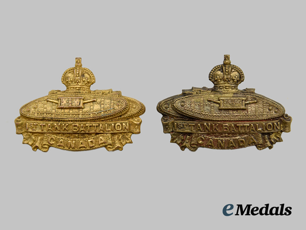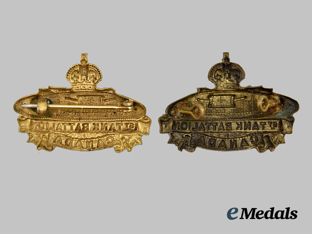 Both badges illustrate a tank surmounted by the royal crown, the tank above two inscribed ribbon banners, "1st TANK BATTALION" and "CANADA".