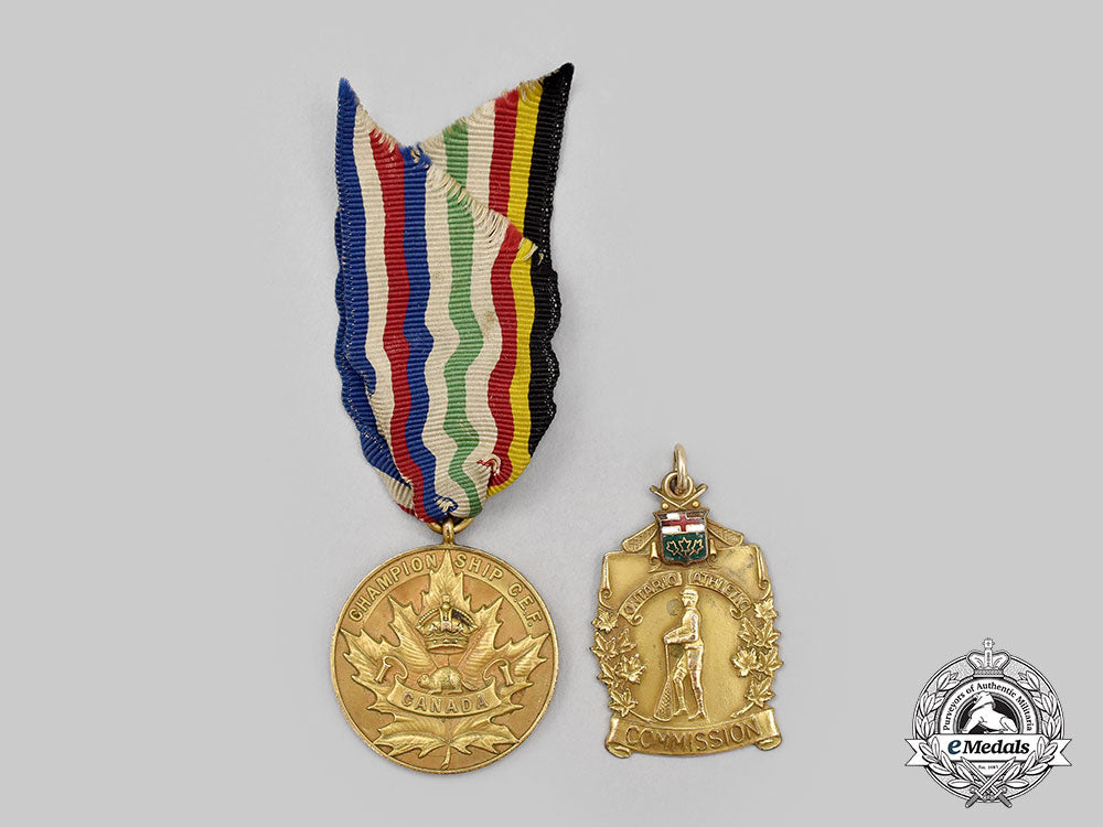 2. Ontario Athletic Commission Medal for Lacrosse: two-piece construction, Ontario arms in bronze gilt with red, white and green enamels, mounted to a bronze gilt base illustrating a standing soldier leaning on a lacrosse stick, flanked by clusters of maple leaves on either side, framed by three ribbon banners inscribed "ONTARIO" "ATHLETIC" "COMMISSION", the aforementioned Ontario arms backed by crossed lacrosse sticks, reverse marked with a crown within an oval and maker marked "BAILEY", measuring 26.8 mm (w) x 39.8 mm (h) inclusive of its integral ring, with silvered metal suspension ring, exhibiting chipping in the white enamels on the Ontario arms on the obverse, along with scattered gilt wear on the reverse.