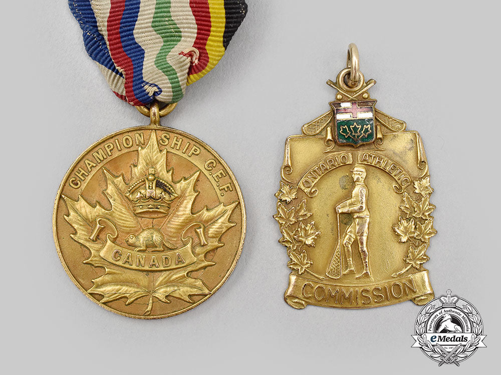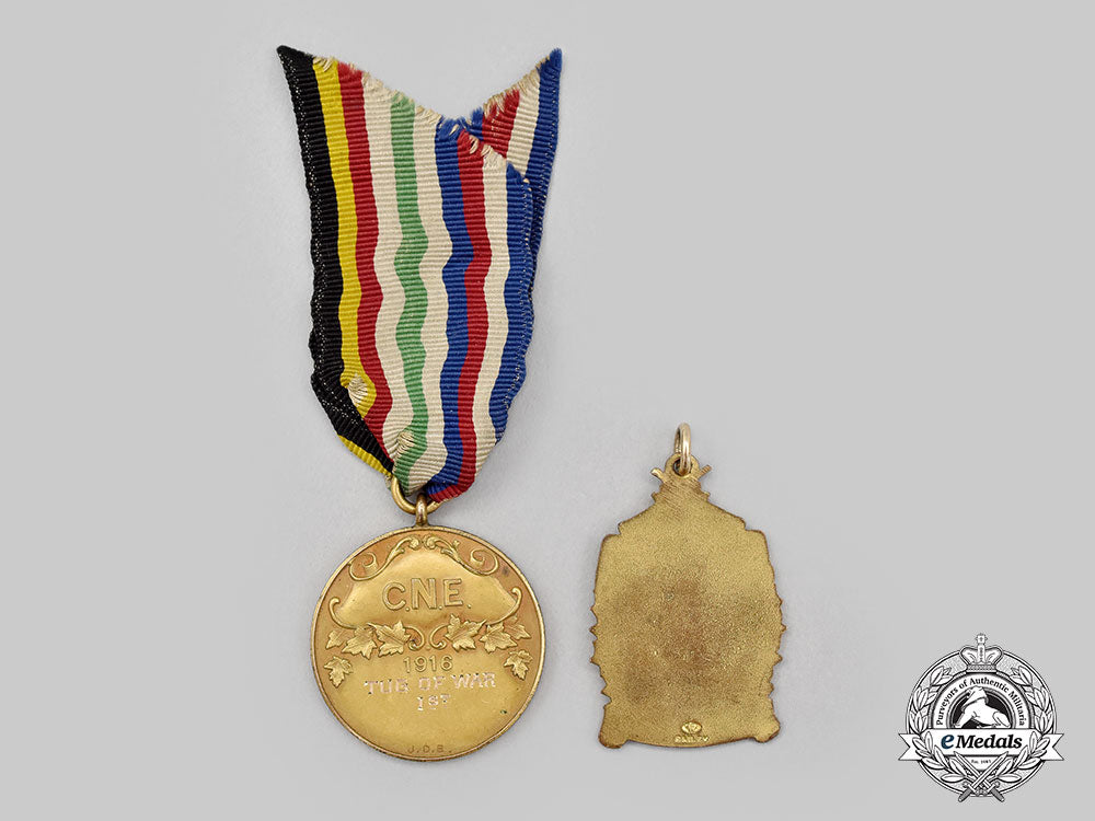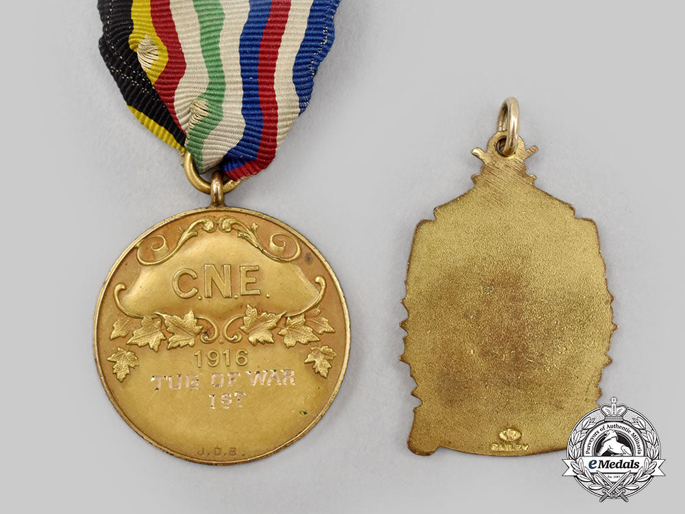 1. Canadian National Exhibition (CNE) Championship C.E.F., 1st Place in Tug of War Competition Medal 1916: in bronze gilt, obverse illustrating a large maple leaf fronted by a King's crown and ribbon banner inscribed "CANADA", inscribed "CHAMPIONSHIP C.E.F." above, reverse inscribed "C.N.E." (Canadian National Exhibition) within an ornate frame, with clusters of maple leaves at its base, dated "1916", engraved "TUG OF WAR 1st" and maker marked "J.D.B." (J.D. Bailey), measuring 31.7 m (w) x 36 mm (h) inclusive of its integral ring, very light contact, suspension ring and original ribbon.