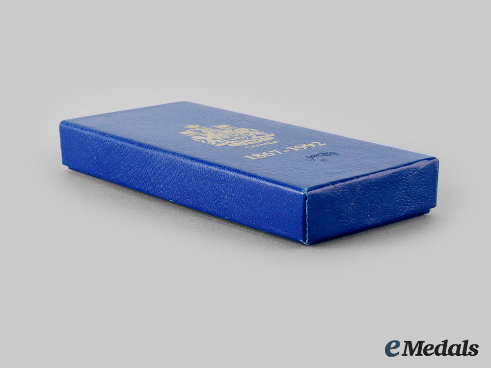 In rhodium-plated copper and zinc alloy, measuring 36.3 mm in diameter, edge nicks, very light contact, original ribbon with pinback, near extremely fine. In its cardboard box of issue, Canadian coat-of-arms and dated 1867-1992 on the lid, navy blue felt medal bed, scuff mark on the lid, box also near extremely fine.