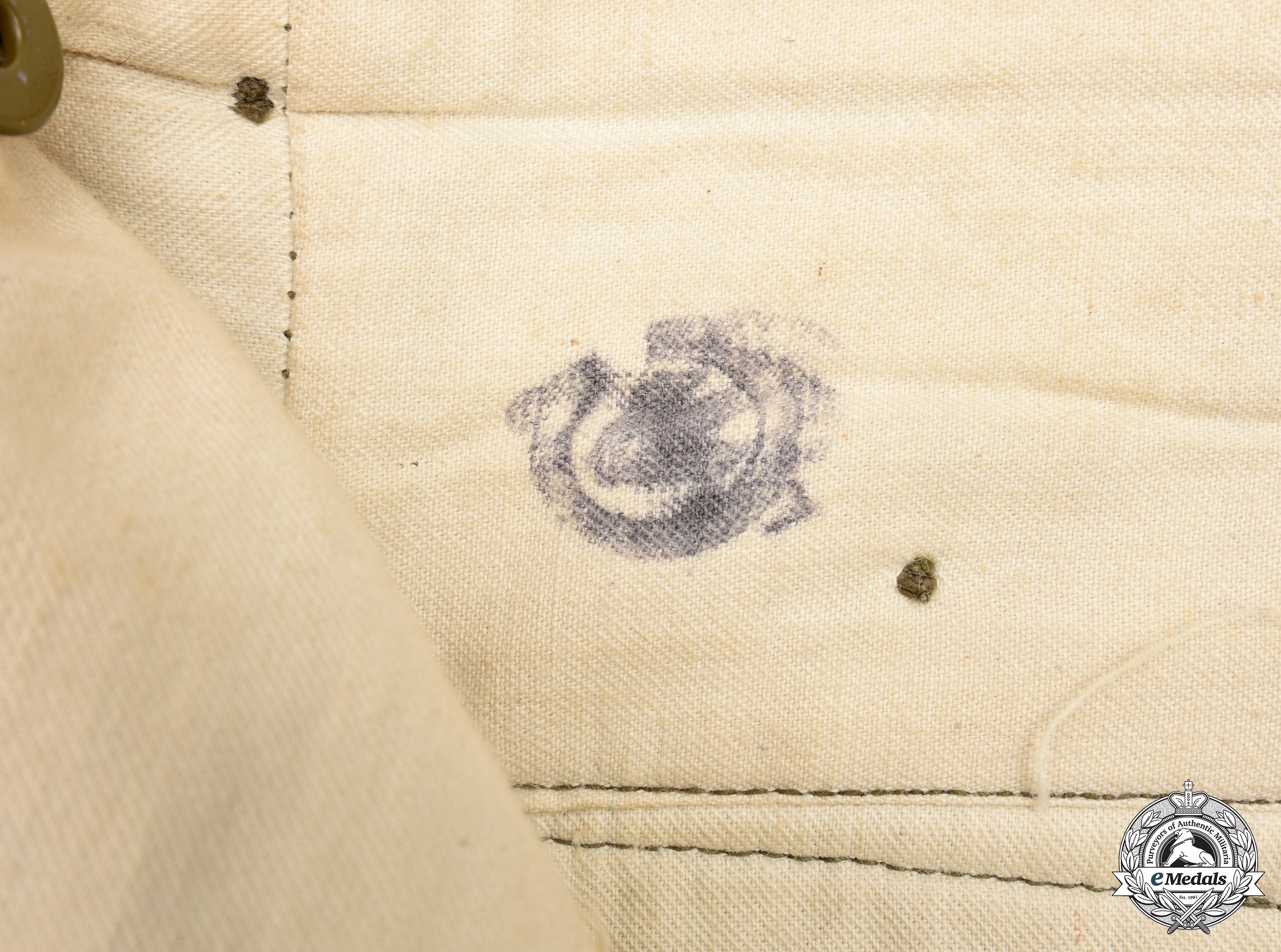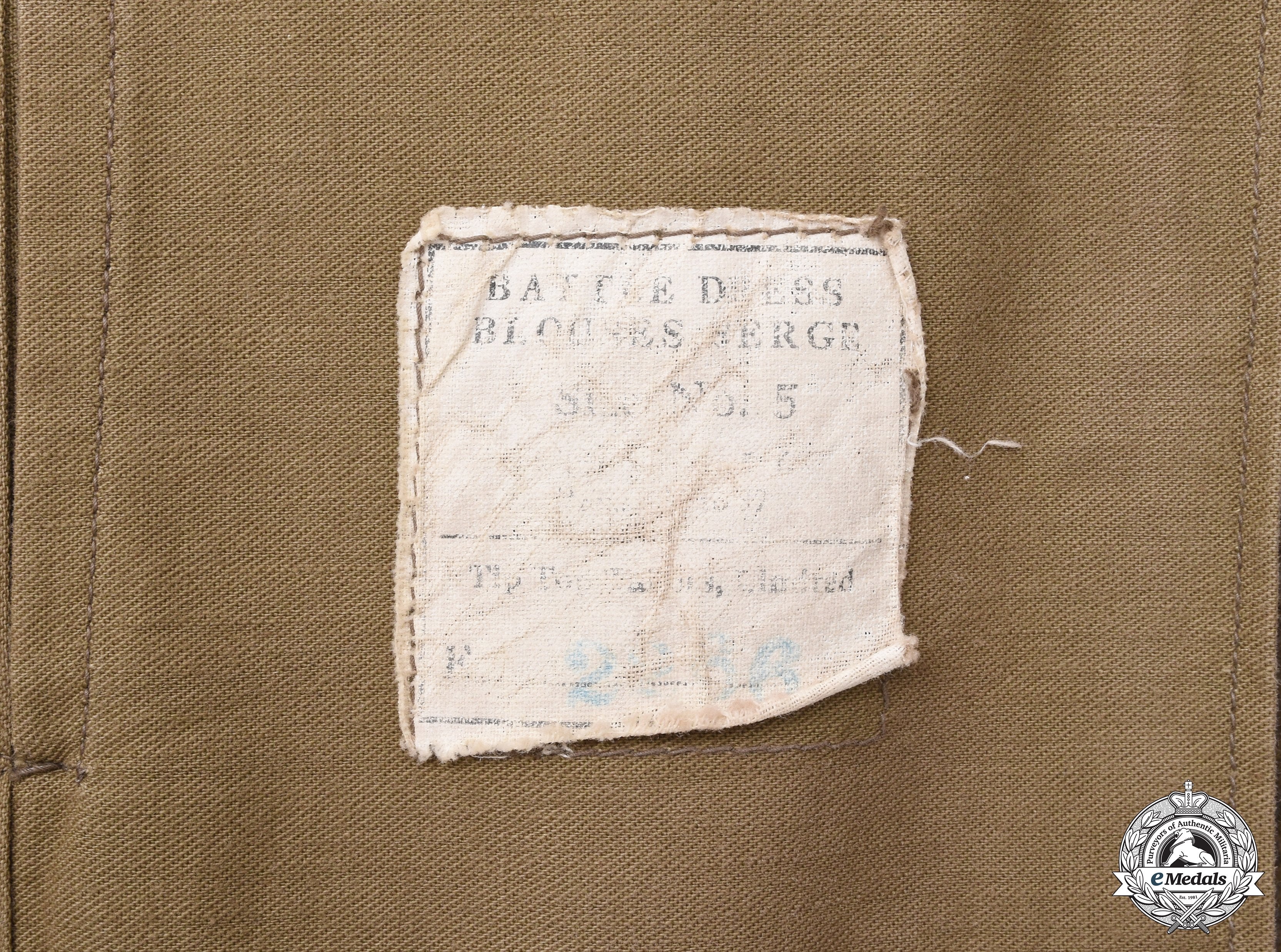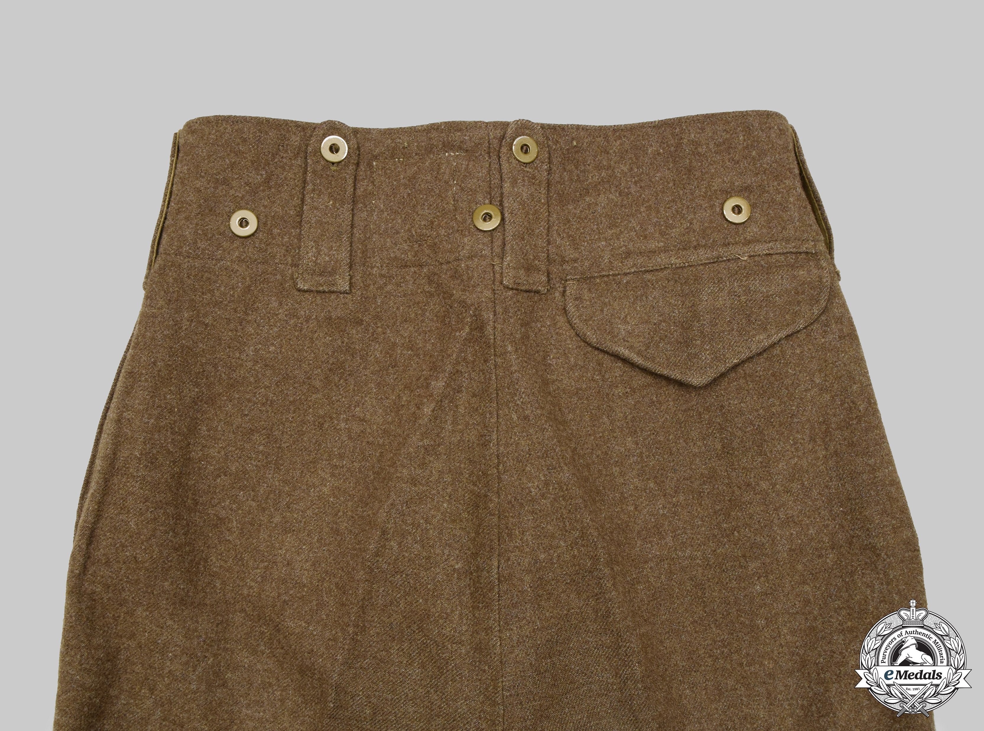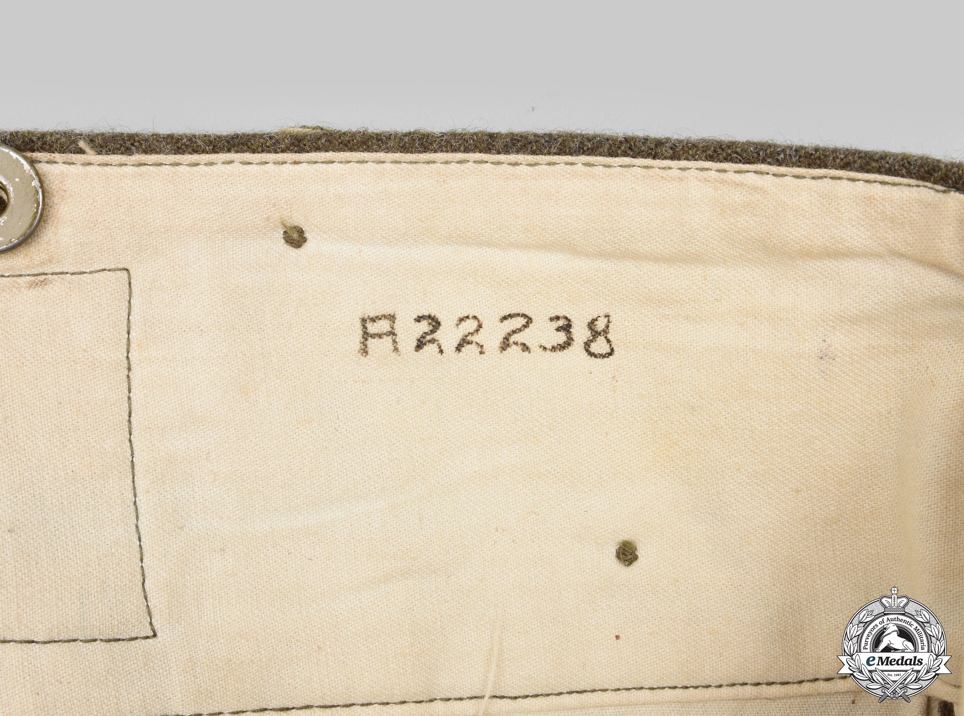 Includes six pieces: Battledress Blouse (exterior in wool with a green tinge to the darker khaki colour, giving it that distinctive Canadian-look versus the British version, of which the Canadian one is patterned after, adorned with CANADA shoulder flashes, along with 72 mm (w) x 47 mm (h) rectangular patches representative of the 8th Reconnaissance Regiment (VIII RECCE) in yellow, black and blue wool sewn in place on the upper sleeves on both sides, button down epaulette straps, the right strap held in place via a large brown plastic button, the left strap missing its button, with the threading for it remaining, the original button can still be found in the right breast pocket. There is a dual hook and eye on the collar ensuring a snug fit at the neckline, the front with two pockets, one on each breast which have decorative straps giving them a pleated-look with brownish-green finished metal buttons at the top, each pocket with a fold over flap and when lifted up, exposes a reinforced buttonhole, when the buttons are fastened, they remain invisible to the eye, covered by the flaps. There is a Canadian Volunteer Service Medal with Overseas Clasp, War Medal 1939-1945 and Defence Medal mounted to a suspension bar that is pinned in place via a swing bar pinback to the flap on the left pocket. The front has a vertical row of five brownish-green finished metal buttons on the right side, facing an equal number of reinforced button holes on the left side, similarly covered by a full-length flap, again remaining invisible to the eye, the waistline at the front with a strap on the left side, and when fed through the metal belt loop on the right side, ensures a snug fit at the waist. Both sleeves have button down cuffs with brownish-green finished metal buttons on both sides, with three reinforced ventilation holes in each armpit. Inside, the waistline is reinforced with a 72 mm wide cotton band, with three reinforced buttonholes at the rear, the inside lapel on both sides have deep cotton-lined pockets with side entries, the left side pocket stamped in black ink with the Canadian Broad Arrow production insignia, the right side pocket with a white cotton manufacturer's label inscribed in black ink "BATTLE DRESS / BLOUSES, SERGE / Size No. 5 / Tip Top Tailors, Limited" and number stamped "2068" in blue ink, the bottom edge stitching of the label having come away. The blouse measures 420 mm across the shoulders and 500 mm in length overall); Trousers (exterior in wool with a green tinge to the darker khaki colour, giving it that distinctive Canadian-look versus the British version, matching that used on the battledress blouse. They come with a button down fly, with five brownish-green finished metal buttons on the right side, facing an equal number of reinforced button holes on the left side, under a flap, and when fastened, remain invisible to the eye. There is a series of four large belt loops spaced at intervals around the waist and held in place via the same metal buttons as used on the fly, with three additional buttons at the waist at the rear in between the belt loops. It has three cotton-lined pockets, two on each side at the front with a traditional hip-side entry and one of the right rear seat with a metal button and fold over flap. In addition, there is a smaller button down pocket overlaying the right hip pocket, with a brownish-green finished metal button. Inside at the waist there are six more brownish-green finished metal buttons, plus two markings on the waistband: his service number "A22238" inscribed in black ink at the left rear and the Canadian Broad Arrow production insignia in black ink on the right side. The leg cuffs each have a two buttons on the outer side and one button with a tab on the inseam side, each of the buttons in brownish-green finished metal. The trousers measure 720 mm around at the waist x 1,050 mm in length overall); Side Cap (with a finely textured greenish brown cotton/wool blend exterior, with fold down panels held up via two hook and eye closures on either side, the end straps secured at the front via two small brass Canada General Service insignia buttons, a 50.8 mm (w) x 49 mm (h) silvered and gilt 8th Reconnaissance Regiment (VIII RECCE) cap badge affixed in place via lugs and pin on the left side, the interior lined in black cotton, with a 48 mm wide moss green cotton sweatband, stamped in white ink with the Canadian Broad Arrow production insignia in the dome and maker marked "NATIONAL HAT MFG. CO.", dated "1940" and size marked "7 1/2" within a circular border at the right front, the cap measuring 310 mm (w) x 115 mm (h)); Essex Scottish Regiment Shoulder Title (which was banned from being worn while overseas: in brass, measuring 48 mm (w) x 19.5 mm (h), both lugs and pin intact); General Service Badge (in sterling silver with red and blue enamels, numbered "015267" on the reverse, button hole attachment with blue wool swatch backer, measuring 14.5 mm (w) x 21.8 mm (h)); and Canadian Volunteer Service Medal Ribbon Bar (silver maple left on its original ribbon, measuring 31.5 mm (w) x 10.5 mm (h)). The wool used in the blouse and trousers display nice texture and quality workmanship, retaining their original look through quality stitching and the high grade materials used. Extremely fine.