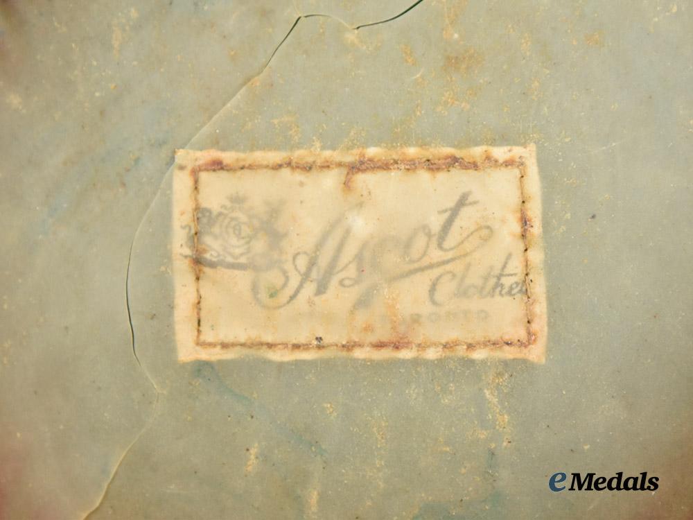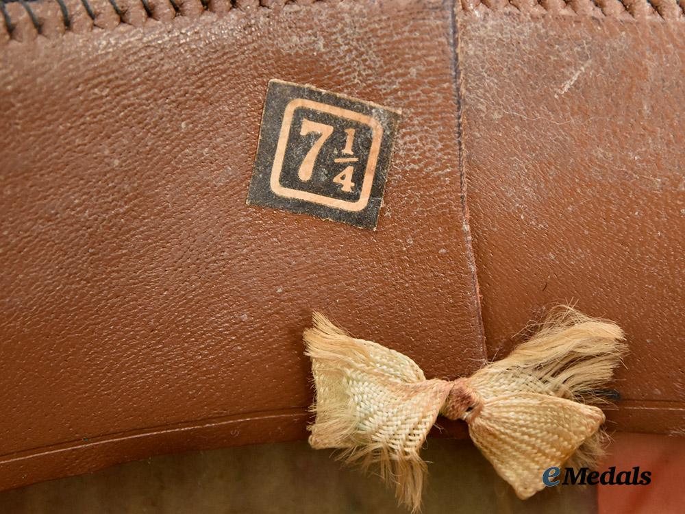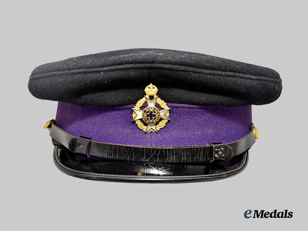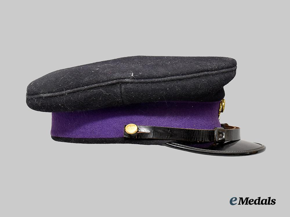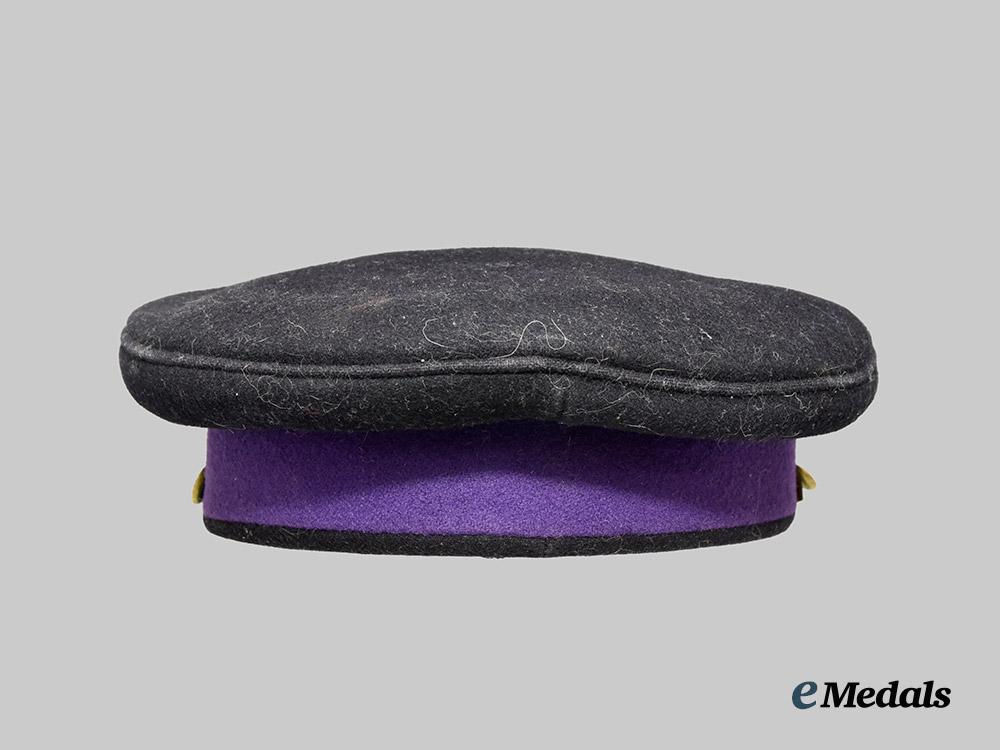 1. Canadian Chaplain's Service Officer's Cap: this fine quality cap has a 45 mm wide purple wool band, with the body of the cap fabricated from a black wool, in the traditional flat top design with raised peak. The front is adorned with a 33.5 mm (w) x 44 mm (h) Canadian Chaplain Service Cap Badge, composed of two pieces, the Chaplain's insignia in gilt metal with purple enamels, mounted to a silvered cross base fronting a gilt wreath composed of oak leaves and laurel leaves, along with being surmounted by the King's crown. The black patent leather visor has a black two-piece patent leather strap resting along the top edge, with two length adjustment sliders, held in position via brass buttons bearing the Canadian Army insignia, the insignia illustrating crossed swords and three maple leaves, with the King's crown above and "CANADA" below. The underside of the visor has a hunter green synthetic finish, the visor itself very stiff. The 45 mm wide sweatband is fabricated from a pecan brown leather, with the two ends held together at the rear by a white ribbon which is finished in a bow-tie, incorporating a "7 1/4" size label nearby. The front of the sweatband over the visor has an additional reinforcing patch of synthetic deerskin leather stitched to the leather sweatband, aiding in restricting sweat from the wearer's forehead. The sidewalls and dome are lined in emerald green felt, the dome covered with a semi-transparent moisture-resistant fabric shield with a manufacturer's label affixed to the underside of the covering inscribed "Ascot Clothes TORONTO", the cap measuring 250 mm in width x 250 mm in depth x 100 mm in height. It exhibits moderate soiling in the black wool on the exterior, crazing in the black patent leather on the strap resting upon the visor, with extensive cracking and soiling present on the moisture-resistant shield, along with light soiling on the leather sweatband and the attached synthetic deerskin leather patch. However, it continues to exhibit smooth quality in the wool, plus quality workmanship, intact stitching, maintaining its original period look and is free of mothing, As worn.