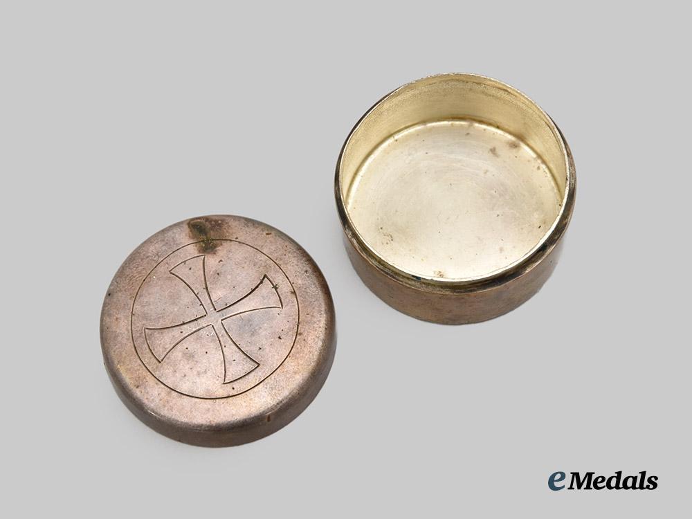 3. Communion Wafer Container: in silver, two pieces consisting of a lid and base, cross within a circle engraved on the lid, measuring 41.5 mm in diameter x 15.7 mm in height, one small discolouration mark on the lid, spotting on the underside of the base.