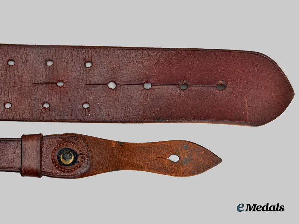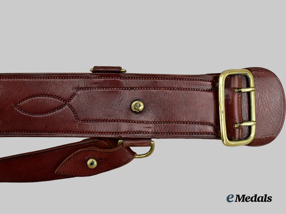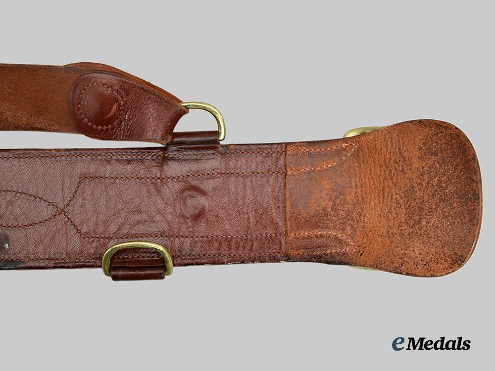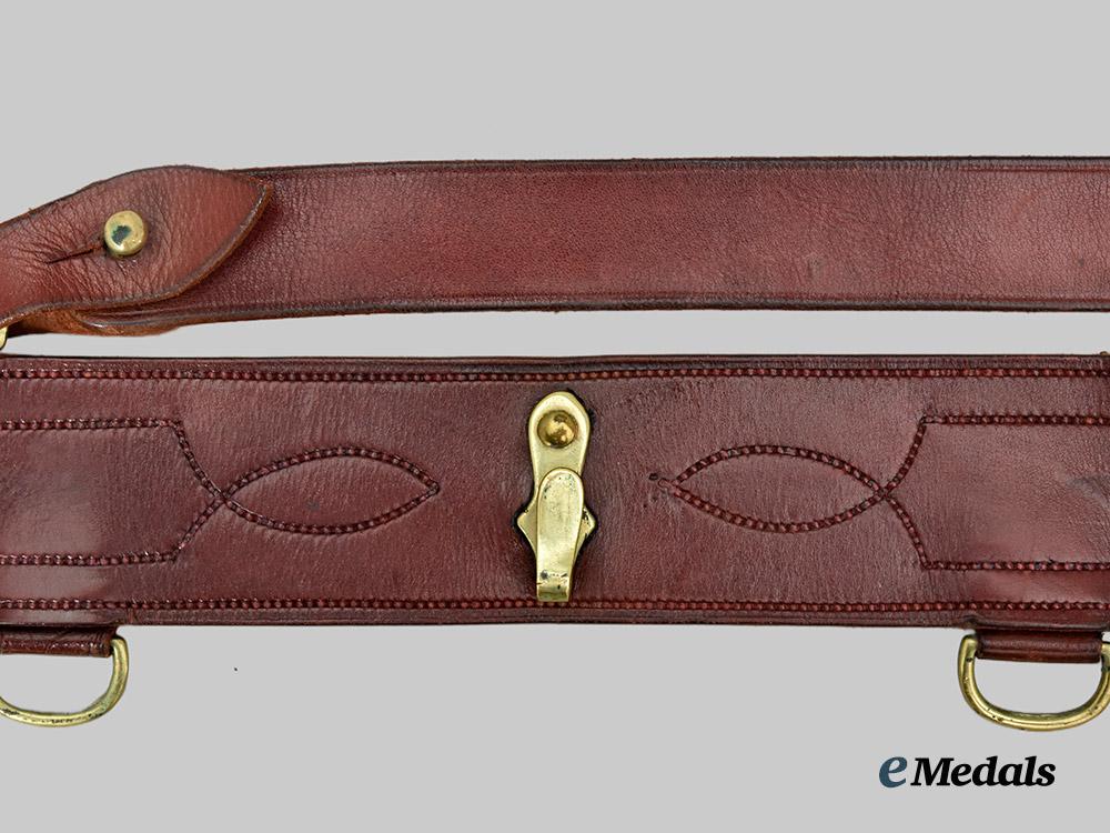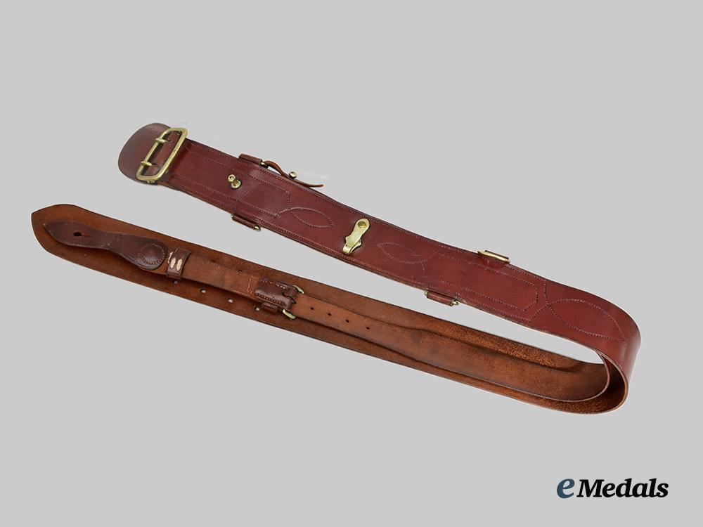 2. Uniform Leather Belt: waist belt with an upper bearing a cinnamon brown finish, the majority of the underside with a raw look and incorporating a lacquered smooth-finished leather patch stitched in place on the left end, each of the smooth-finished pieces displaying an intricate design, with brass fittings that includes a dual-prong buckle, post, hook and four u-shaped loops on the left end, the right end with three rows of five holes each for length adjustment, the middle row of five holes slotted, measuring 55 mm in width x 1,180 mm in length. Attached to one of the u-shaped loops is a shoulder strap with a two-piece construction, with a sienna brown upper and raw underside, the strap with a single-prong buckle and a single row of seven holes for length adjustment, the strap with two leather loops and brass post, the far end of the shoulder strap with a slotted hole for placement upon the brass post, the shoulder strap measuring 32 mm in width a 100 mm in length. Some greening evident on the brass fittings on both straps.