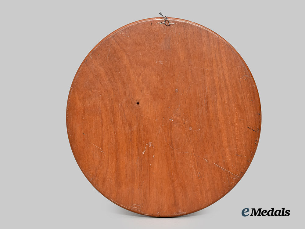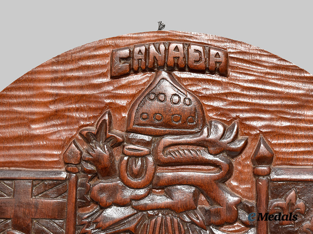 In wood, the featured image and text in high relief and appearing dark, contrasted by a chiseled background of which is performed in lateral strokes, illustrating the inscription "CANADA" above the Canadian coat-of-arms that is featured below, measuring 385 mm in diameter, with a lacquered finish, incorporating a wire dual-stapled on the reverse for wall hanging, near extremely fine.