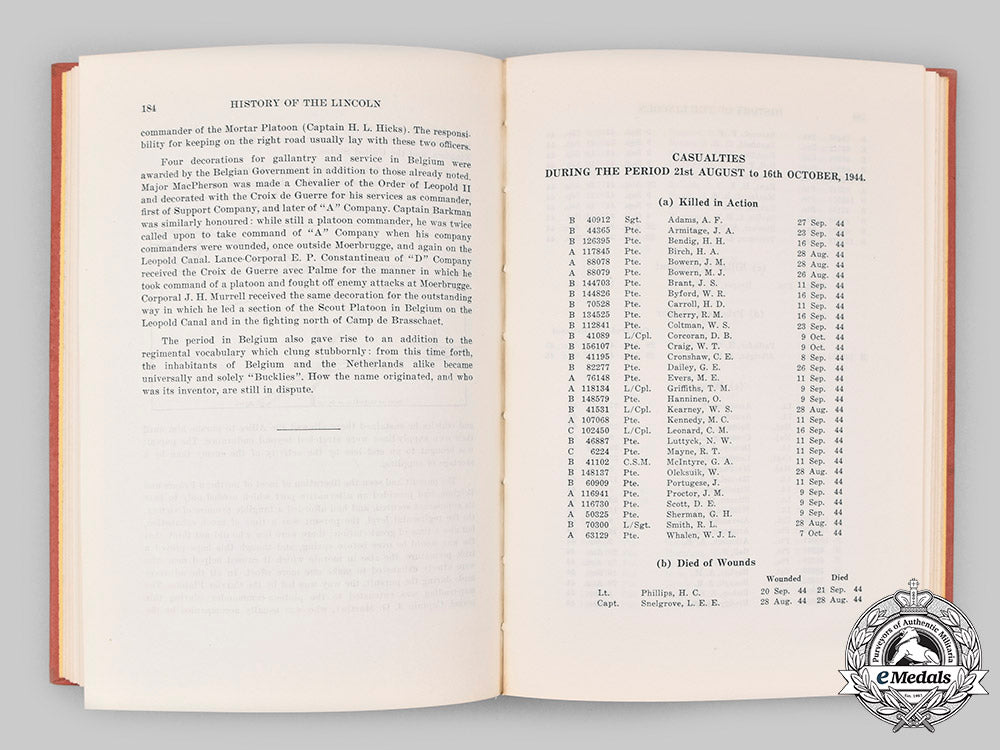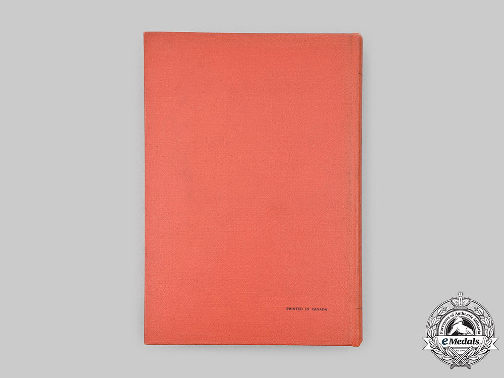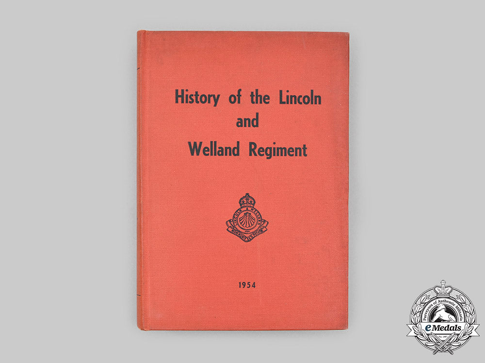 Hardcover, red cloth cover, entitled "History of the Lincoln and Welland Regiment" by Major R.L. Rogers, printed in Canada in 1954 by the Industrial Shops for the Deaf in Montreal, Quebec. It documents the history of the regiment, starting with the War of 1812, through the First World War and finishing with the Second World War. It begins with a Foreword by Lieutenant-Colonel M.J. McCutcheon, the Commander of the Regiment as of 1954, followed by an Introduction and a Table of Contents. It is divided into twenty-one chapters: I - The Lincoln Militia in the War of 1812; II - The Organization of the 19th and 44th Battalions; III - 1867-1914; IV - The Great War of 1914-1919; V - 1919-1939; VI - Mobilization; VII - Service in Canada; VIII - Service in Newfoundland; IX - Training in the United Kingdom; X - Operation "OVERLORD"; XI - The First Fortnight; XII - The Falaise Gap; XIII - The Pursuit into Belgium; XIV - The Drive to the Maas; XV - The Winter on the Maas; XVI - Kapelsche Veer; XVII - Operation "BLOCKBUSTER"; XVIII - Operation "HAYMAKER"; XIX - Operation "ECLIPSE"; XX - Reallocation; XXI - Demobilization. It concludes with eight Appendices, the last of which is the Nominal Roll of Officers and Men who served with the Regiment between August 26, 1939 and January 29, 1946, plus an Explanation of Abbreviations used in the Appendix. The book contains 478 pages of text along with eleven line drawn maps, printed in black ink, on an off-white paper stock, plus a series of black and white photographs with taglines on a coated stock dispersed at various intervals throughout the book, measuring 158 mm (w) x 235 mm (h) x 38 mm (d). It exhibits light foxing on the top of the pages, along with light discolouration on the red cloth cover, the contents of the book remaining pristine. Near extremely fine.