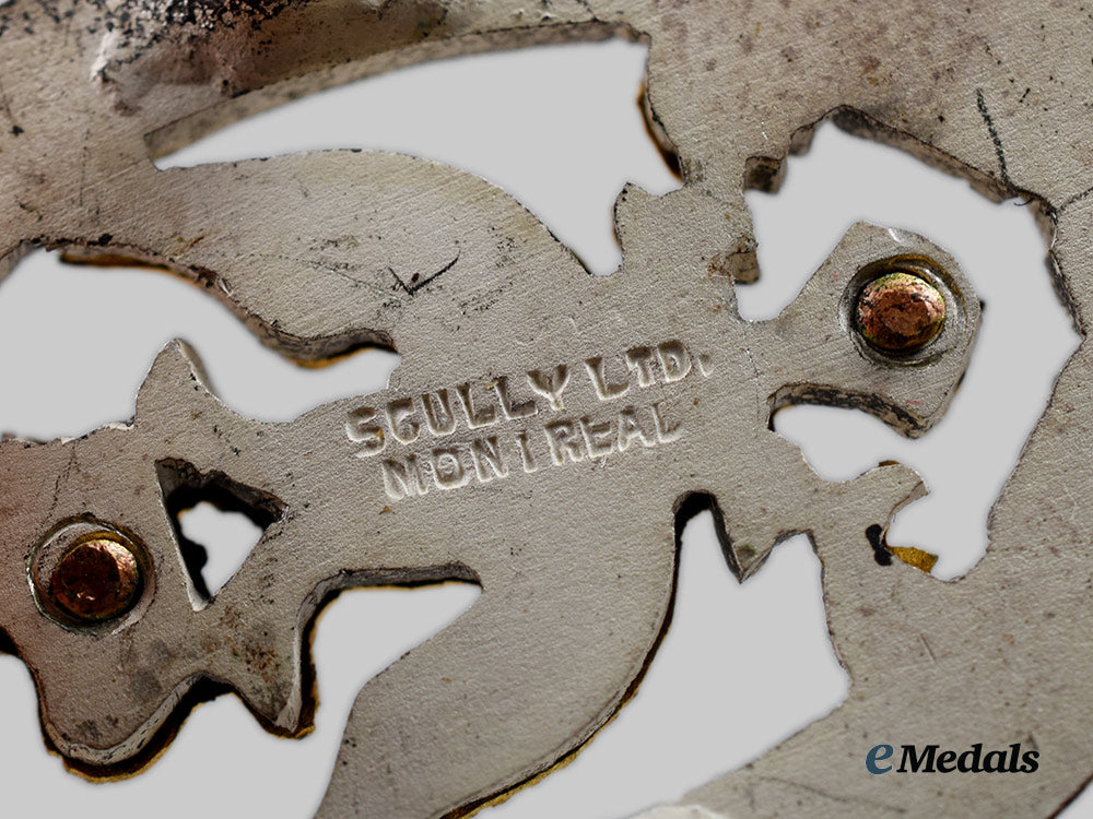 2. two Collar Badges: two-piece construction, insignia in fire gilt bronze, mounted to a base in frosted silver, maker marked "SCULLY LTD. MONTREAL" on their reverses, measuring 27 mm (w) x 32 mm (h) each, both lugs intact on the badges, scattered silvering wear on the edges of both.