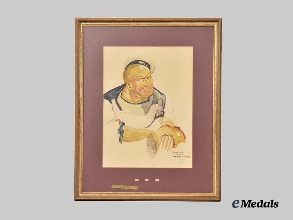 1. Watercolour on paper, "Old Salt", Congenial Diver Naden I Step/42, measuring 41 cm x 51 cm in wooden frame;