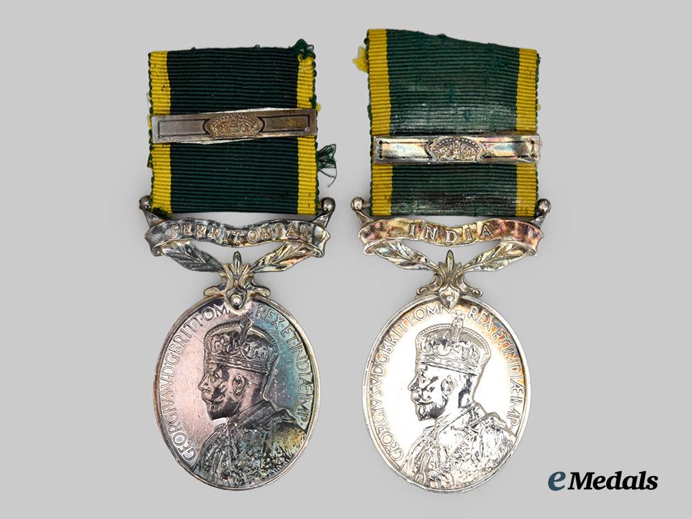 1. Instituted mid 1930. A silver oval medal, suspended from a single-toe claw attached to the center of the award with a slotted bar, suspended from their period-original ribbons (with evidence of previous collector’s mounting), with an “India” bar, the obverse depicting a crowned and robbed effigy of George V, inscribed “Georgius V.D.G. Britt Omn Rex Et Indiae Imp” in capital letters, the reverse inscribed “For Efficient Service” in capital letters, officially impressed “Bombor J. Henderson, Bengal Arty A.F.I” along the rim, measuring 32.2 mm (w) x 58.7 mm (l), weighing 31.16 grams.