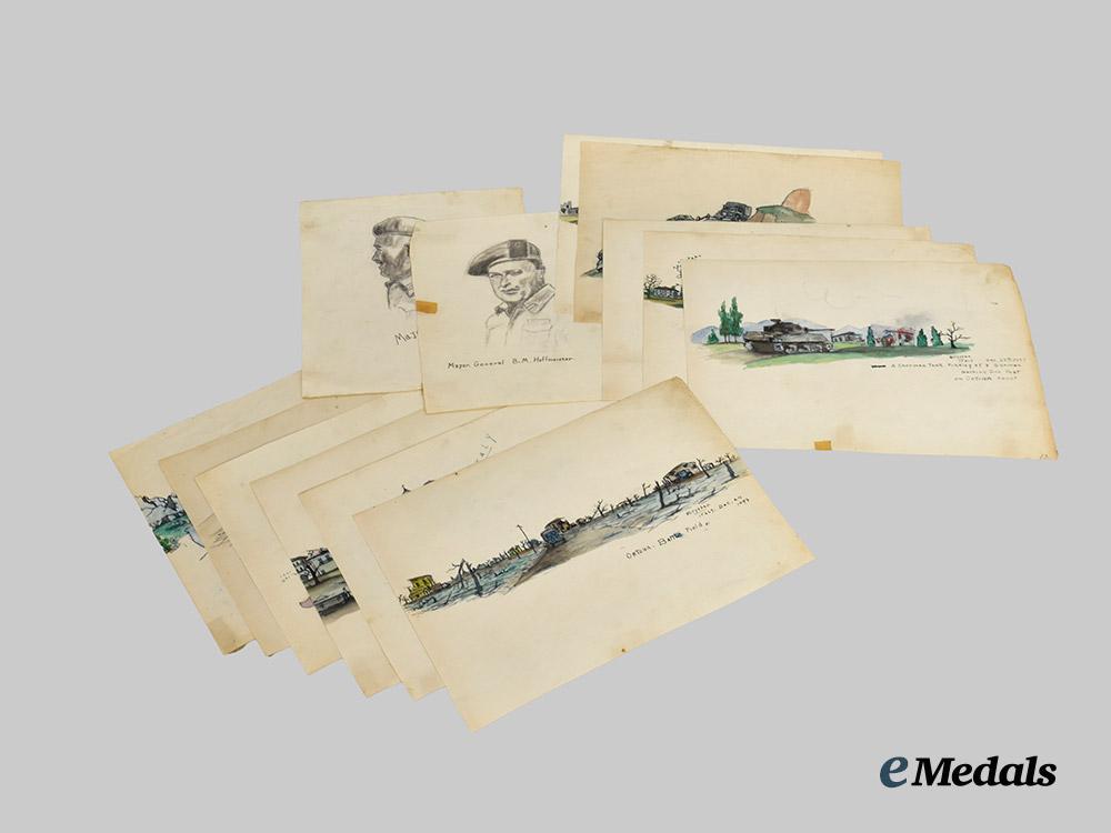 A collection of well-preserved watercolour drawings, painted by a Canadian soldier who fought in Italy during World War 2. The drawings were completed during and after the Battle of Ortona, which ended on 28 December 1943. Included in this group are two portraits of Major General Vokes, who led the 1st Canadian Infantry Division, and Major General B.M. Hoffmeister, who led the 5th Canadian (Armoured) Division. The rest of the collection features various landscape scenes from Ortona in December and January of 1944. Accompanied by three bills from Greece, France, and Italy (500 drachmas, 5 francs, 5 lire). Housed in a binder. All in extremely fine condition.