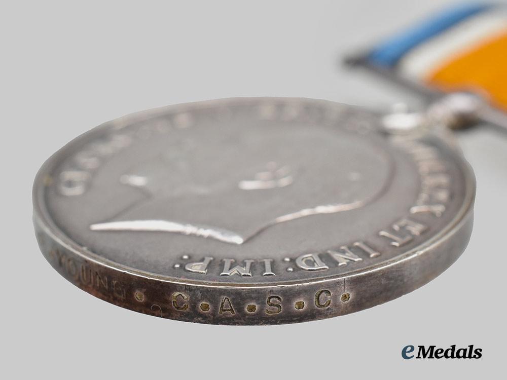 1. A British War Medal. Instituted July 26th, 1919. Consisting of a circular silver medal, suspended from a single-toe horizontal medal bar from a period original ribbon, the obverse depicting the leftward facing effigy of King George V and inscribed “Georgivs V Britt: Omn: Rex Et Ind: Imp:” (George V, King of all the British Isles and Emperor of India) in capital letters, the reverse depicts Saint George naked on horseback and armed with a sword, the horse trampling on the Prussian eagle shield as well as skull and crossbones, along with ocean waves and a rising sun in the background, as well as the years “1914” and “1918”, inscribed on the edge “113649 PTE. P. YOUNG. C.A.S.C”, measuring 36.2 mm in diameter, the ribbon with extensive sticky remains from previous collector mounting, along with a square un-tarnished surface on the reverse, previously refinished on the obverse, in better than fine condition.