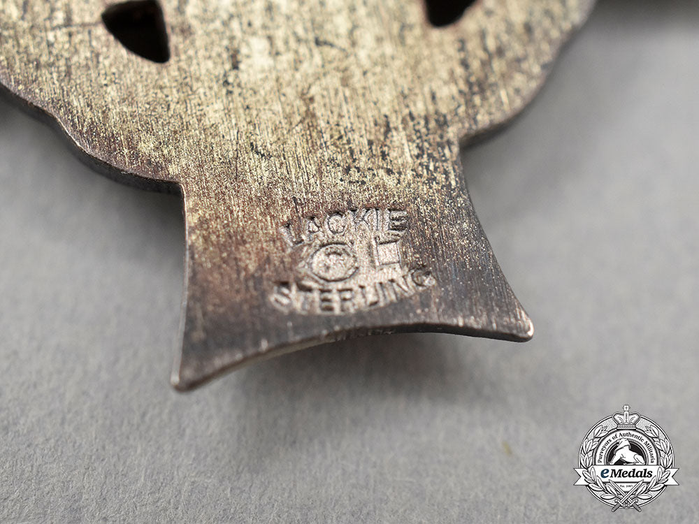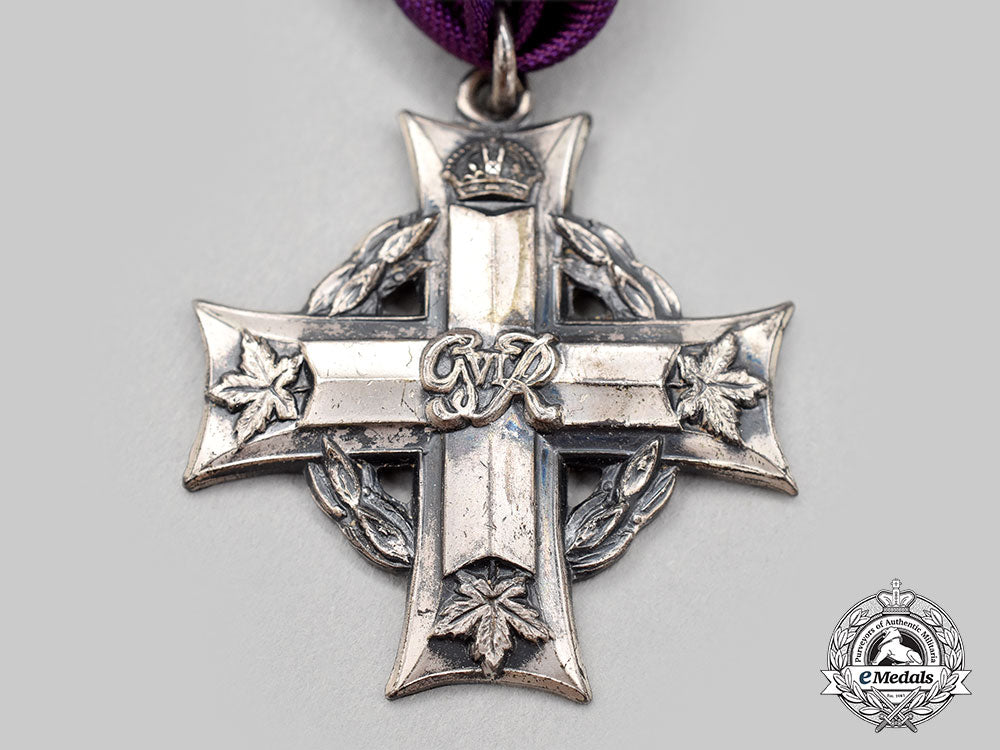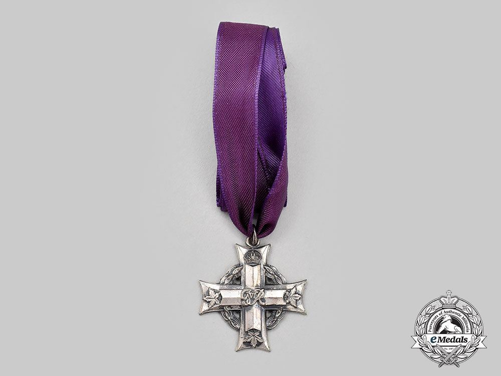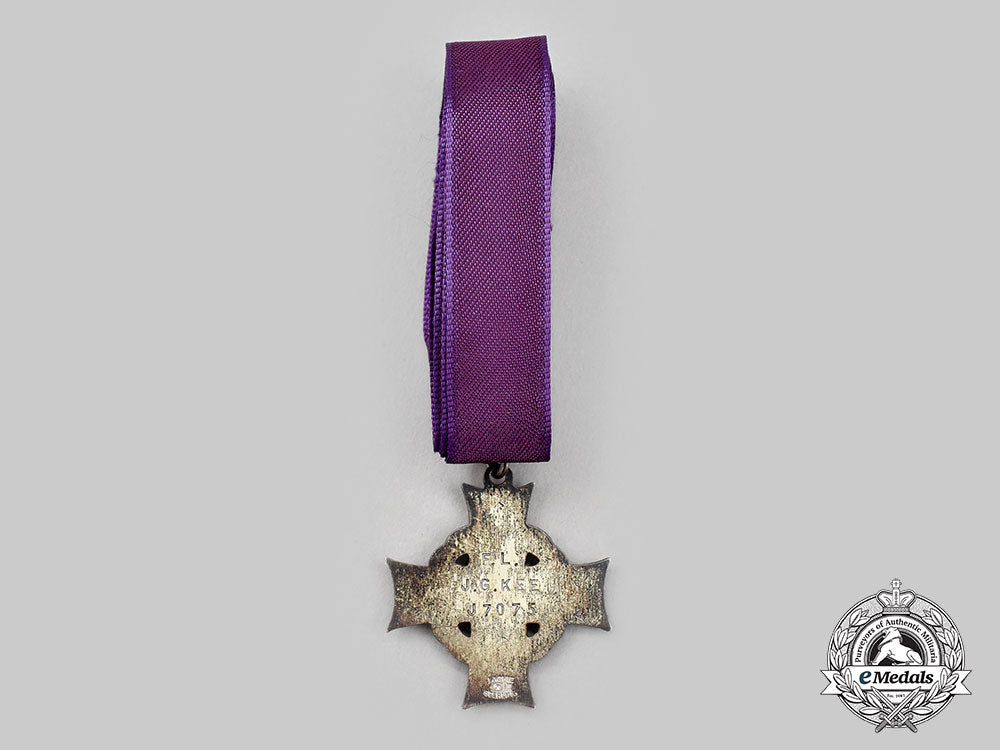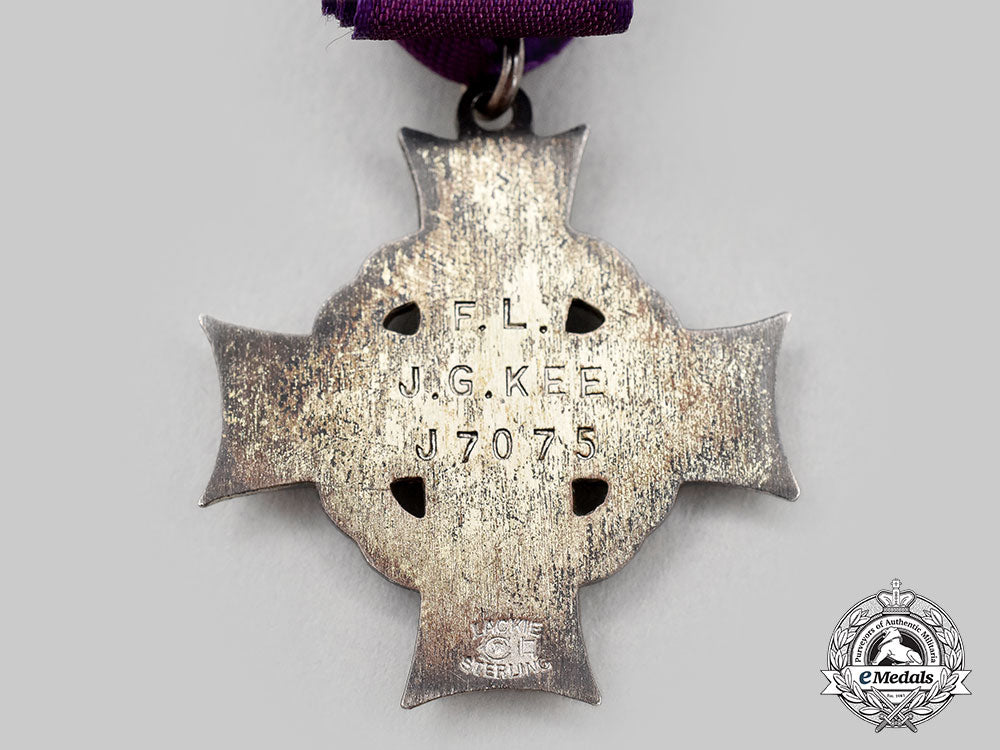 A Memorial Cross, in silver, reverse engraved F.L. J. G. KEE J7075, 6 o’clock arm marked LACKIE STERLING, measures 32.4mm (w) x 34.6mm (h – integral ring), worn on original purple neck ribbon, lovely patina, minimal wear, in extremely fine condition.