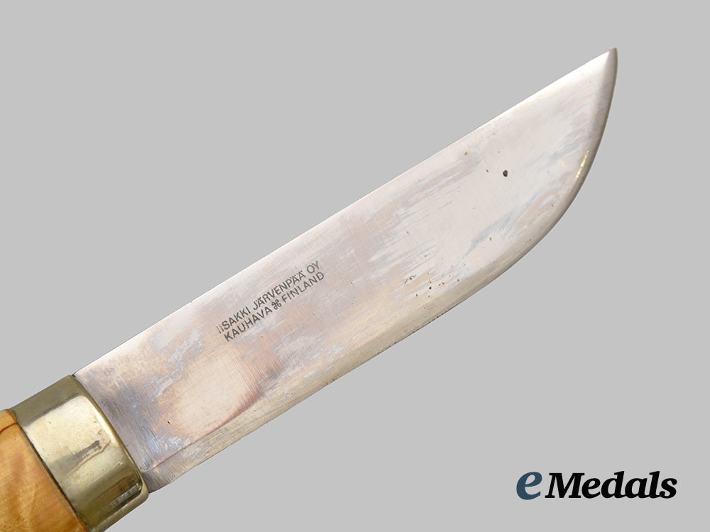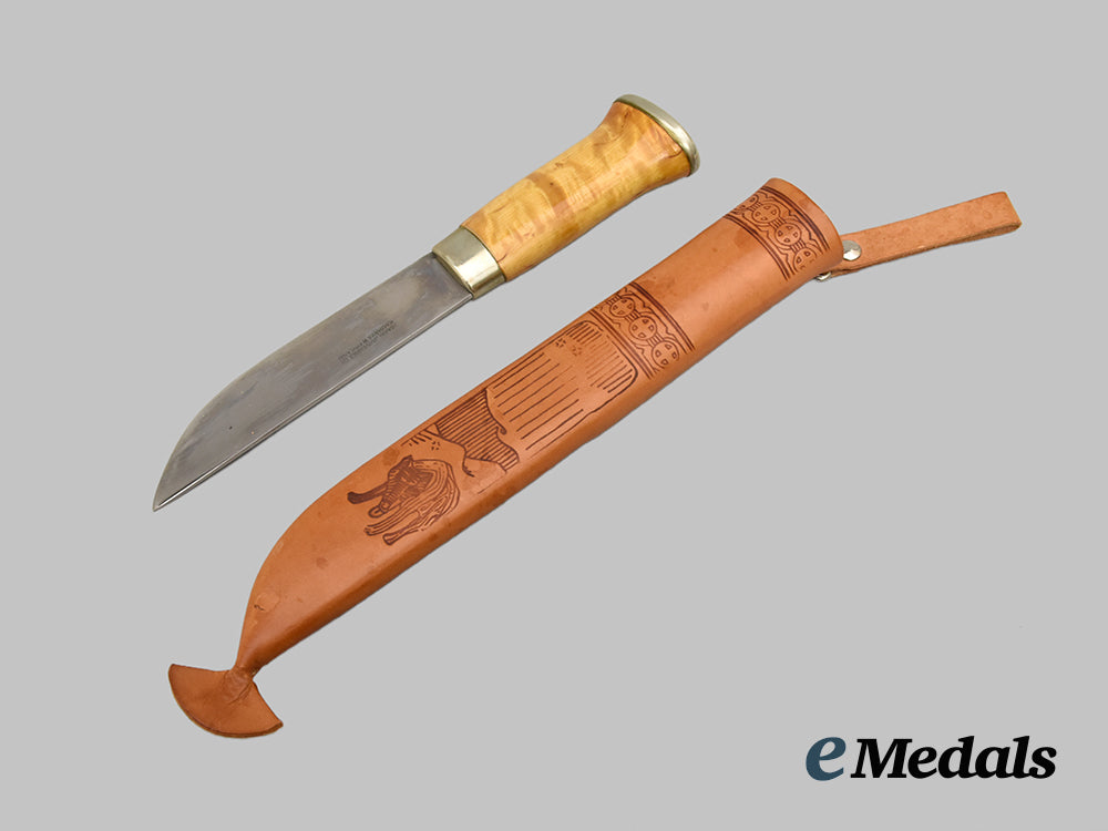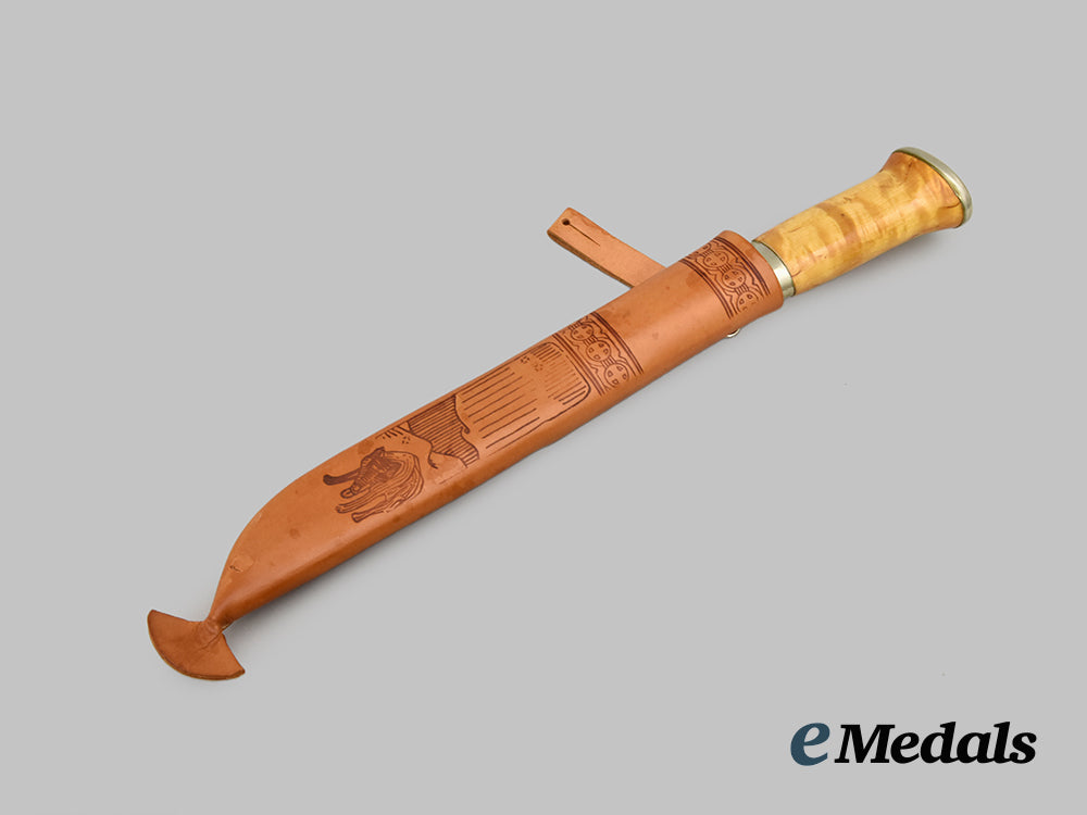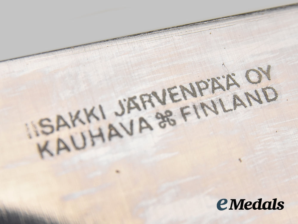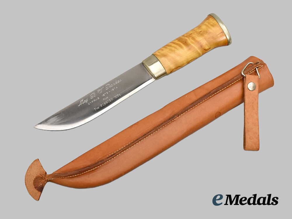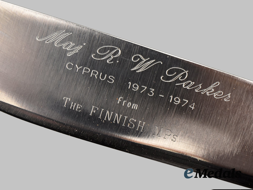 Dagger Awarded to Major R. W. Parker By Finnish MPS, 1974; Dagger measuring 30 cm in total length when inserted into the scabbard, features a 15cm-long, stainless steel blade with a sharpened tip, handle made from curly birch wood, obverse inscription reads “Maj. R W Parker / CYPRUS 1973-1973 / from The Finnish MPs”, reverse bears Lisakki Järvenpää signature, extremely fine condition. Sheath is nicely detailed with stamped and stained artwork, with belt loop, extremely fine condition.