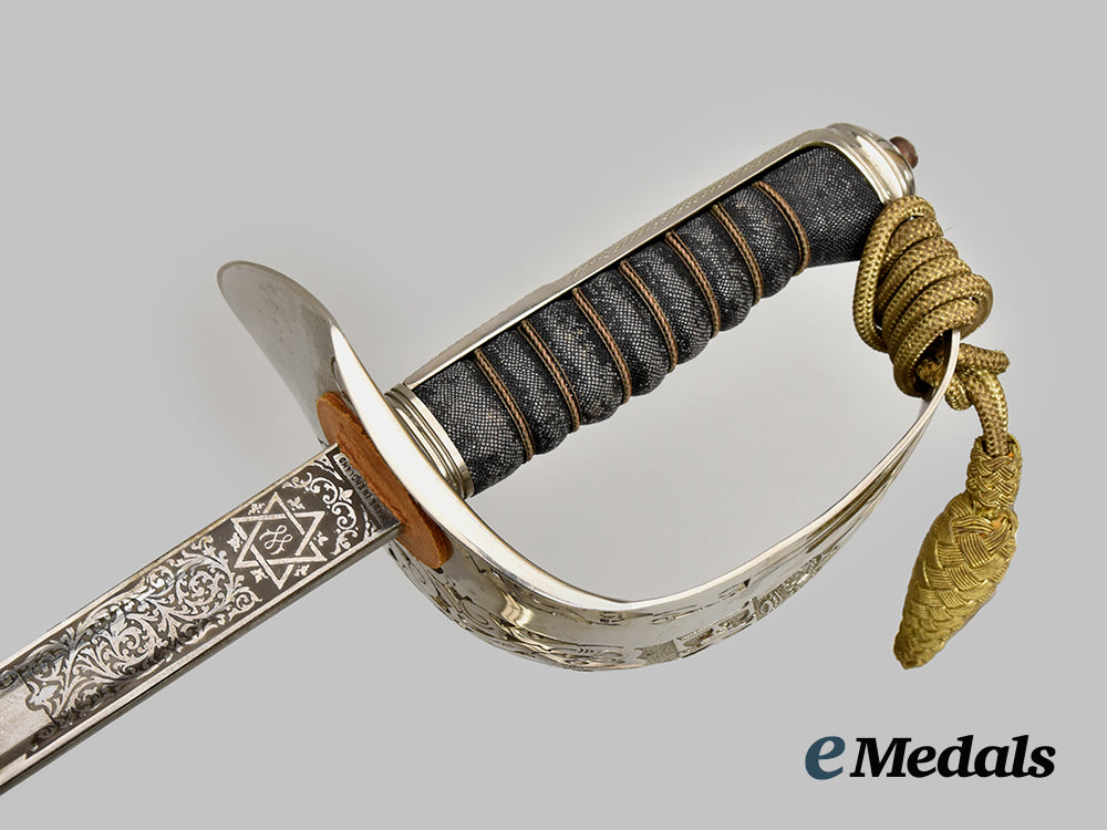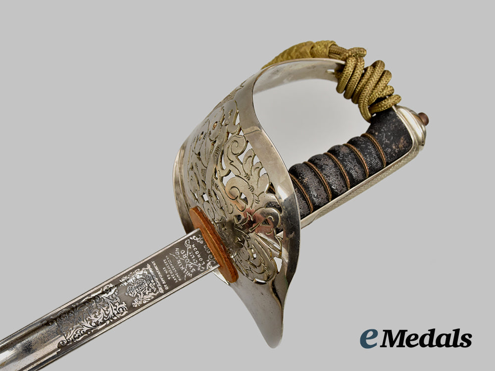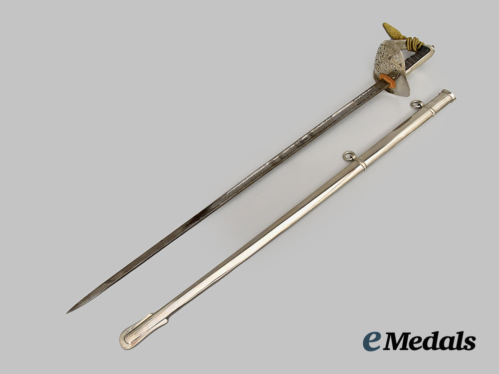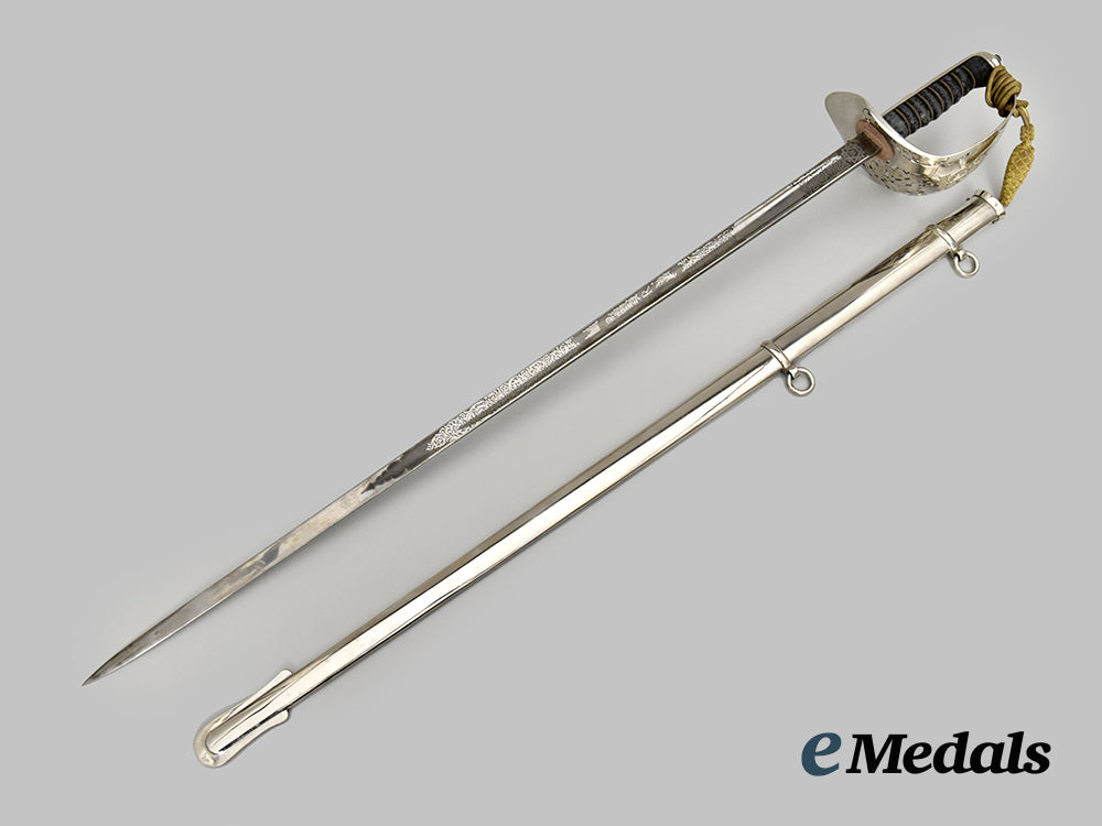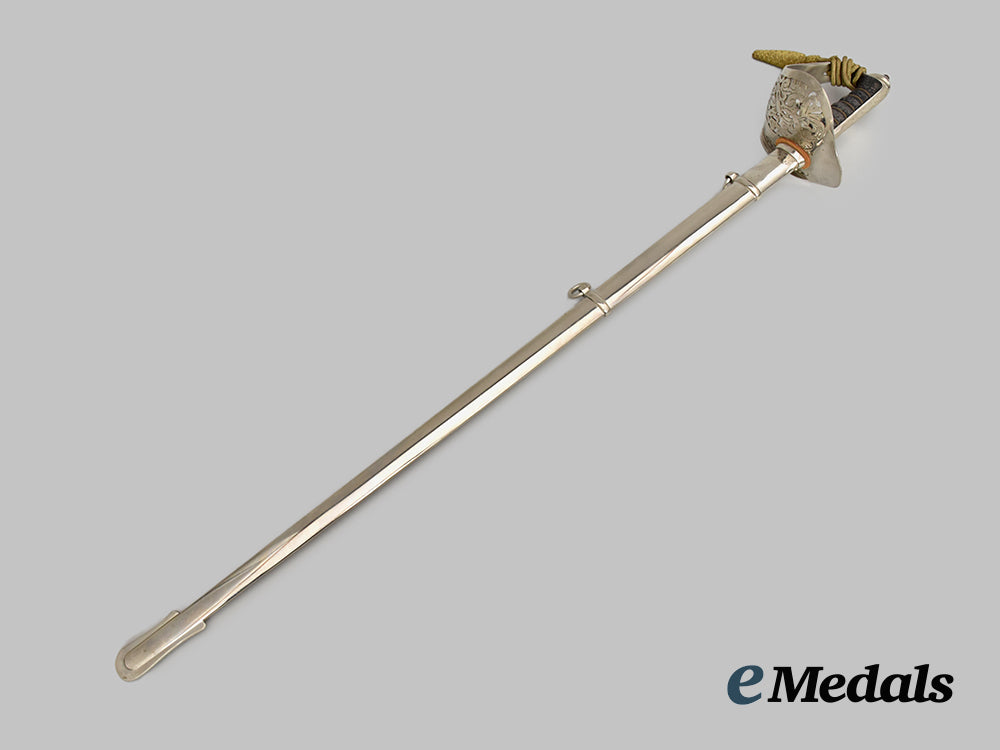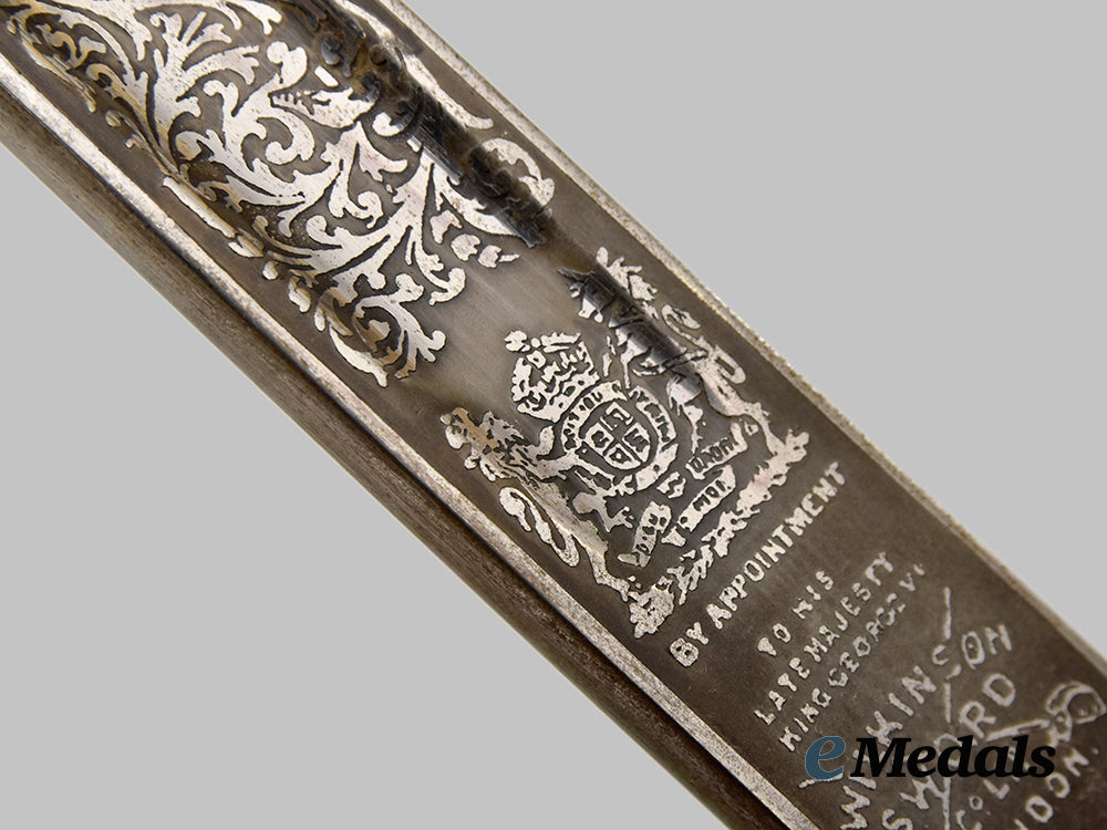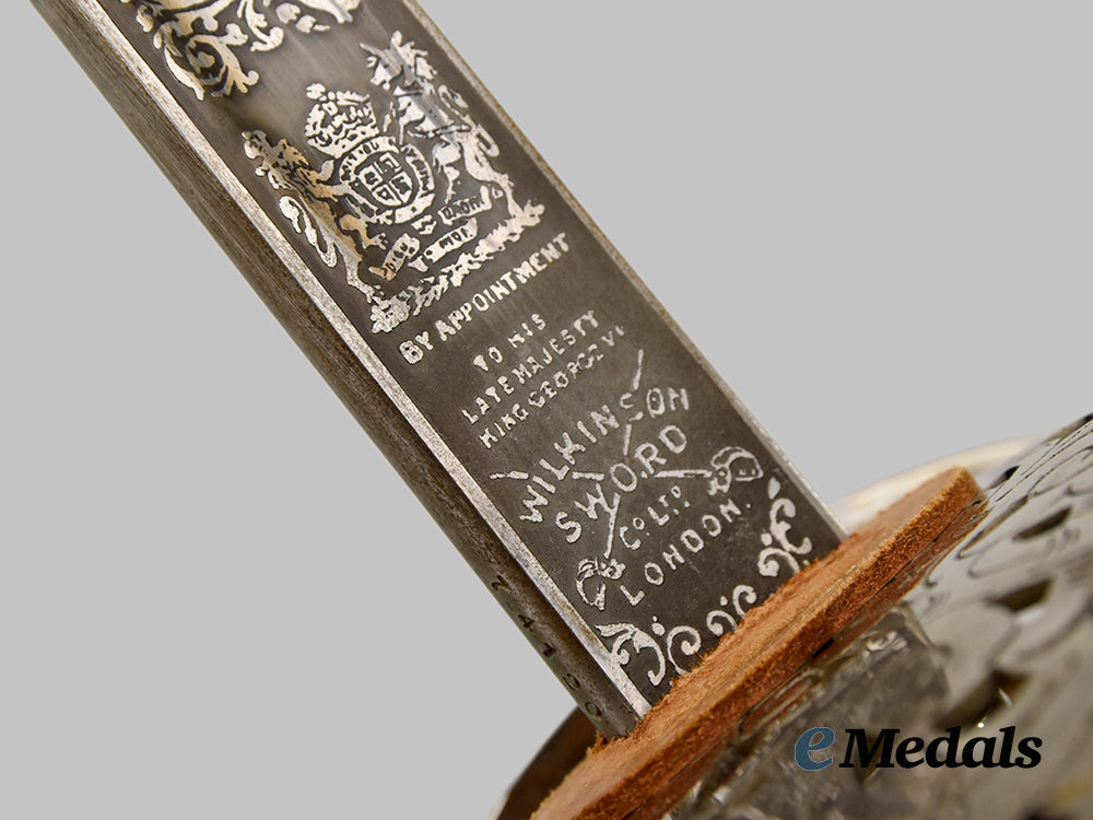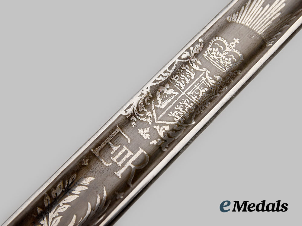 Elizabeth II 1897 Pattern Infantry Officers Sword; Wilkinson sword measuring 100 cm in total length when inserted into the scabbard, decorated basket hilt with Queen Elizabeth II cipher, twisted grip wire bindings with a gilded sword knot, inscribed initials RWP on scabbard and hilt, serial number 74120 on the spine. Housed in a silver scabbard, evidence of some scratches, very fine condition.