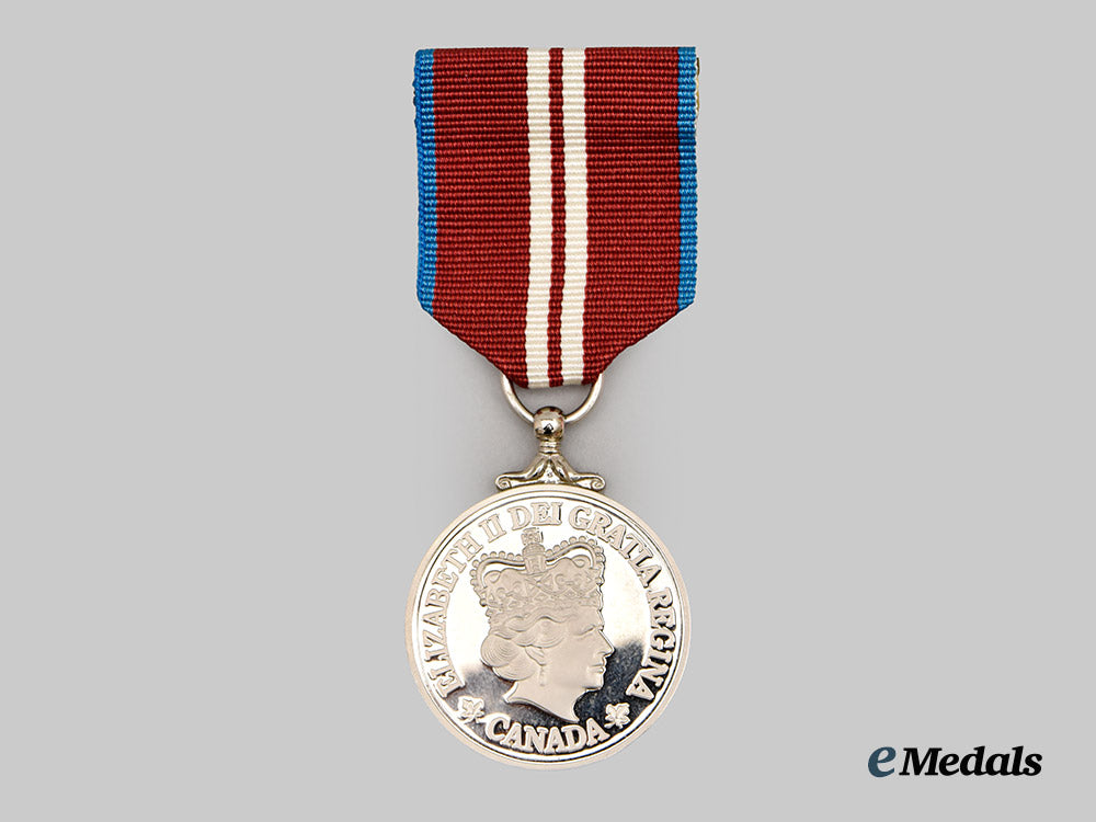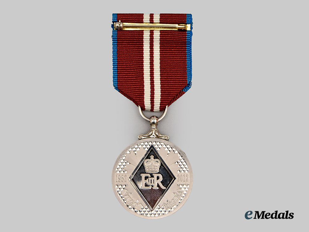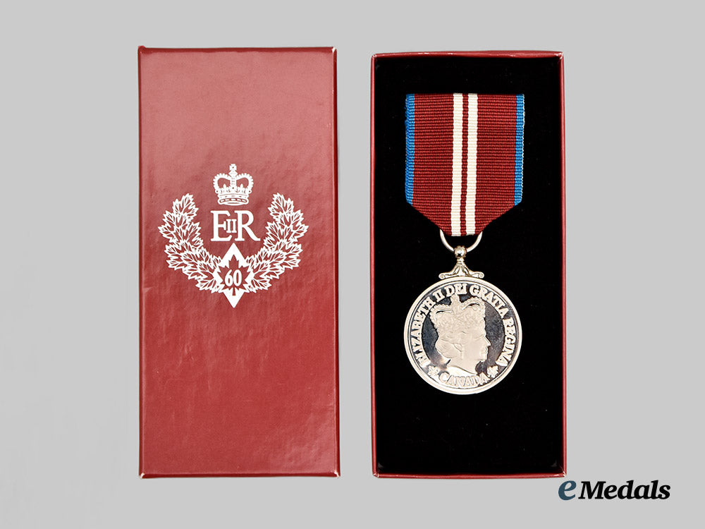 (Médaille du jubilé de diamant de la reine Elizabeth II). Instituted February 6th, 2012. A round silver medal, suspended from a single-toe claw with a pierced ball and swivel ring suspension from its period original ribbon featuring a horizontal pinback, the obverse featuring a crowned effigy of Queen Elizabeth II and circumscribed with “Elizabeth II dei Gratia Regina” and “Canada” between two maple leaves, the reverse features Elizabeth’s royal cypher crowned and superimposed on a diamond shield on a bed of four maple leaves and a ribbon with the dates “1952” and “2012”, inscribed “Vivat Regina” (Long Live the Queen) below, all on a field of diamonds, unmarked, measuring 32.2 mm in diameter, weighing 24.39 grams, accompanied by its presentation box, constructed of red cardstock, the exterior of the lid embossed with the crowned Royal Cypher of Queen Elizabeth II between stems of maple leaves with “60” superimposed on a single Maple leaf within a diamond, the interior with a black recessed insert for placement of the award, measuring 54 mm (w) x 118 mm (l), in mint condition.