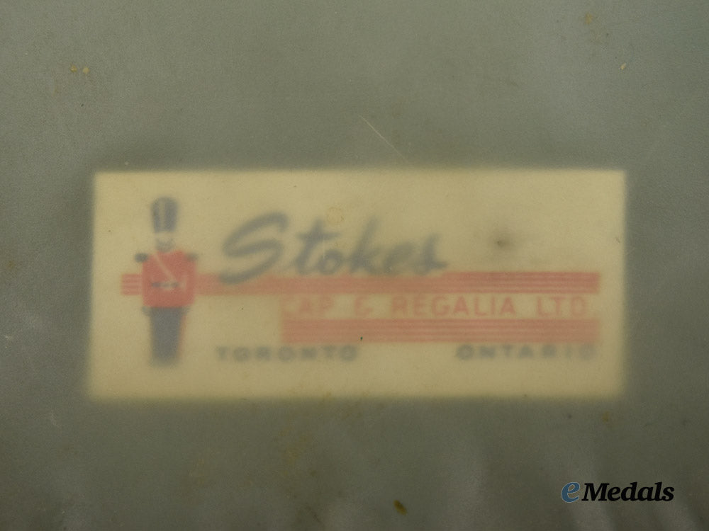 This fine quality peaked cap is the reinforced "stiff" top issue, the body of the cap fabricated from a grayish-blue wool-cotton blend, the classic high peak, wide black band around its circumference, which was designed to support the RCAF insignia at the front as evidenced by the two strands of black threading, however, the insignia has come away from the cap but is included. The cap badge insignia has a King's crown in rolled silvered and gold-coloured bullion wire, the void of the crown in maroon felt, with touches of red and green embroidery in the crown's base, the RCAF eagle in brass between the crown and the leafing, the latter in rolled and twisted gold-coloured bullion wire, all on a black wool base and padded, with a black fabric backer. The stiff visor in black vulcan fibre and incorporating two facing branches of oak leaves in rolled and beaded gold-coloured bullion wire, along with a black patent leather strap with two length adjusters running across the front between the black posts on both sides, the underside in green. Each side of the cap has two black-finished grommets in place, to aid in ventilation, the interior with a simulated leather sweatband and incorporating brown suede patches on either side, the ends of the sweatband joined together at the back and are bow-tied in place with a white ribbon, the dome is concealed under an intact green-tinted moisture shield with a "Stokes Cap and Regalia Ltd Toronto Ontario" manufacturer's label visible through the shield, measuring 240 mm x 250 mm x 120 mm in height. In addition to the cap insignia having come away from the cap, it exhibits greening on its bullion wire, along with black threading where it has broken away from the cap. There is a small hole on the peak of the cap that exposes the green interior underside of the cap construction, otherwise, the cap is free of interruptions in the fabric, with only some crazing on the visor. As worn.