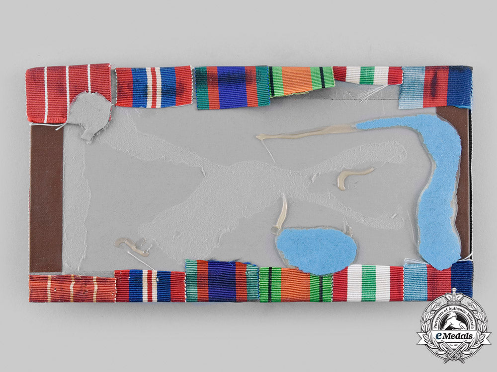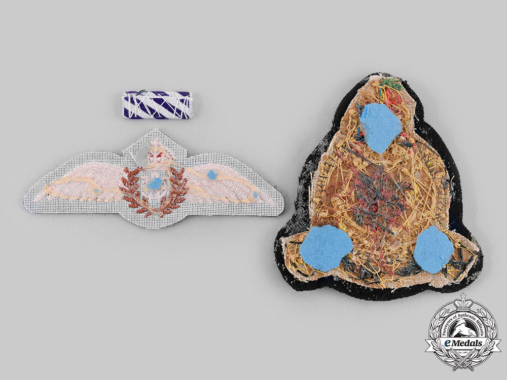 1939-1945 Star; Italy Star; Defence Medal; Canadian Volunteer Service Medal with Overseas Clasp; War Medal 1939-1945 with MID Oak Leaf; and Canadian Forces' Decoration with Ten Years' Additional Service Clasp, George VI (F/L D.C. MAHONEY). Naming is engraved on the reverse of the suspension on the CFD, the five Second War medals are un-named as issued. Court-mounted to a cardboard backer, with glue residue on the reverse from previous board mounting, contact marks, lightly soiled original ribbons, very fine. Accompanied by a Royal Canadian Air Force Pilot Badge (in red, white and brown embroidery, on a black wool base, white cotton mesh backer, measuring 120 mm (w) x 46 mm (h)); and a 18 Squadron, Royal Air Force Blazer Patch (in silvered and gold-coloured bullion wire, in various textures, maroon embroidery in the void of the Queen's crown, touches of red, green and blue embroidery in the base of the crown, the Pegasus in red embroidery, the centrepiece ring in light blue embroidery, the ribbon banner in yellow embroidery, black threading giving definition to the outline of the Pegasus and the text in the ribbon banner, on a black wool base, padded, hessian backer, measuring 95 mm (w) x 105 mm (h)); both of the badges with glue and paper residue evident on their reverses from previous board mounting.