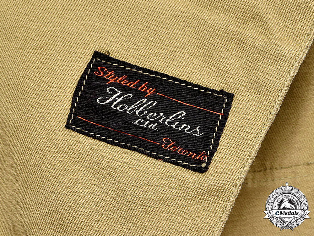 1. Tunic: exterior is fabricated from a thick khaki cotton, used by both the RCAF and the RAF in warmer climates. Both shoulders incorporate shoulder straps fed through two narrow bands protruding from the tunic, neither of which is secured in place by its button at the neck end, both straps with Squadron Leader rank stripes sewn in place, consisting of three stripes, each of which incorporates a light blue stripe flanked by wide black stripes on either side, the middle stripe of the three narrower in width. The front has four large pockets, one on each breast which have decorative straps giving them a pleated-look, the other two at the waist are without pleats and are larger and deeper than the breast pockets. All four pockets have fold over button down flaps with reinforced button holes, the breast pockets with dual snaps. Sewn in place above the left breast pocket is a Canadian Volunteer Service Medal Ribbon Bar. The front has four reinforced button holes on the left, the six small missing buttons, two on the shoulder straps and four on the pockets, along with the four large buttons at the opening of the tunic have been taken off the tunic and placed in a plastic bag accompanying it. The four large buttons and five of the small buttons are maker marked "Wm. SCULLY LTD. MONTREAL" on their reverses, the remaining small button maker marked "WATERBURY BUTTON CO. / MADE IN USA" on its reverse, each of which bears the crowned RCAF eagle insignia. In addition, the bag also houses four Medical Corps caduceus insignia. The belt is sewn in place to the body of the tunic at the rear, the left end with a large octagonal-shaped brass buckle with dual prongs, the buckle maker marked "RODEN BROS. Ltd." on the reverse, along with a snap closure receiver, the right end with two rows of three reinforced holes each for attachment to the buckle, along with a snap closure stud, ensuring a snug fit at the waist. The inside of the tunic is lined in the same thick cotton on the panels just inside the opening on both sides, the right panel with an embroidered manufacturer's label inscribed "Styled by Hobberlins Ltd. Toronto", the left panel with a faded cloth Hobberlins printed label, the last name "Kerwin" is slightly visible. The tunic measures 45 cm across the shoulders x 72 cm in length, the fabric free of mothing.