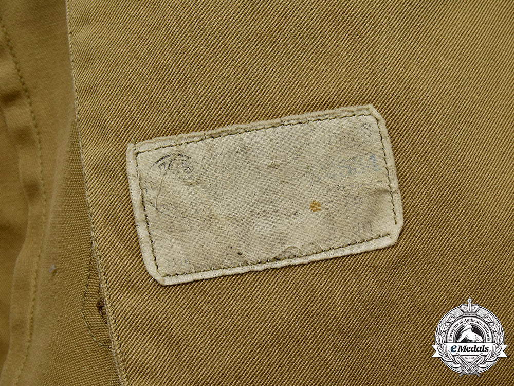 2. Two Pairs of Trousers: exterior on both pairs is fabricated from a thick khaki cotton, matching that of the tunic, designed with a zipper fly, the opening with two brown buttons on the right side, facing two reinforced button holes on the left side. Each has four pockets, consisting of two side-entry pockets, one on either side at the waist on the front, and two top-entry pockets, one on either side on the seat with a reinforced button hole and a brown button, each of the pockets lined in a thick white cotton. The left rear white cotton pocket on one pair is dual stamped in black ink "CO-280-2", the other pair without stampings. The waist has two greenish-brown plastic buttons sewn in place on either side of the seam, with seven belt loops sewn in place, five narrow ones spaced at various intervals, along with two very wide ones which are placed at the hips on either side. Both cuffs have been turned up and sewn in place. Inside, the waistband is in white rayon, with four white plastic buttons sewn in place. The trousers measure 70 cm at the waist x 98 cm in length, the pair with the black ink stampings exhibiting soiling on the exterior waistband at the rear, the other pair with black marks appearing on the inner left leg. As worn.