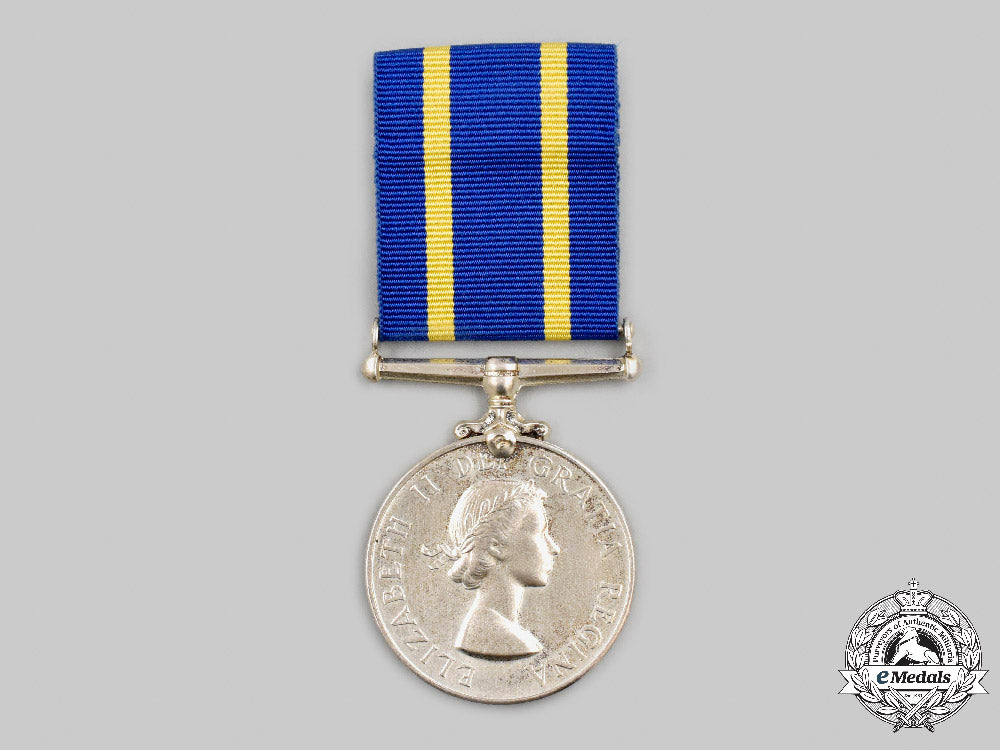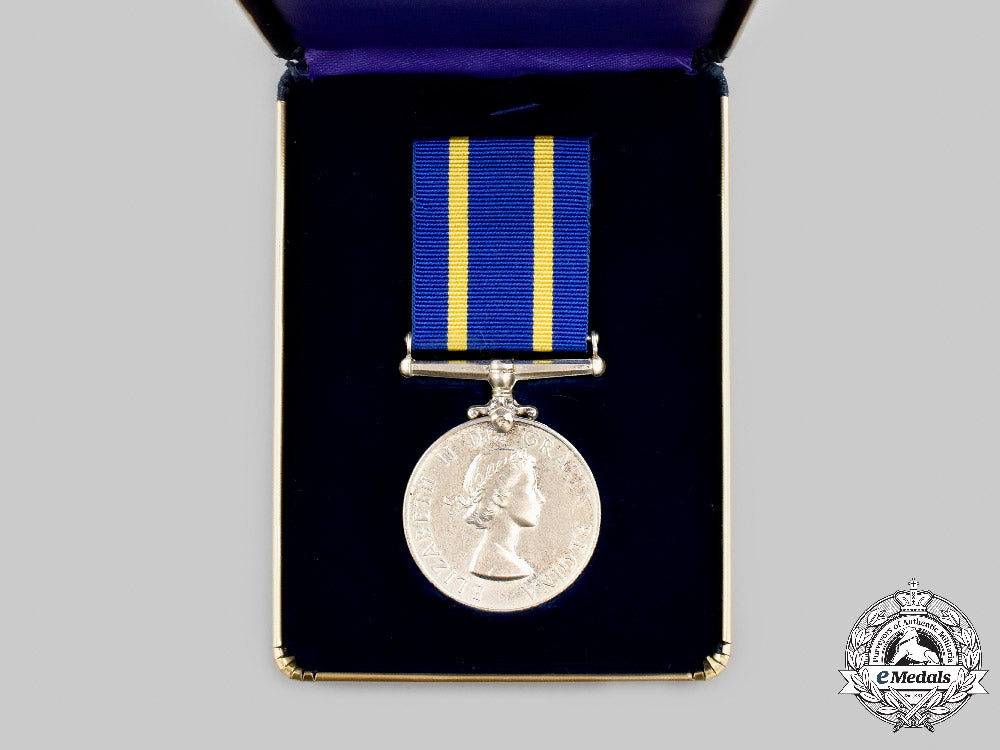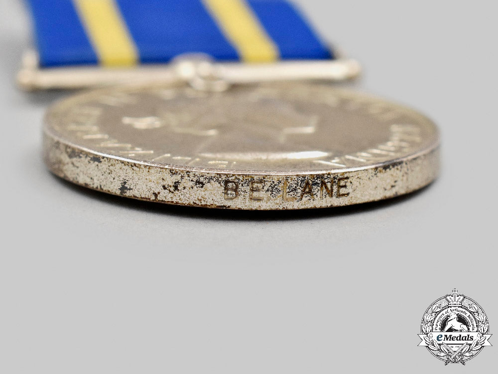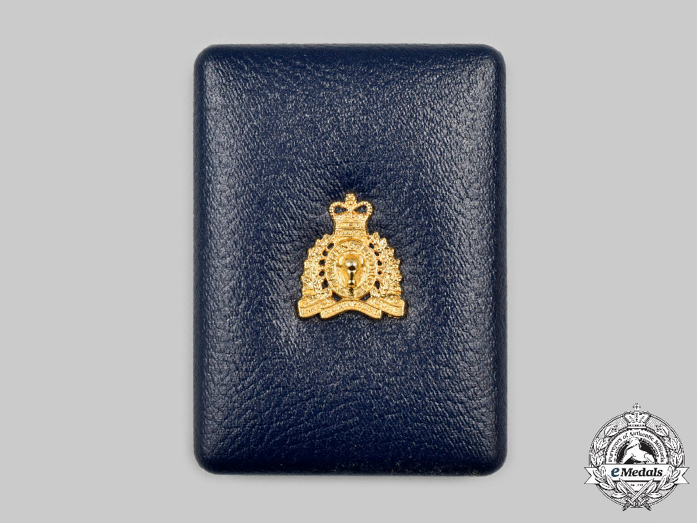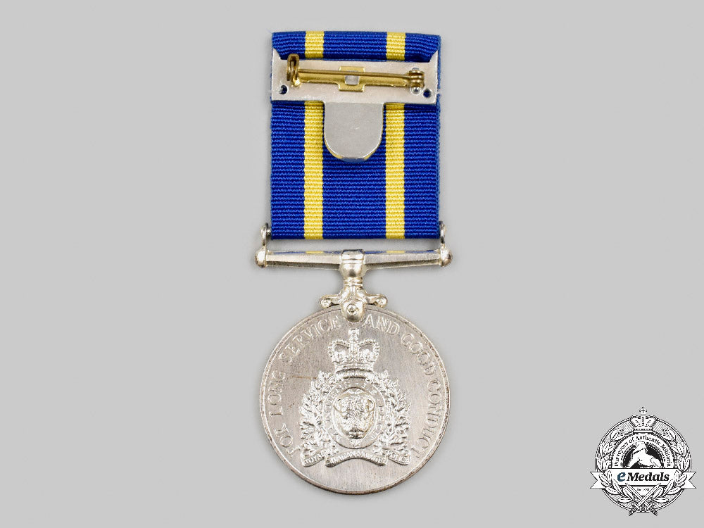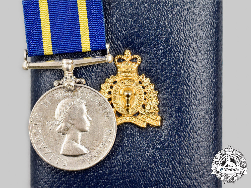 Elizabeth II (B.E. LANE). In silver, naming is engraved in capitals, measuring 36.5 mm in diameter, original ribbon suspended from a tab style hanger with horizontal pinback, scattered silvering wear evident on the edge and the raised rim on the reverse, contact mark on the reverse, near extremely fine. In its hardshelled case of issue, navy blue pebbled exterior, with a fire gilt Royal Canadian Mounted Police insignia affixed to the padded lid, inside lid lined in violet satin, recessed medal bed in navy blue felt, measuring 83 mm (w) x 115 mm (h) x 33 mm (d), case extremely fine.