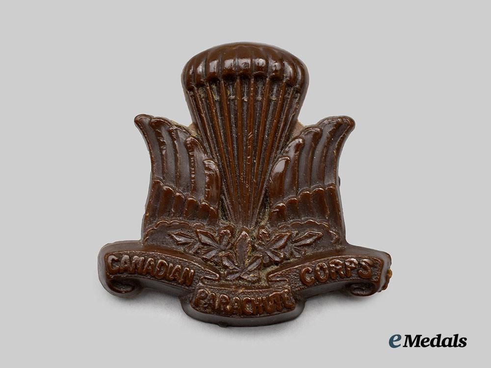 Constructed of brown bakelite, depicting a pair of wings joined together at the base via maple leaves with a parachute superimposed on the badge and “Canadian Parachute Corps” on a scroll underneath, the reverse with both bakelite lugs intact, complete with matching bakelite cotter pin, unmarked, hand inscribed “R.H” on the reverse with the last name stricken through and illegible, measuring 40.1 mm (w) x 39.2 mm (l), a scarce cap badge in extremely fine condition.